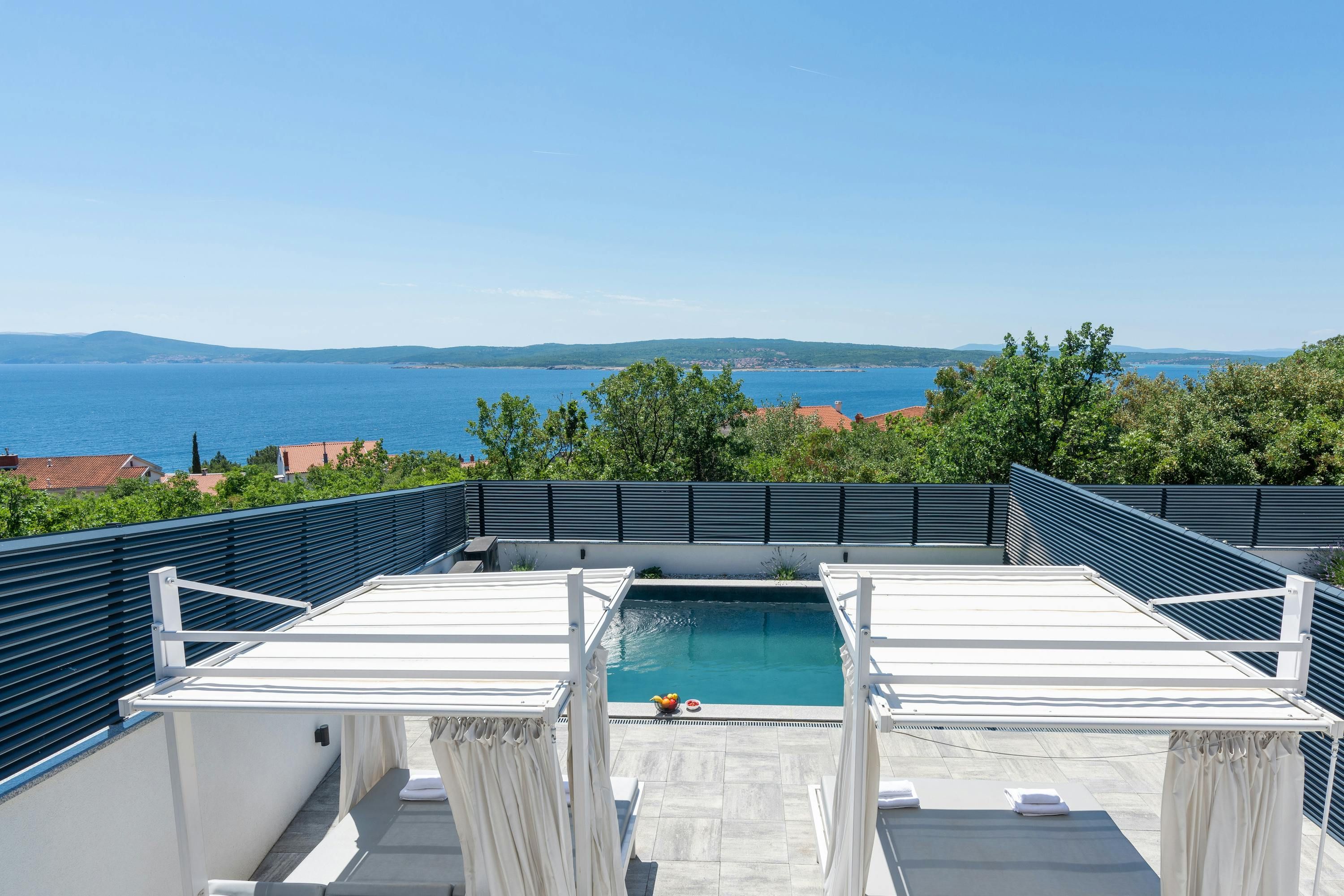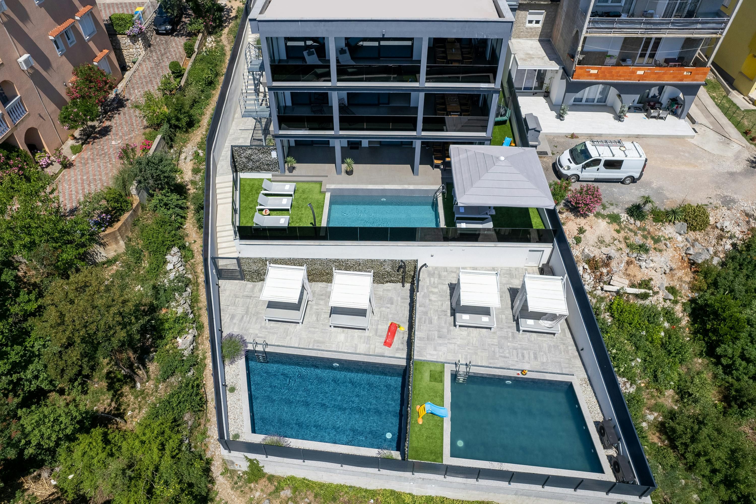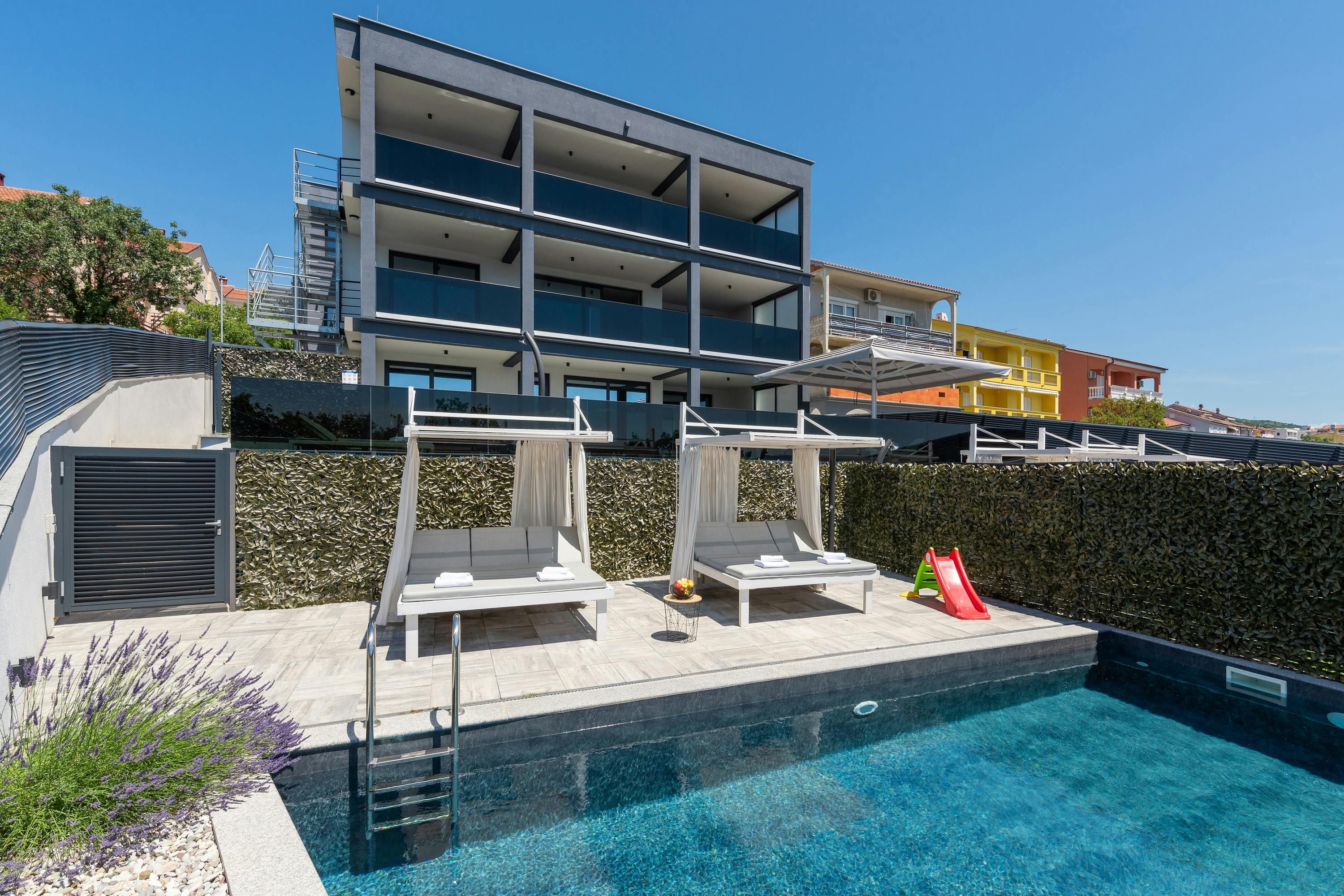 Set in the coastal town of Crikvenica, this townhouse is an ideal base for group stays. It's divided into three apartments across three floors, each with its own kitchen. All bedrooms have ensuites, plus with three heated pools, there’s plenty of space to spread out. The sandy beach is just a sixteen-minute stroll away, or you can simply enjoy the sea view from the multiple terraces and balconies. Local supermarkets and restaurants are easily accessible too, making this home as convenient as it is scenic.