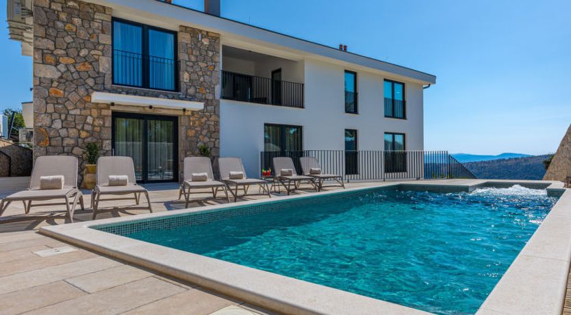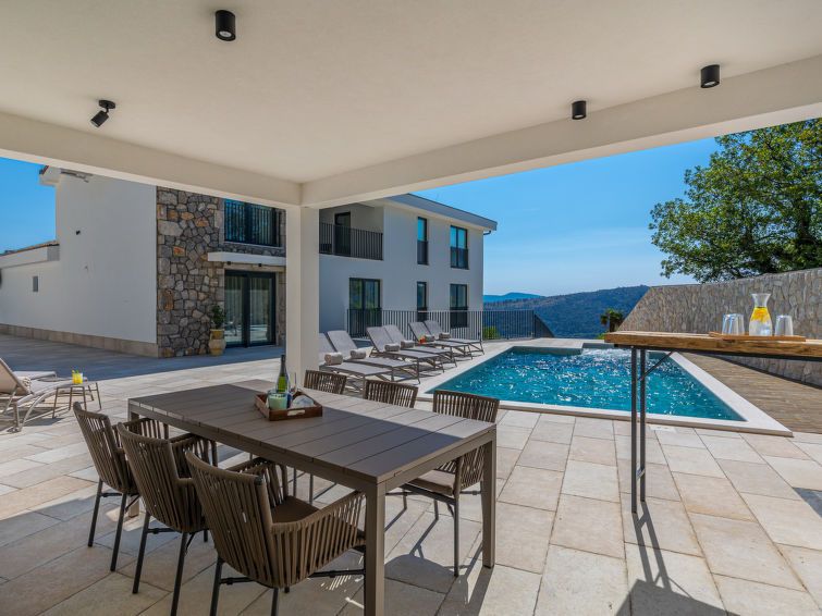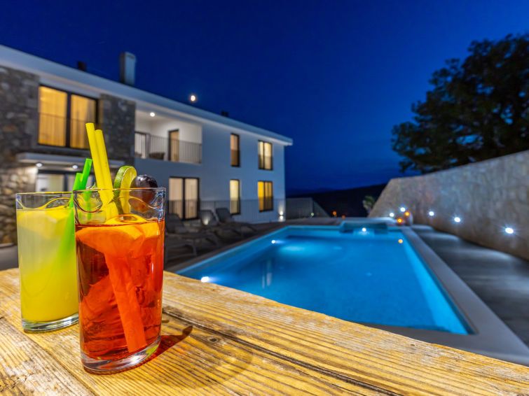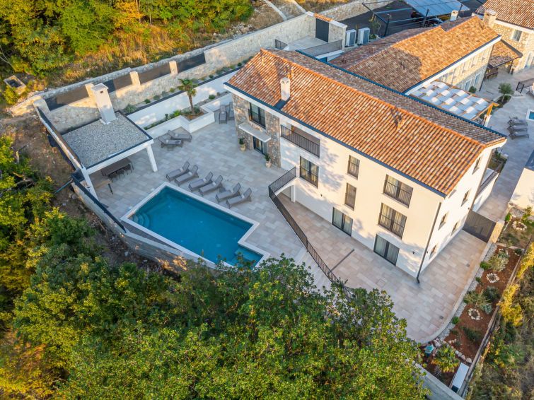 6-room villa 360 m2 on 3 levels. Living/dining room with open-hearth fireplace and satellite TV. Exit to the terrace, to the swimming pool. 1 room with 1 double bed (2 x 90 cm, length 200 cm), shower/WC. Open kitchen (oven, dishwasher, 4 ceramic glass hob hotplates, toaster, kettle, microwave, freezer, electric coffee machine).