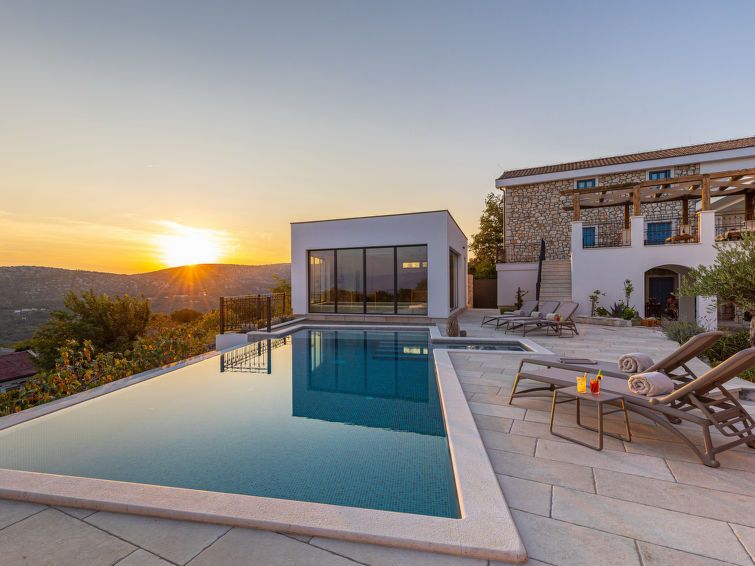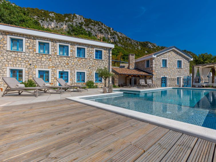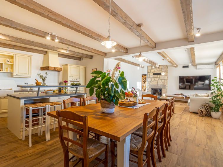6-room villa 360 m2 on 2 levels. Living/dining room with open-hearth fireplace and satellite TV. Exit to the terrace, to the swimming pool. Open kitchen (oven, dishwasher, 4 induction hot plates, toaster, kettle, microwave, freezer, electric coffee machine). Sep. WC. Wood heating, floor heating, forced-air heating.