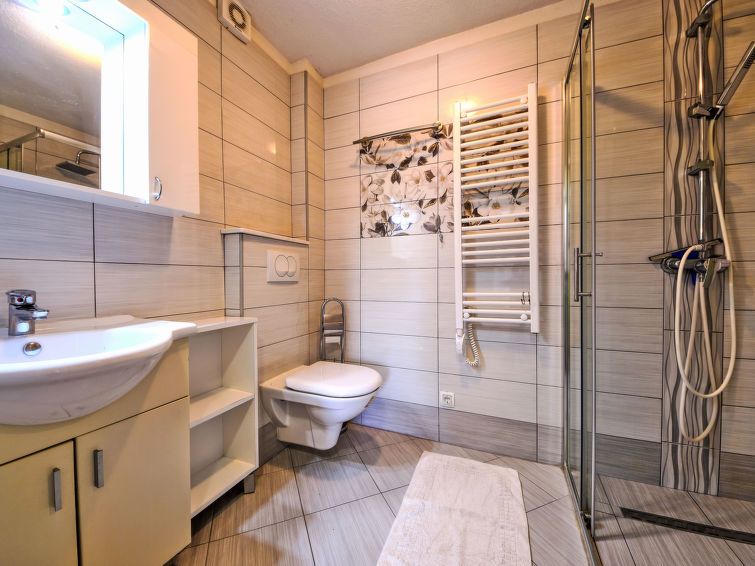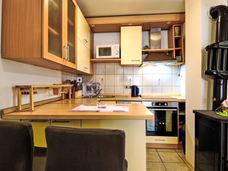 2-room apartment 32 m2, on the ground floor. Living/dining room with 1 double sofabed (2 x 70 cm, length 190 cm), digital TV and air conditioning. Exit to the terrace. 1 room with 1 french bed (160 cm, length 200 cm). Open kitchen (oven, dishwasher, 2 ceramic glass hob hotplates, kettle, microwave, freezer, electric coffee machine).