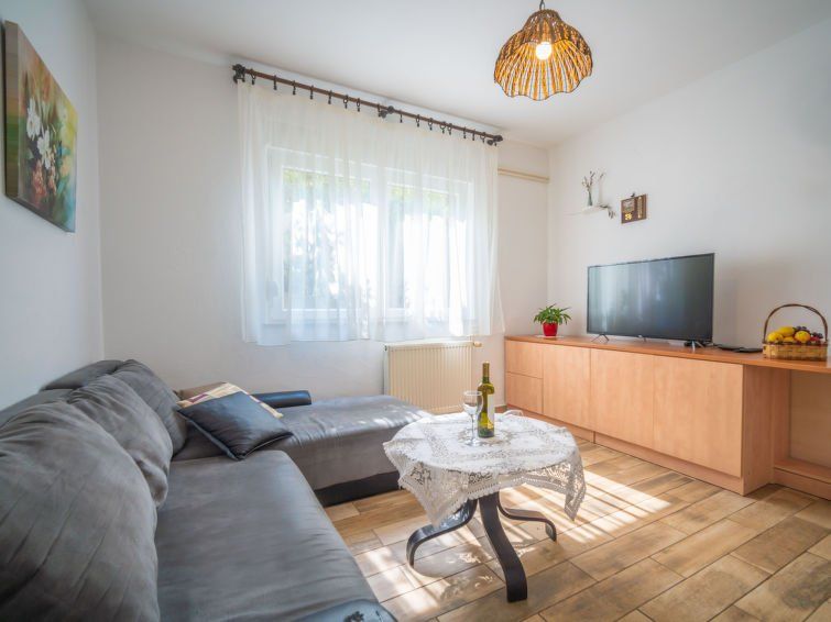 3-room apartment 50 m2, on the ground floor. Living/dining room 20 m2 with cable TV and flat screen. Exit to the terrace. Entrance hall with air conditioning. 1 room with 1 double bed (2 x 90 cm, length 190 cm). Exit to the balcony. 1 room with 1 double bed (2 x 90 cm, length 200 cm).