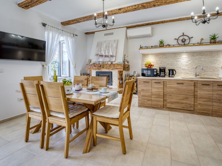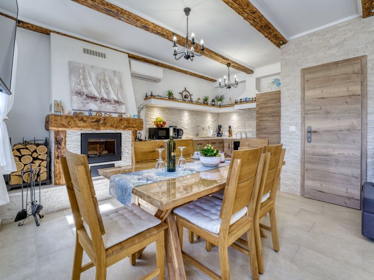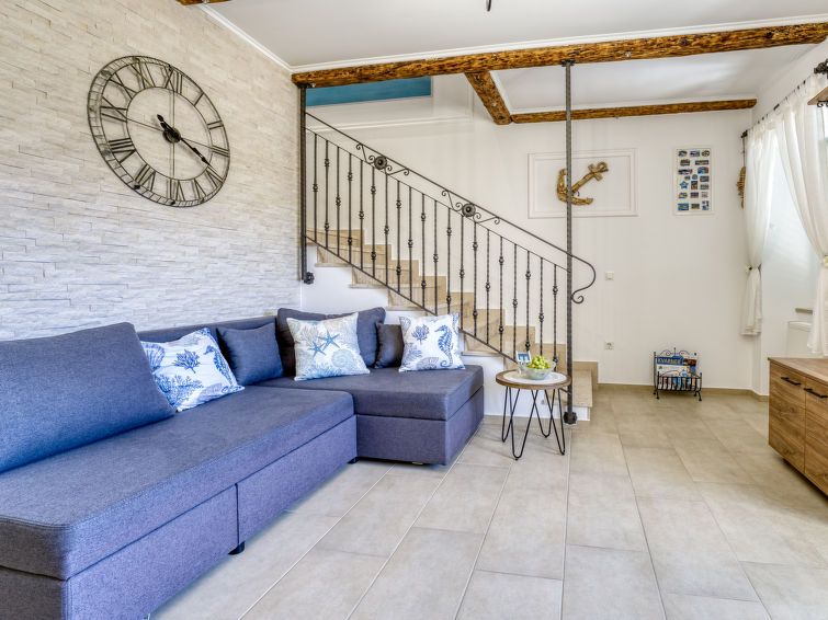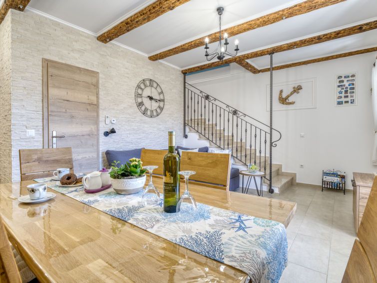 3-room house 95 m2 on 2 levels. Fully renovated in 2024: living/dining room with 1 sofabed (90 cm, length 200 cm), open-hearth fireplace (only for decoration), dining table, cable TV and air conditioning. Open kitchen (oven, dishwasher, 2 induction hot plates, toaster, kettle, microwave, freezer, electric coffee machine).