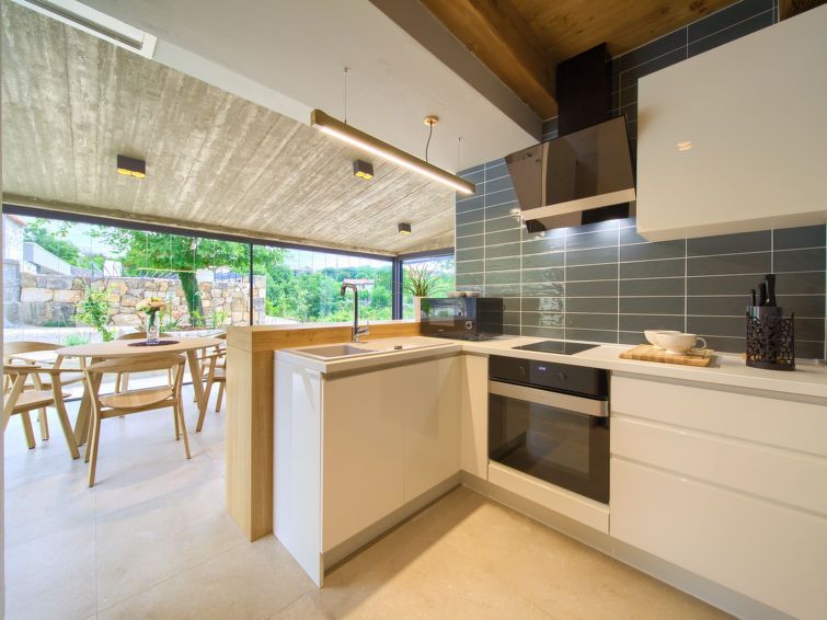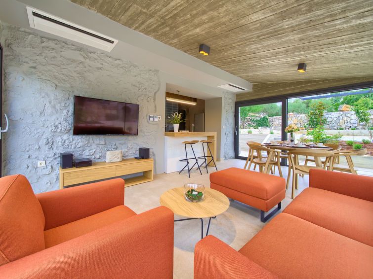 3-room house 100 m2 on 2 levels. Comfortable and luxurious furnishings: living/dining room with satellite TV. Exit to the terrace. 1 room with 1 bed (80 cm, length 190 cm), 1 double bed (2 x 80 cm, length 200 cm), shower/WC and satellite TV. Open kitchen (oven, dishwasher, 4 ceramic glass hob hotplates, kettle, microwave, freezer, electric coffee machine).