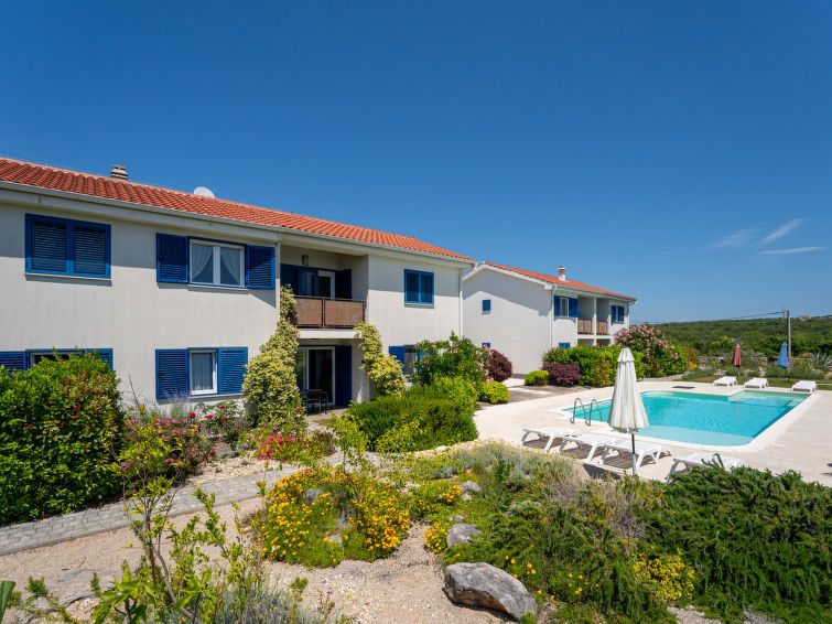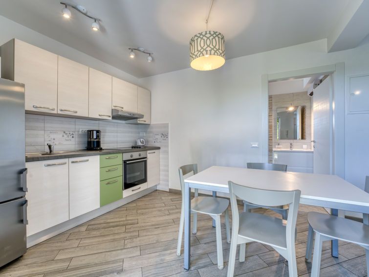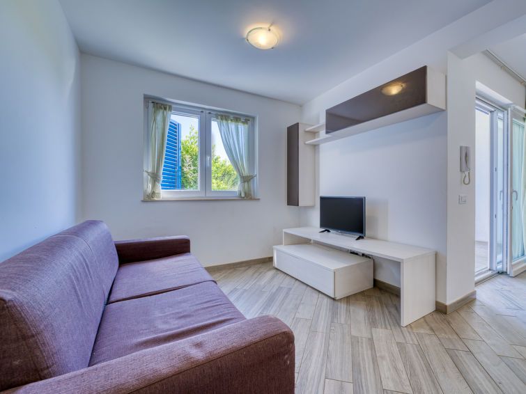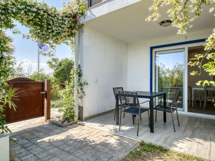 2-room apartment 40 m2, on the ground floor. Living/dining room with 1 sofabed (120 cm, length 200 cm), satellite TV and air conditioning. Exit to the terrace. 1 room with 1 bed (90 cm, length 200 cm), 1 french bed (160 cm, length 200 cm), air conditioning. Open kitchen (oven, 4 ceramic glass hob hotplates, toaster, kettle, microwave, freezer, electric coffee machine).