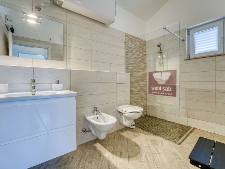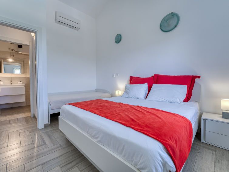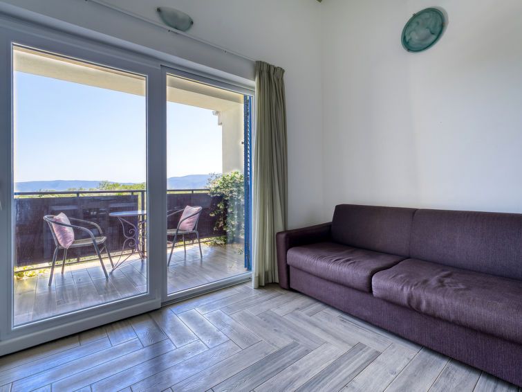 2-room apartment 40 m2 on 1st floor. Living/dining room with 1 sofabed (120 cm, length 200 cm), satellite TV and air conditioning. Exit to the balcony. 1 room with 1 bed (90 cm, length 200 cm), 1 french bed (160 cm, length 200 cm), air conditioning. Open kitchen (oven, 4 ceramic glass hob hotplates, toaster, kettle, microwave, freezer, electric coffee machine).