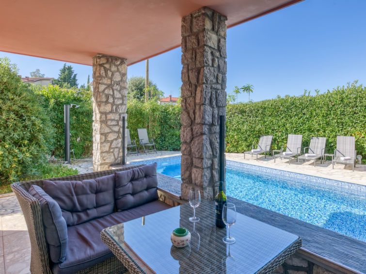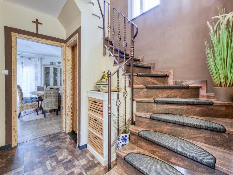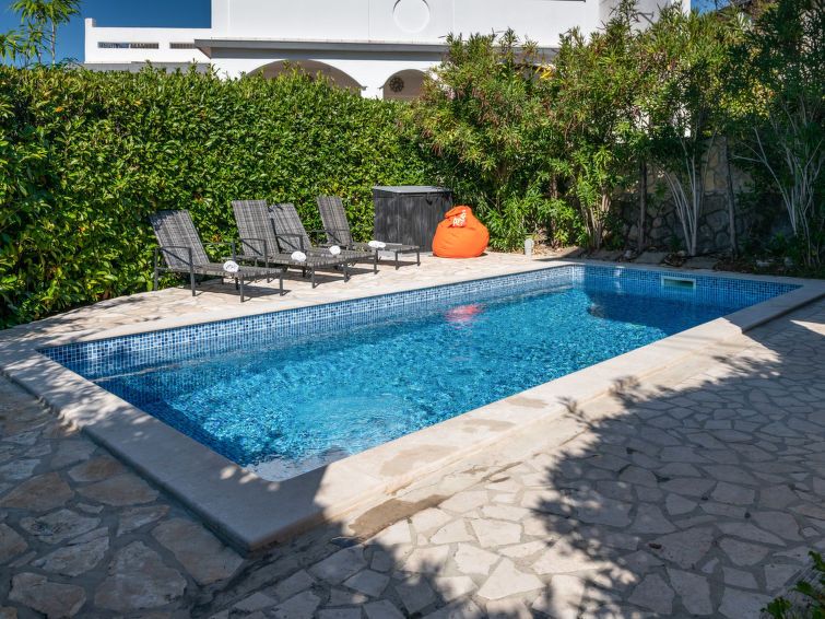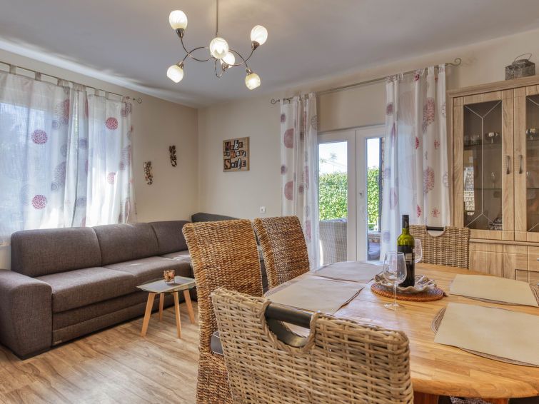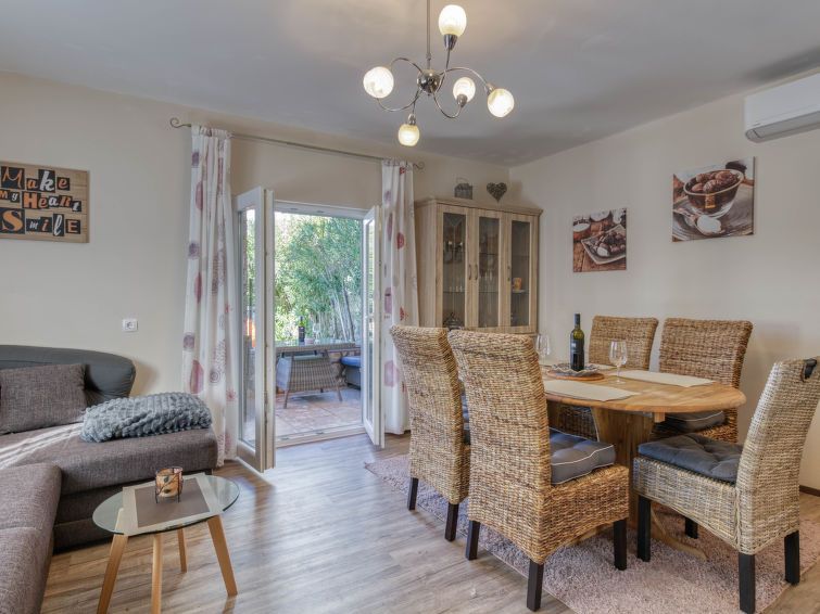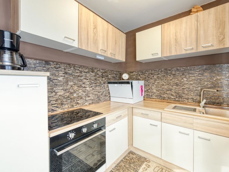 4-room house 128 m2 on 2 levels. Living/dining room with satellite TV and wood-burning stove. Exit to the terrace, to the swimming pool. Open kitchen (oven, dishwasher, 4 ceramic glass hob hotplates, toaster, kettle, electric coffee machine). Shower, sep. WC. Wood heating. Upper floor: entrance hall with air conditioning.