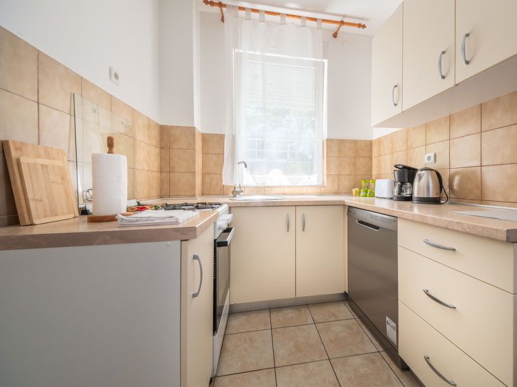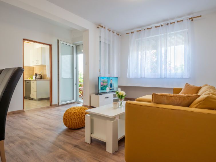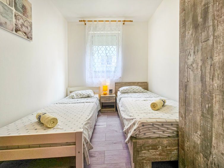3-room apartment 68 m2, on the ground floor, south-west facing position. Partly renovated in 2024: living/dining room with cable TV, digital TV and air conditioning. Exit to the terrace. 1 room with 1 double bed (2 x 90 cm, length 200 cm). 1 room with 2 beds (80 cm, length 200 cm).