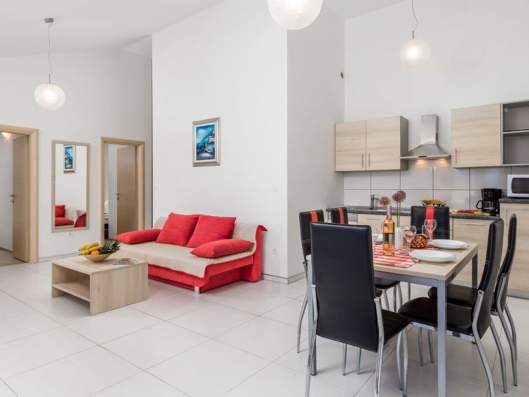3-room apartment 51 m2, on the ground floor, north facing position. Living/dining room 33 m2 with 1 sofabed, satellite TV and air conditioning. Exit to the terrace. 2 rooms, each room with 1 double bed (2 x 80 cm, length 200 cm). Open kitchen (dishwasher, 4 ceramic glass hob hotplates, microwave, electric coffee machine).