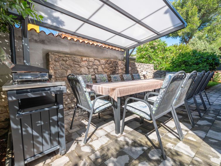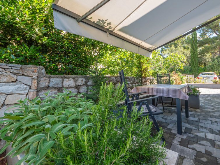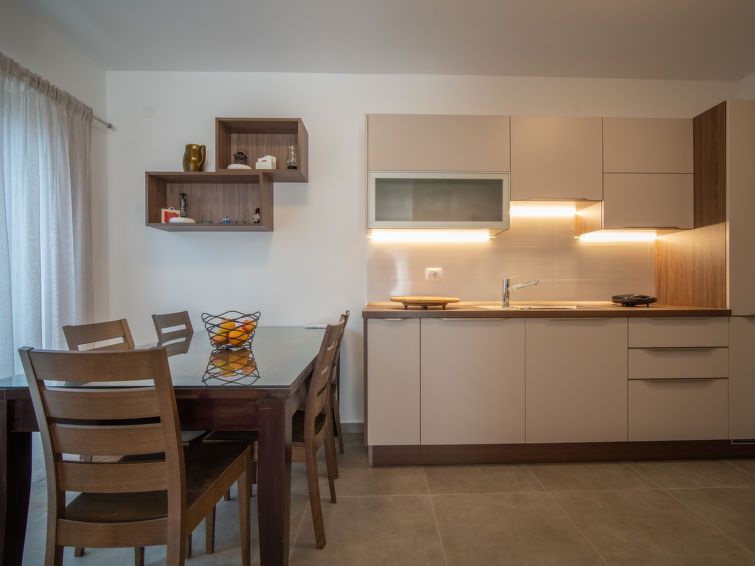 4-room apartment 100 m2, on the ground floor. Comfortable and beautiful furnishings: living/dining room with cable TV and air conditioning. Exit to the terrace. 1 room with 1 french bed (160 cm, length 200 cm). 1 room with 2 beds (90 cm, length 200 cm). Studio with 1 bed (90 cm, length 200 cm), 1 pull-out bed (length 200 cm), shower/WC, TV and air conditioning.