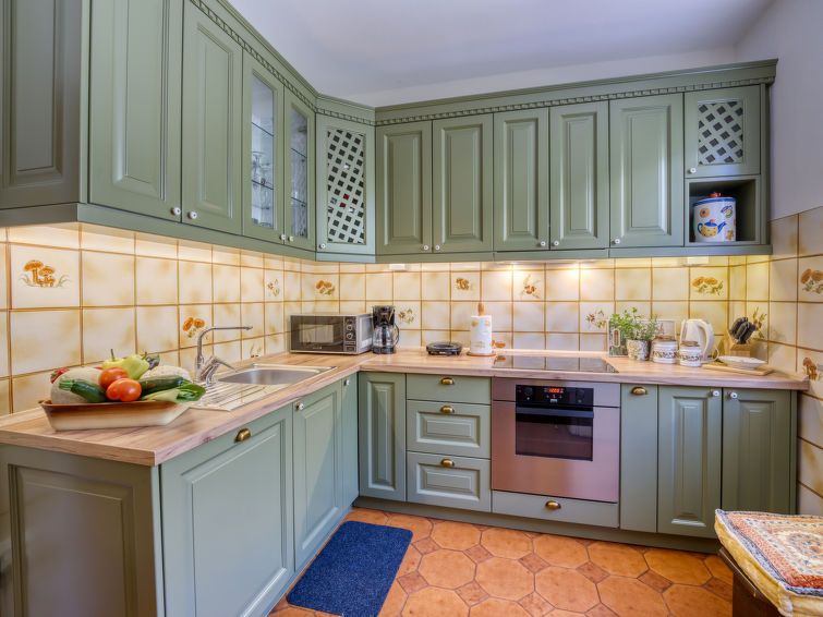 3-room apartment 115 m2 on 1st floor. Rustic furnishings: living room 25 m2 with satellite TV and air conditioning. Exit to the balcony. 1 room with 1 double bed (180 cm, length 200 cm). Exit to the balcony. 1 room with 1 double bed (195 cm, length 165 cm). Exit to the balcony. Dining room.