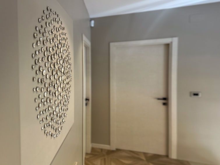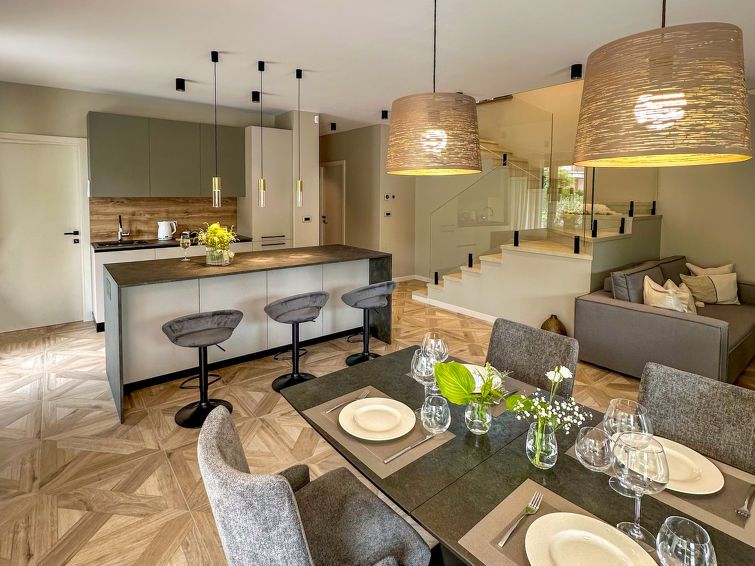 5-room villa 190 m2 on 2 levels, south facing position. Beautiful and modern furnishings: living/dining room 50 m2 with panoramic window with satellite TV. Exit to the terrace, to the swimming pool. Luggage room. Open kitchen (oven, dishwasher, 2 induction hot plates, kettle, microwave, freezer).