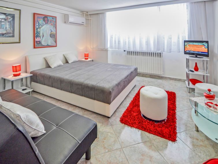 1-room apartment 34 m2, on the ground floor, south facing position. Living/sleeping room with 1 sofabed and 1 french bed (160 cm, length 200 cm), TV (flat screen), air conditioning. Dining room. Open kitchen (4 hot plates, oven, microwave, electric coffee machine). Shower/bidet/WC.