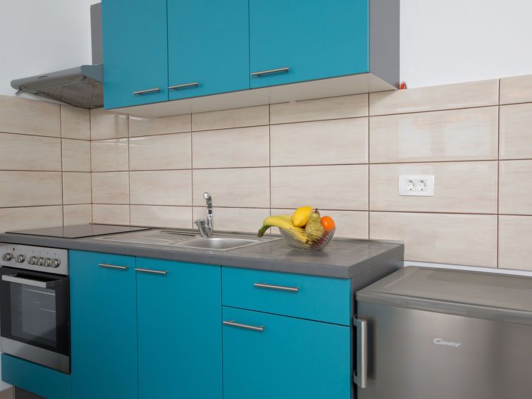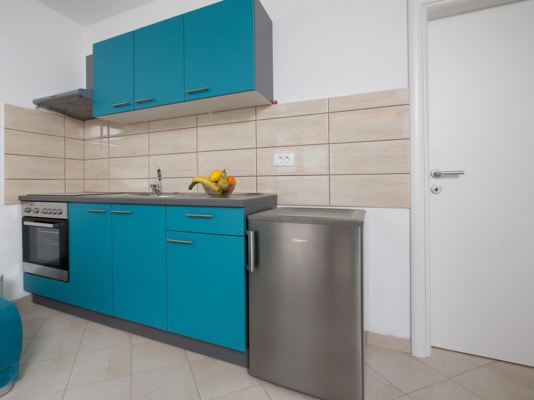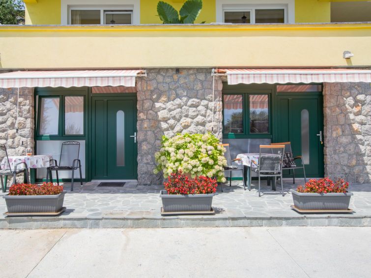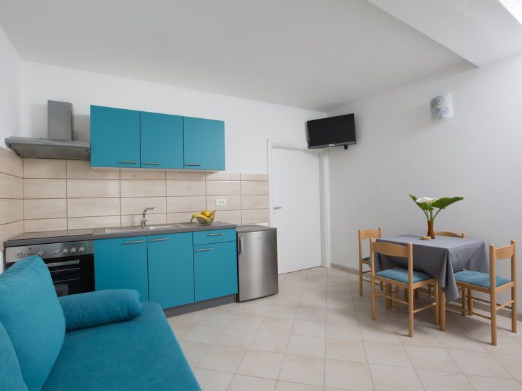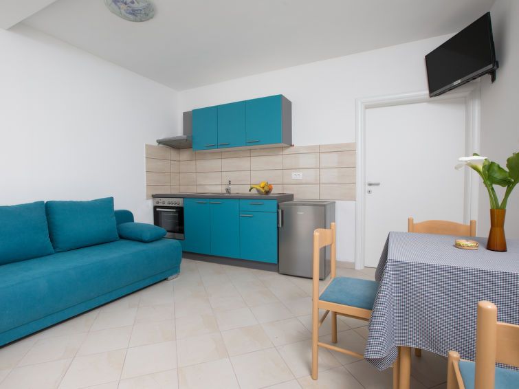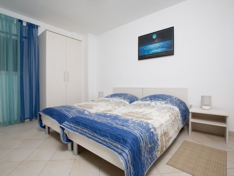 2-room apartment 38 m2, on the ground floor. Living/dining room with 1 sofabed (100 cm, length 195 cm), air conditioning. Exit to the terrace. 1 room with 2 beds (90 cm, length 200 cm). Open kitchen (oven, 4 ceramic glass hob hotplates, toaster, kettle, electric coffee machine). Shower/WC.