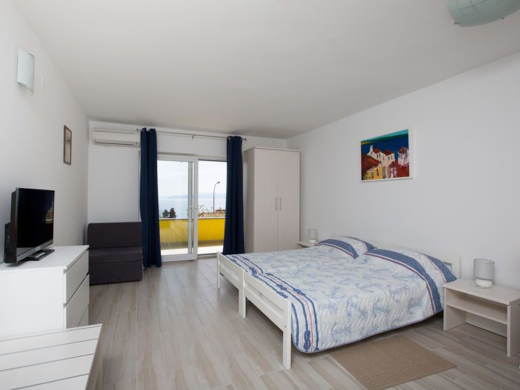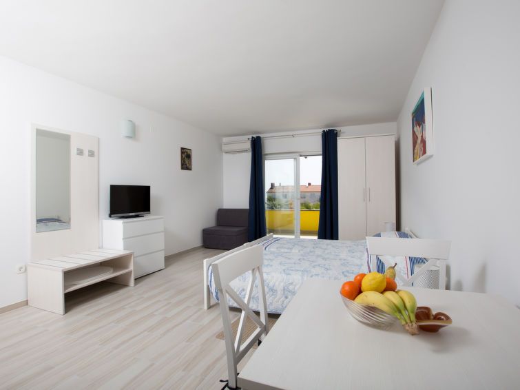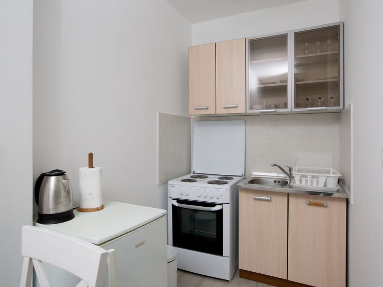 1-room apartment 30 m2 on 1st floor. Studio with 2 beds (90 cm, length 200 cm), satellite TV and air conditioning. Exit to the balcony. Kitchenette (oven, 4 ceramic glass hob hotplates, toaster, kettle, electric coffee machine). Shower/WC. Forced-air heating. Balcony 14 m2. Balcony furniture.