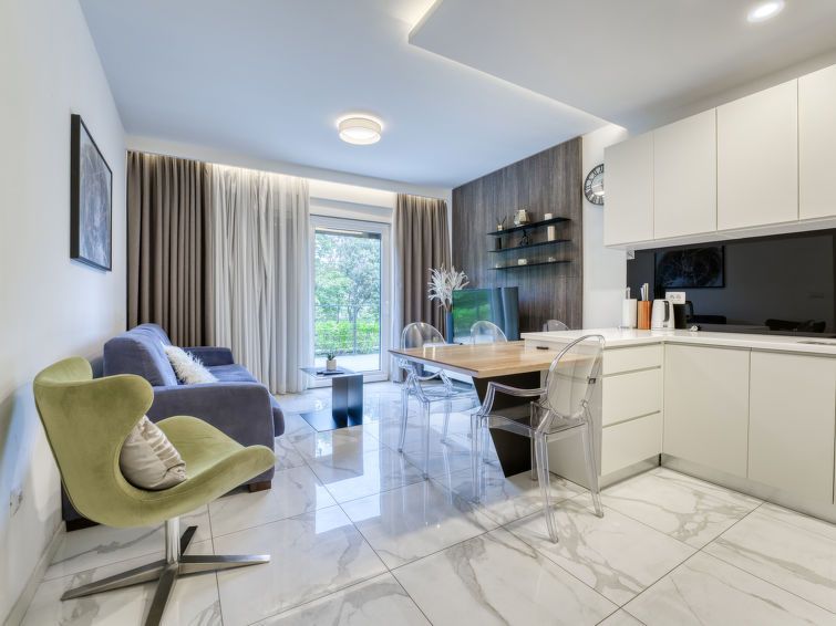 2-room apartment 36 m2, on the ground floor. Modern furnishings: living/dining room with 1 double sofabed (160 cm, length 200 cm), cable TV (flat screen), air conditioning. Exit to the terrace. 1 room with 1 french bed (160 cm, length 200 cm), satellite TV (flat screen), air conditioning.
