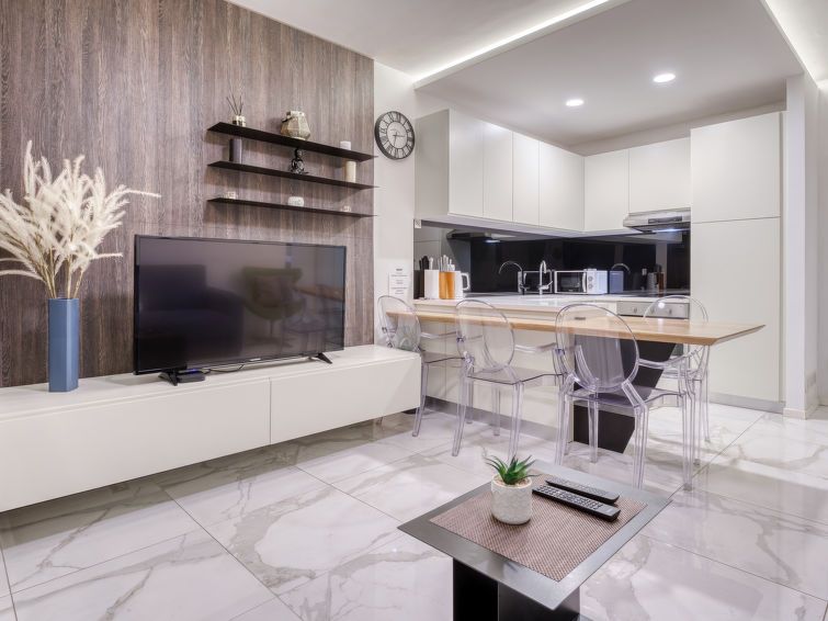 2-room apartment 36 m2 on 1st floor. Modern furnishings: living/dining room with 1 double sofabed (160 cm, length 200 cm), cable TV (flat screen), air conditioning. 1 room with 1 french bed (160 cm, length 200 cm), satellite TV (flat screen), air conditioning. Open kitchen (oven, dishwasher, 4 ceramic glass hob hotplates, kettle, microwave).