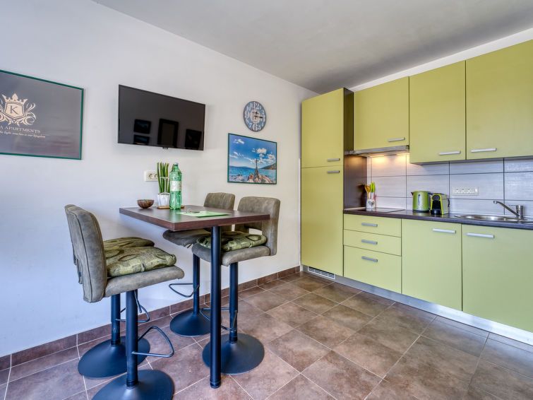 2-room apartment 44 m2, on the ground floor. Living/dining room with satellite TV (flat screen), air conditioning. Exit to the terrace. 1 room with 1 french bed (180 cm, length 200 cm). Open kitchen (2 induction hot plates, toaster, kettle, microwave, freezer, electric coffee machine).