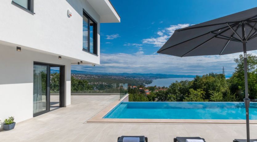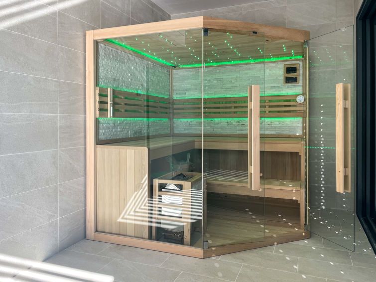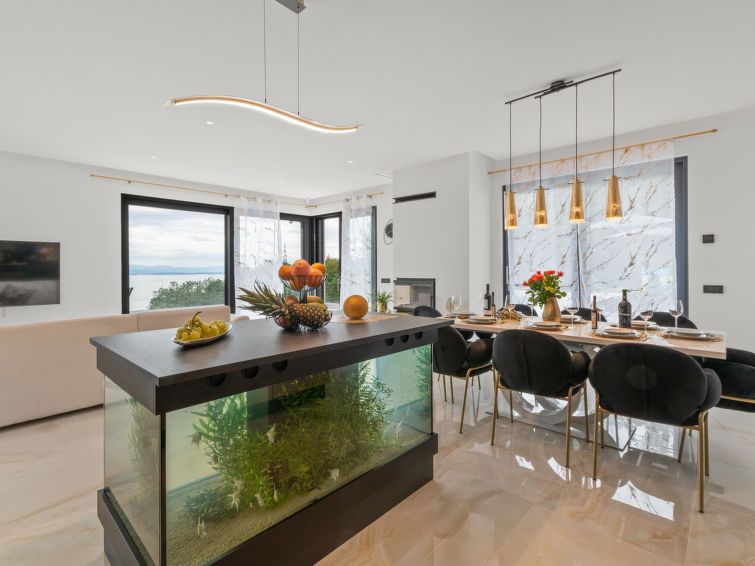 5-room villa 340 m2 on 2 levels, south facing position. Beautiful and modern furnishings: large living/dining room 70 m2 with panoramic window with 2 sofabeds (90 cm, length 200 cm), open-hearth fireplace (only for decoration), satellite TV (flat screen). Exit to the terrace, to the swimming pool.