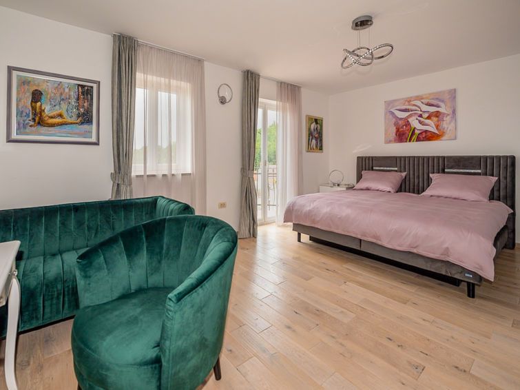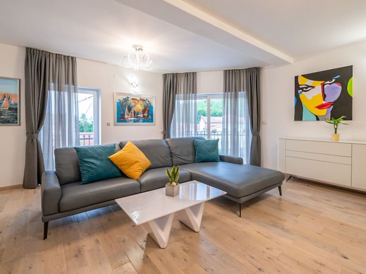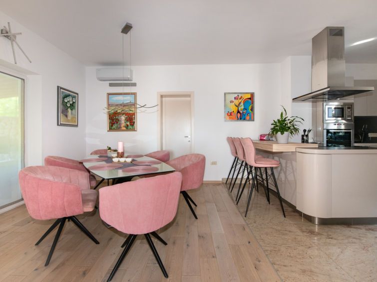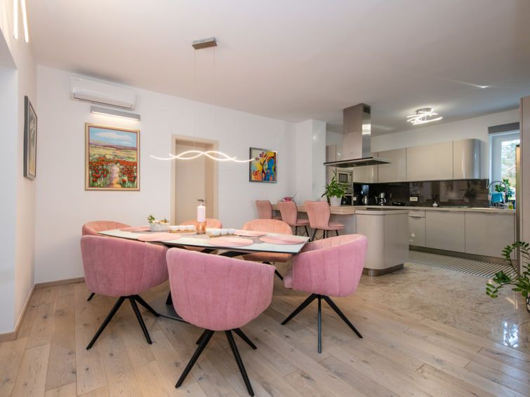 6-room house 300 m2 on 3 levels. Modern furnishings: large living room with open-hearth fireplace, cable TV and air conditioning. Exit to the balcony, to the terrace. Large, open kitchen (oven, dishwasher, 4 induction hot plates, toaster, kettle, microwave, freezer, electric coffee machine) with dining table, air conditioning.