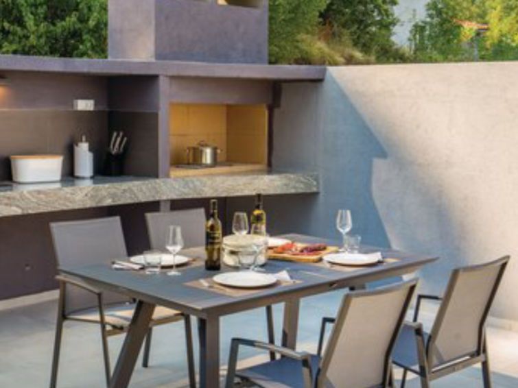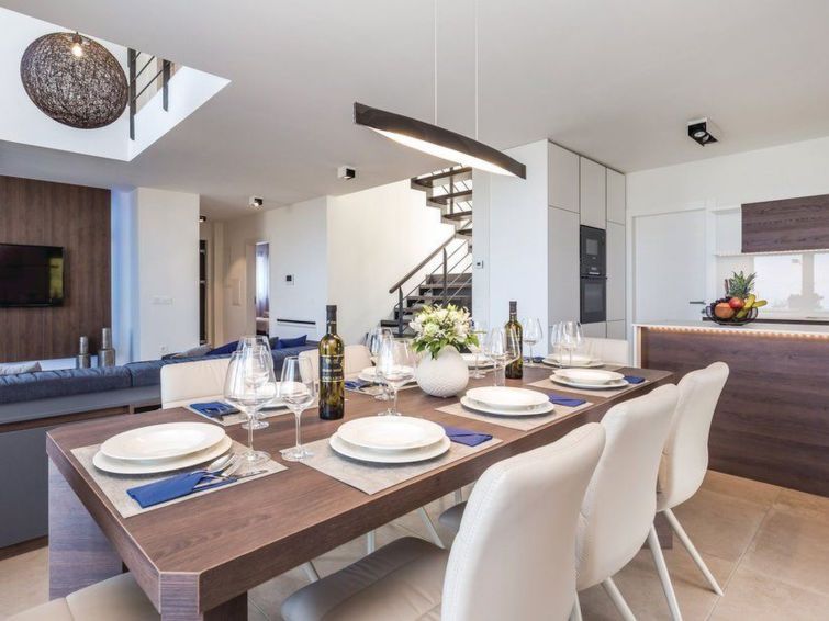 5-room villa 150 m2 on 2 levels, south facing position. Beautiful and modern furnishings: large living/dining room with panoramic window with satellite TV (flat screen). Exit to the terrace, to the swimming pool. 1 room with 2 beds (90 cm, length 200 cm), shower/WC and satellite TV (flat screen).