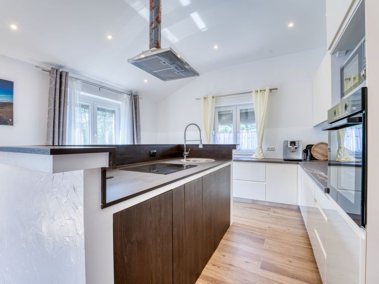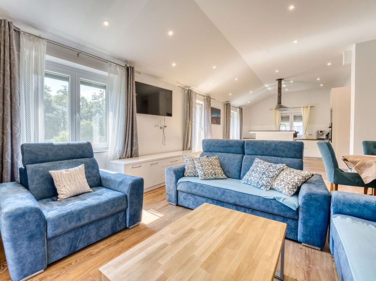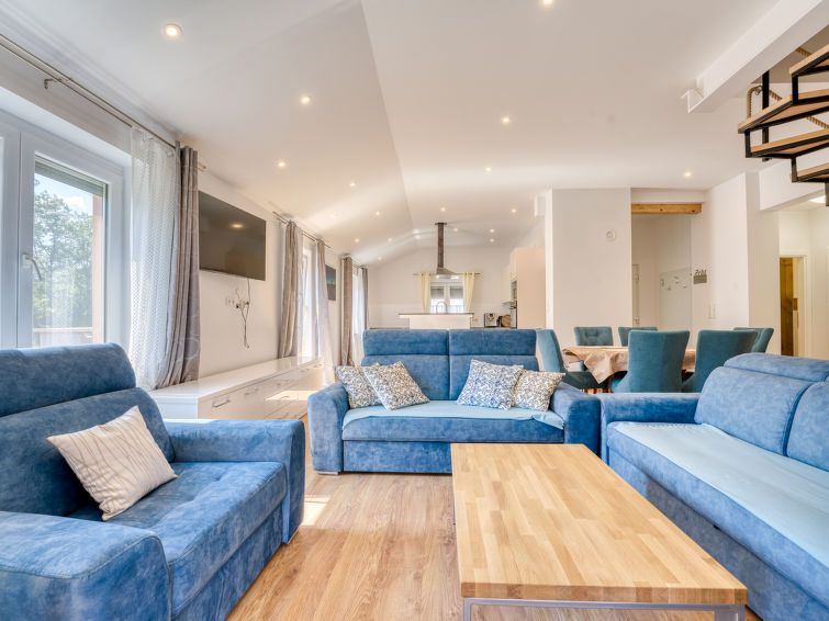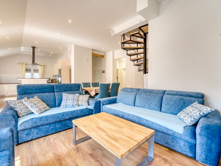 4-room apartment 115 m2 on 2 levels on 2nd floor. Modern furnishings: living/dining room with cable TV and air conditioning. Exit to the terrace. 2 rooms, each room with 1 french bed (160 cm, length 200 cm). Open kitchen (oven, dishwasher, 4 ceramic glass hob hotplates, kettle, microwave, freezer, electric coffee machine).