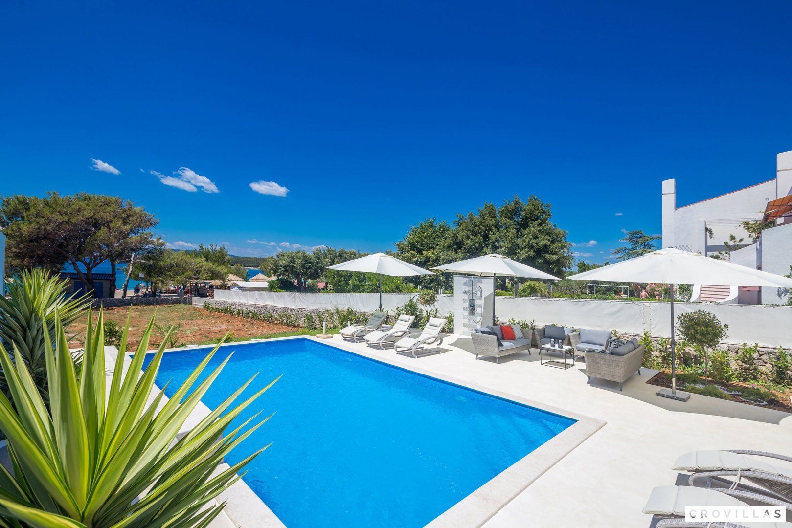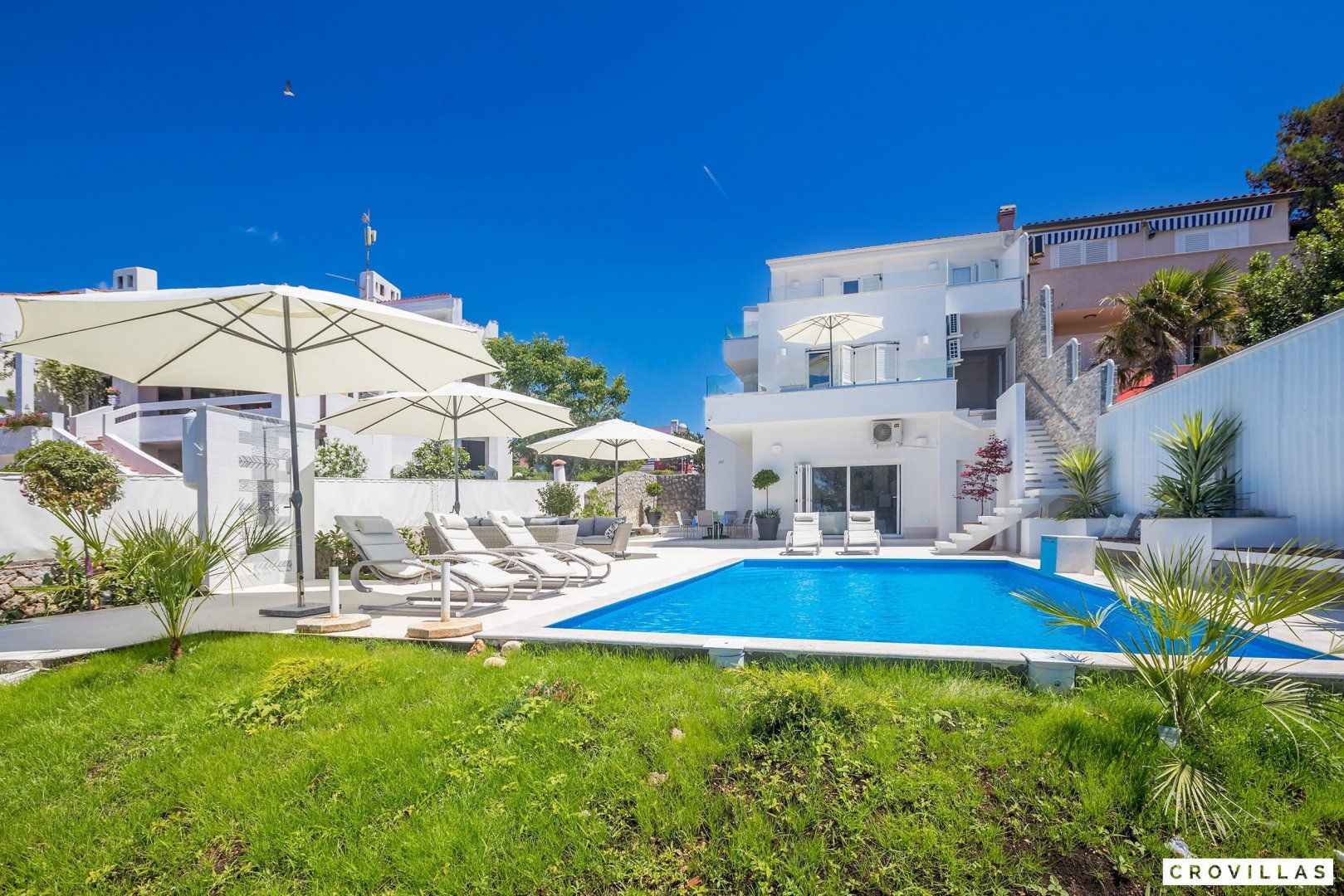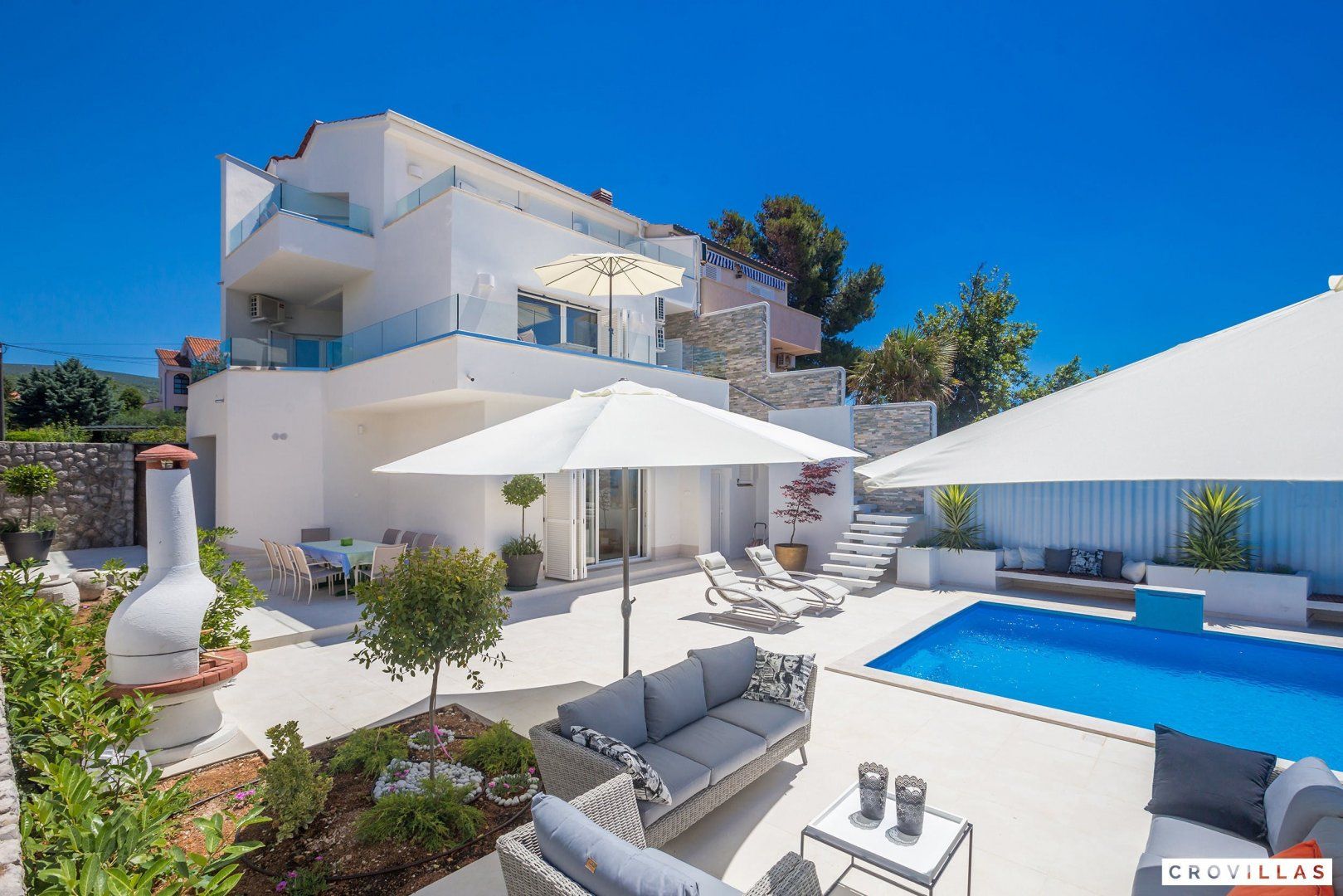 This stunning Croatian villa promises an unforgettable vacation with its breathtaking location and spectacular views. The property boasts modern amenities and top-notch furnishings for a comfortable and luxurious stay. With direct beach access from the garden, this is the perfect spot for a beach vacation with loved ones. The neighbouring aqua park with water slides is popular with younger guests, while adults can enjoy the beach bar located just in front of the home. The shallow entrance, gravel, and available sun loungers make the beach ideal for extensive beach days. Traditional restaurants along the small promenade to the centre of Punat offer a view of the harbour. Supermarkets are easily accessible on foot for extensive barbecue evenings. The island of Krk is conveniently accessible via a bridge, as is the nearest international airport of Rijeka (RJK), which is only 33 km away.