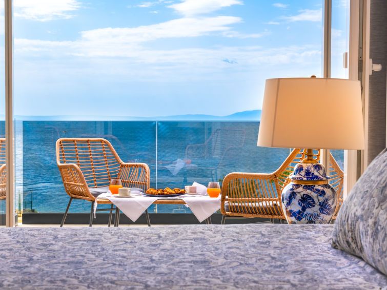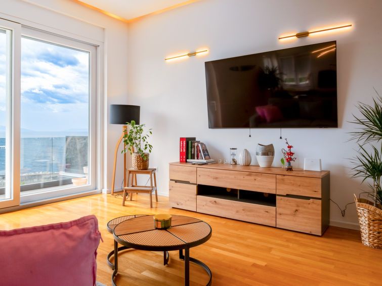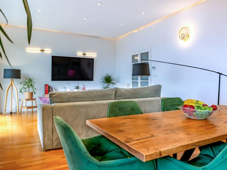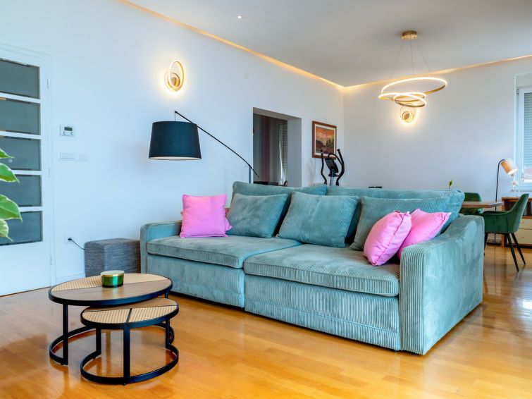 3-room apartment 110 m2, on the ground floor. Fully renovated in 2024, modern furnishings: living/dining room with 1 sofabed (120 cm, length 240 cm), satellite TV (flat screen). Exit to the balcony. Entrance hall with air conditioning. 1 room with 2 beds (80 cm, length 200 cm). 1 room with 1 french bed (180 cm, length 200 cm).