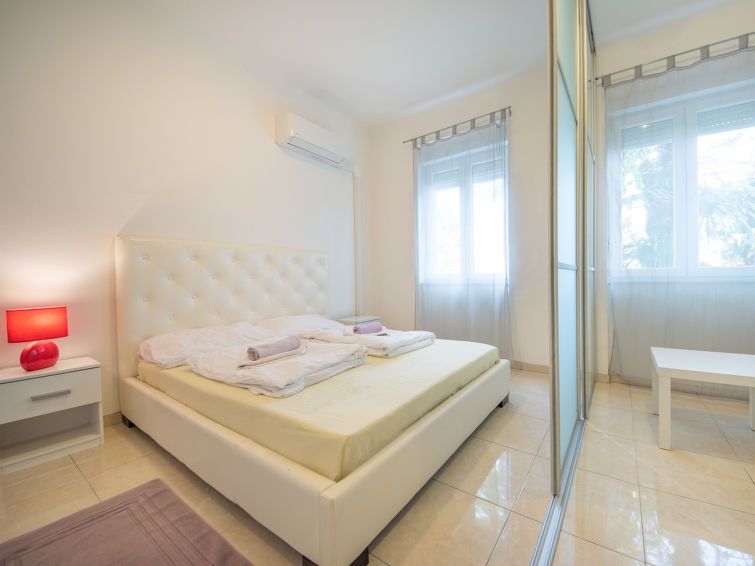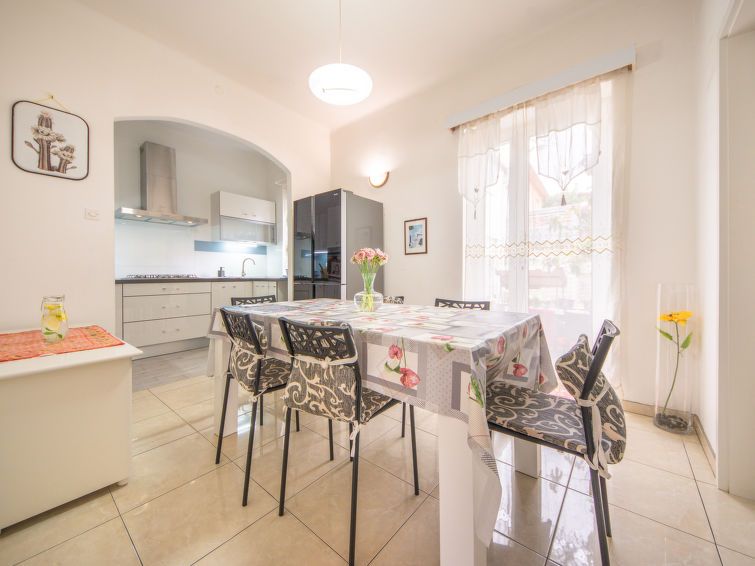 3-room apartment 90 m2, on the ground floor. Spacious: living/dining room with 1 bed (90 cm, length 200 cm), digital TV and air conditioning. Exit to the terrace. 1 room with 1 double bed (160 cm, length 200 cm), air conditioning. 1 room with 2 beds (90 cm, length 200 cm). Kitchen (oven, dishwasher, 5 gas rings, freezer, electric coffee machine).