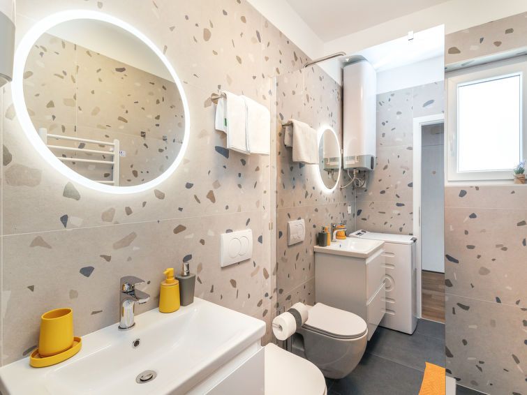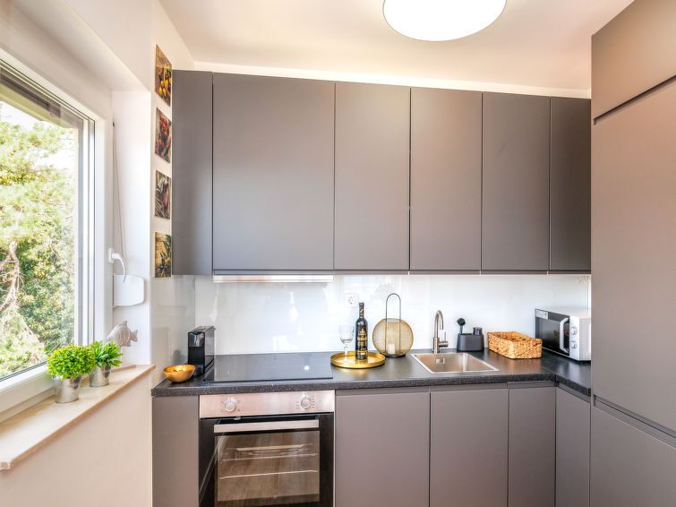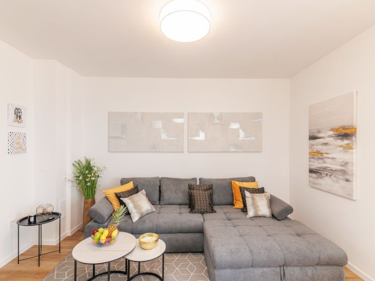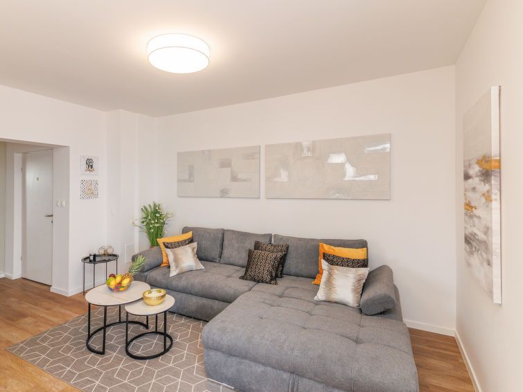 3-room apartment 54 m2 on 3rd floor. Living/dining room with satellite TV and air conditioning. Exit to the terrace. 1 room with 2 beds (80 cm, length 180 cm), satellite TV. 1 room with 1 french bed (170 cm, length 190 cm), satellite TV. Open kitchen (oven, dishwasher, 4 induction hot plates, toaster, kettle, microwave, freezer, electric coffee machine).