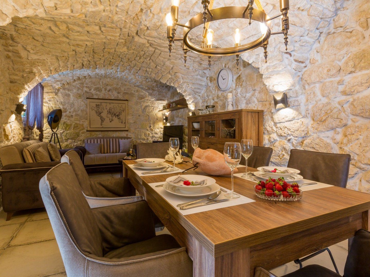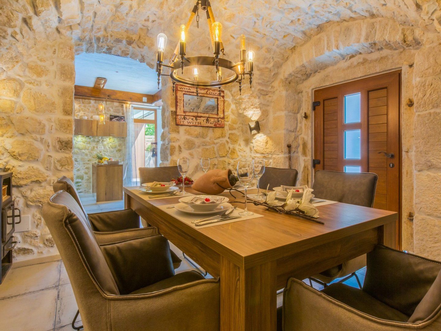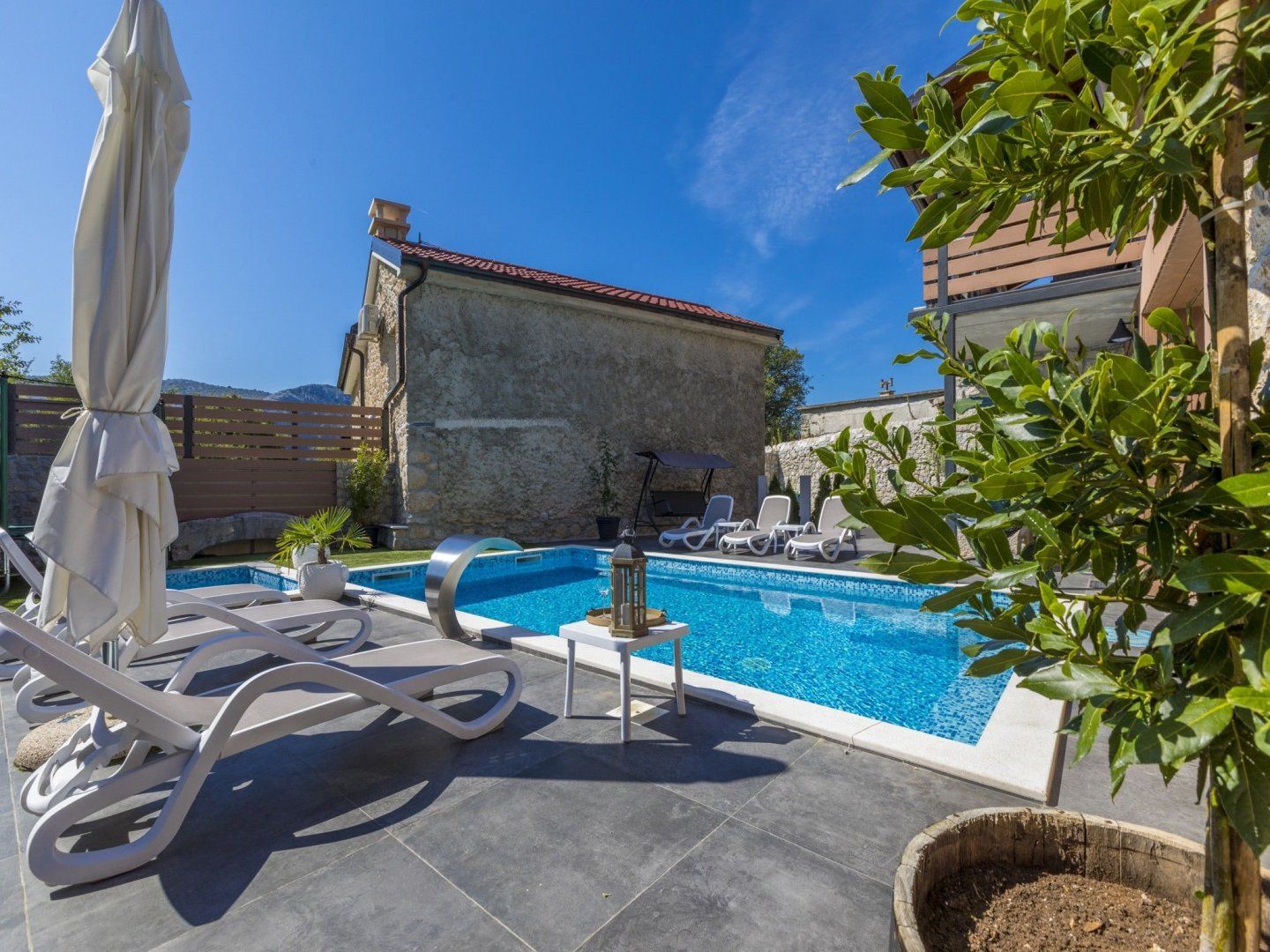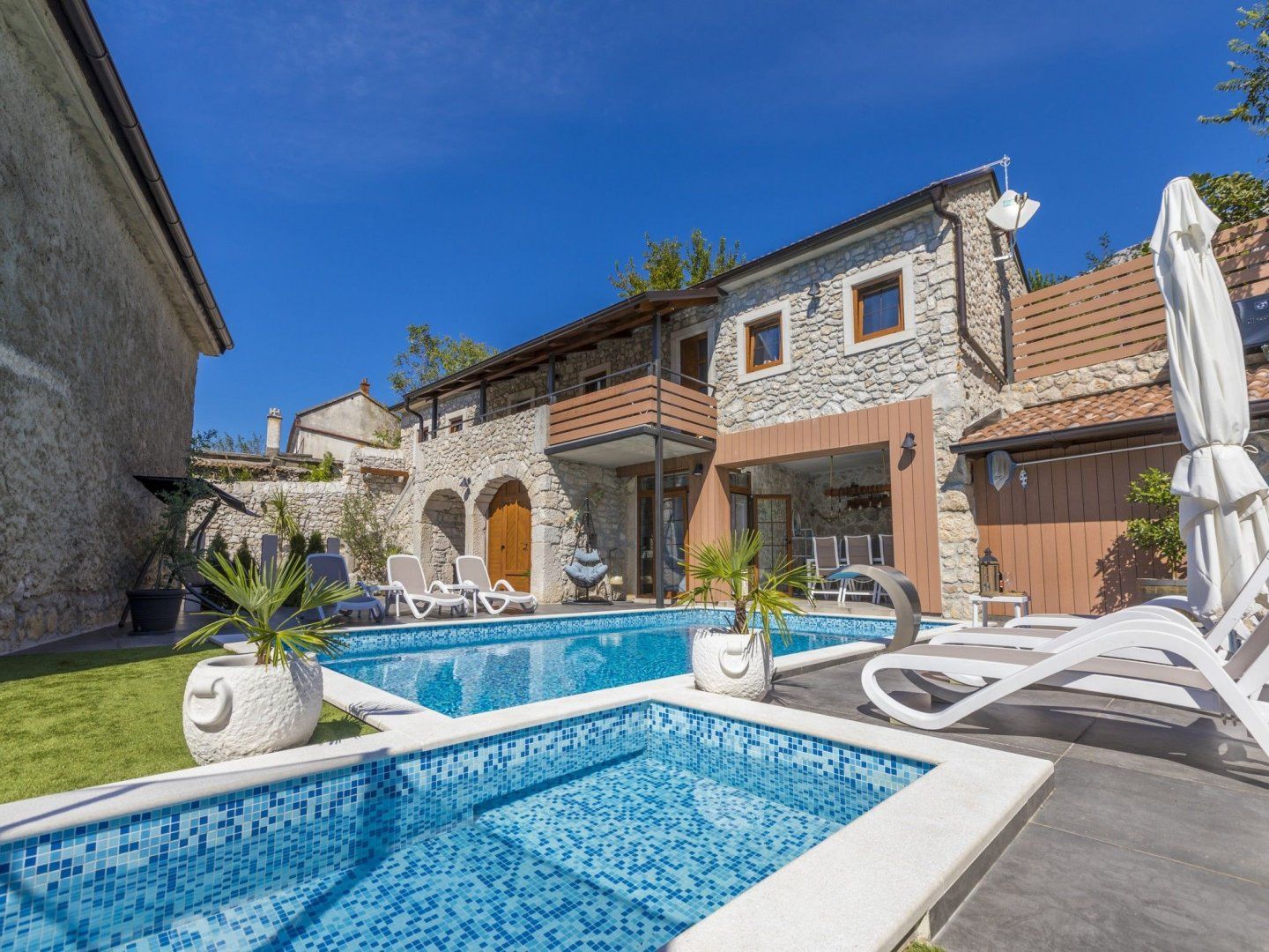 Leave the tourist trail behind at this stunning renovated farmhouse hidden away in a small inland town near Crikvenica. This countryside home provides a stunning opportunity to disconnect from everyday life and recharge your batteries while surrounded by nature. Step inside, and the first thing that catches your eye will be the stunning stone vaulted ceilings of the cosy dining/living space. The kitchen follows the exposed stone theme, but with higher ceilings and doors leading out into the garden, it benefits from more natural light. At the same time, the minimalist modern units offer a pleasing contrast to the structure of the building. Upstairs, the three individually decorated bedrooms have their own colour scheme. Two rooms benefit from luxurious en-suite bathrooms, while all enjoy easy access to the first-floor balcony. There's no doubt that the interior of this home is impressive, but it's the outdoor area that's the undoubted star of the show. The beautiful swimming pool is the focal point for those all-important days where you have nothing planned. There are plenty of poolside loungers, swing chairs and parasols for escaping the midday rays. There's even a separate paddling pool and a trampoline for the little ones, where they can burn off any excess energy.