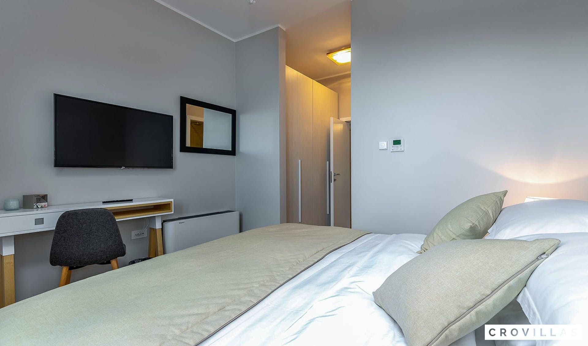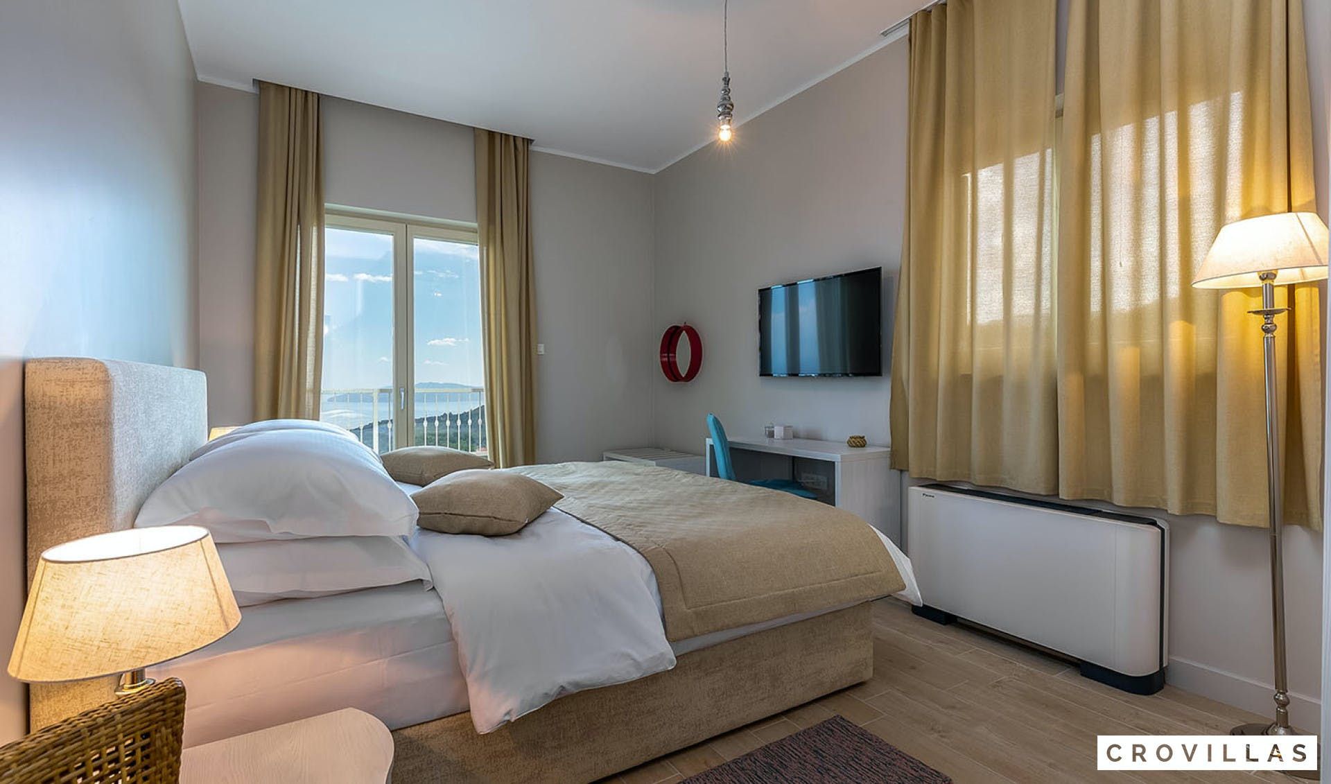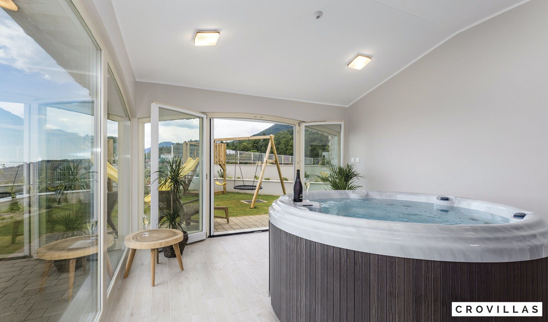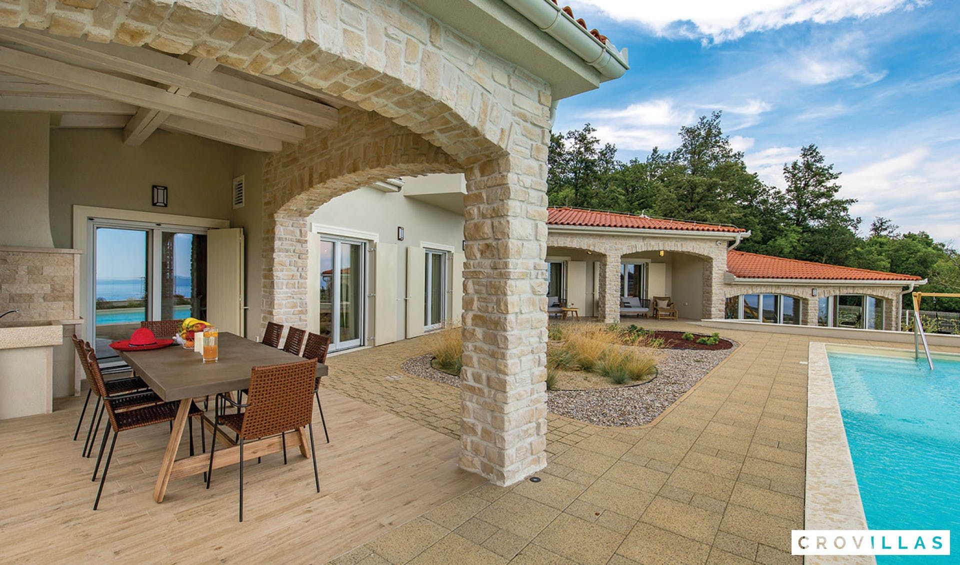 This luxurious villa is a perfect vacation home for those seeking a high-end experience. The villa is located on a 1,175m² fenced area with a large pool terrace that surrounds a 72m² pool, offering stunning sea views. The charming and stylishly designed living and dining room are complemented with high-quality furnishings and lighting. The villa features three elegant double bedrooms on the first floor, each with modern en suite bathrooms and access to the outside. The basement includes a tavern, fitness corner, and wellness zone with sauna and Jacuzzi. Two more bedrooms are located on the upper floor, both with en suite bathrooms and one with access to the balcony. The property also includes a playground for children and a brick charcoal grill for outdoor cooking. All of the bedrooms have air conditioning and private TVs. Overall, this property offers an exceptional vacation experience in a beautiful setting.