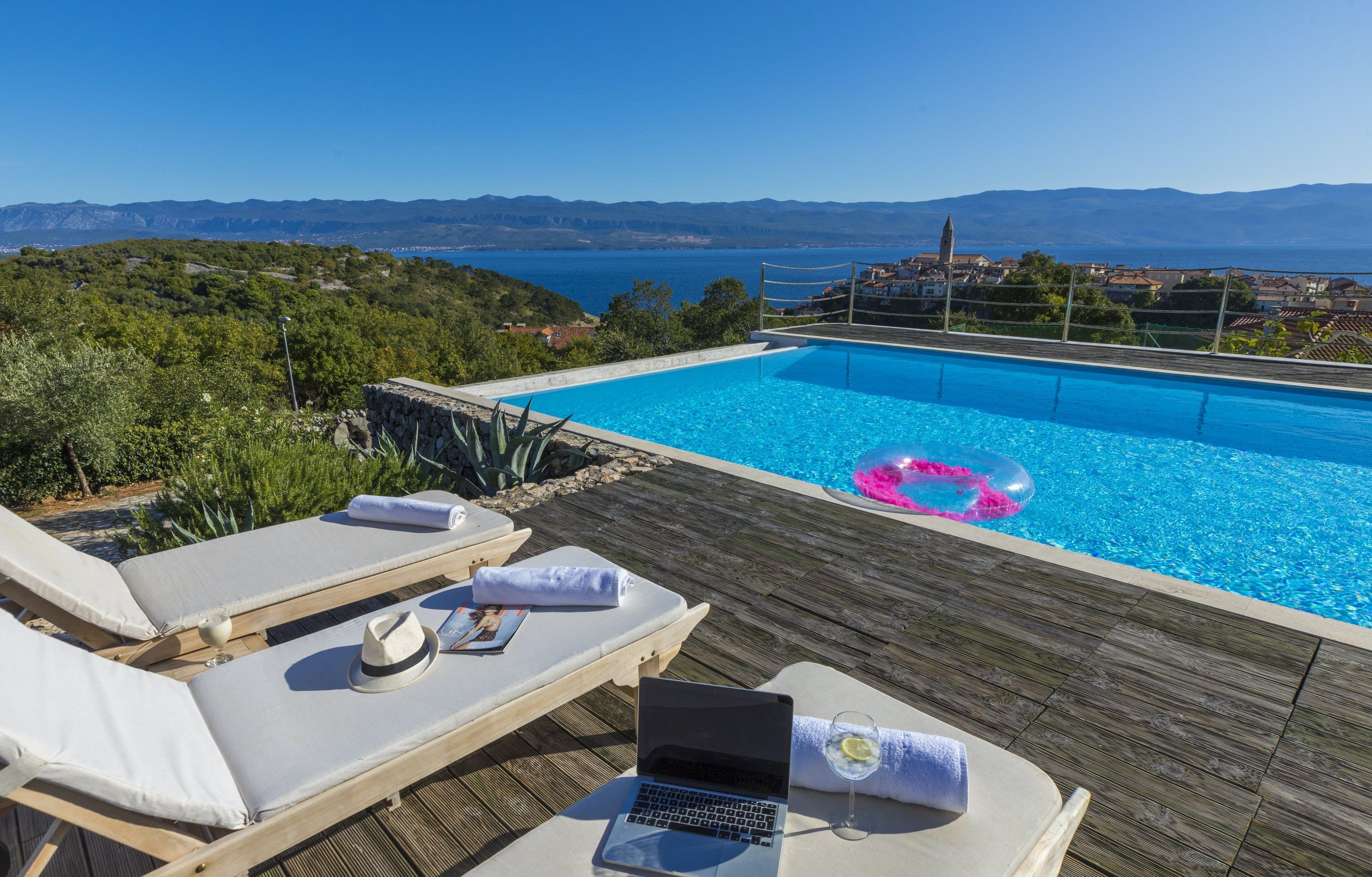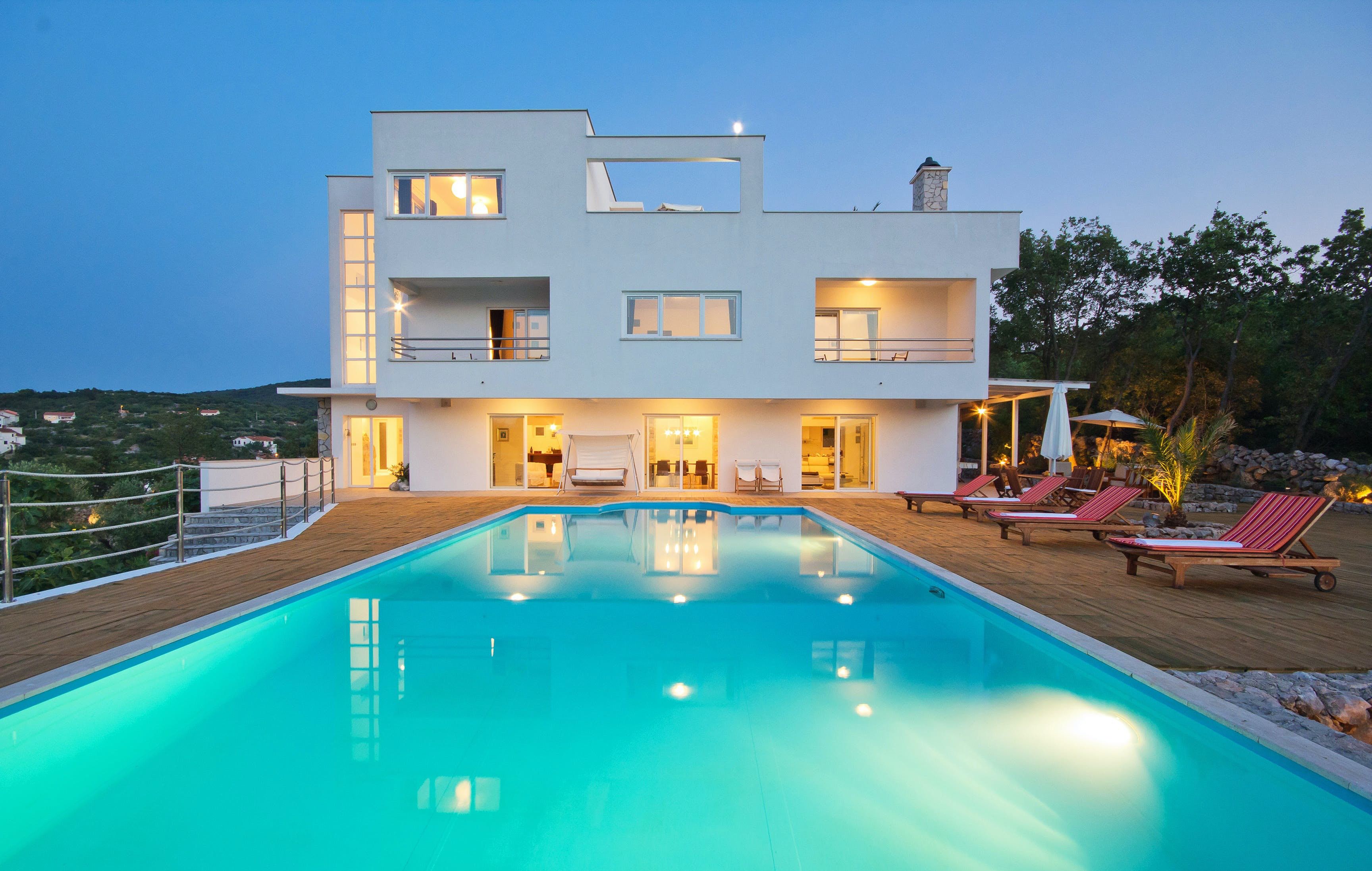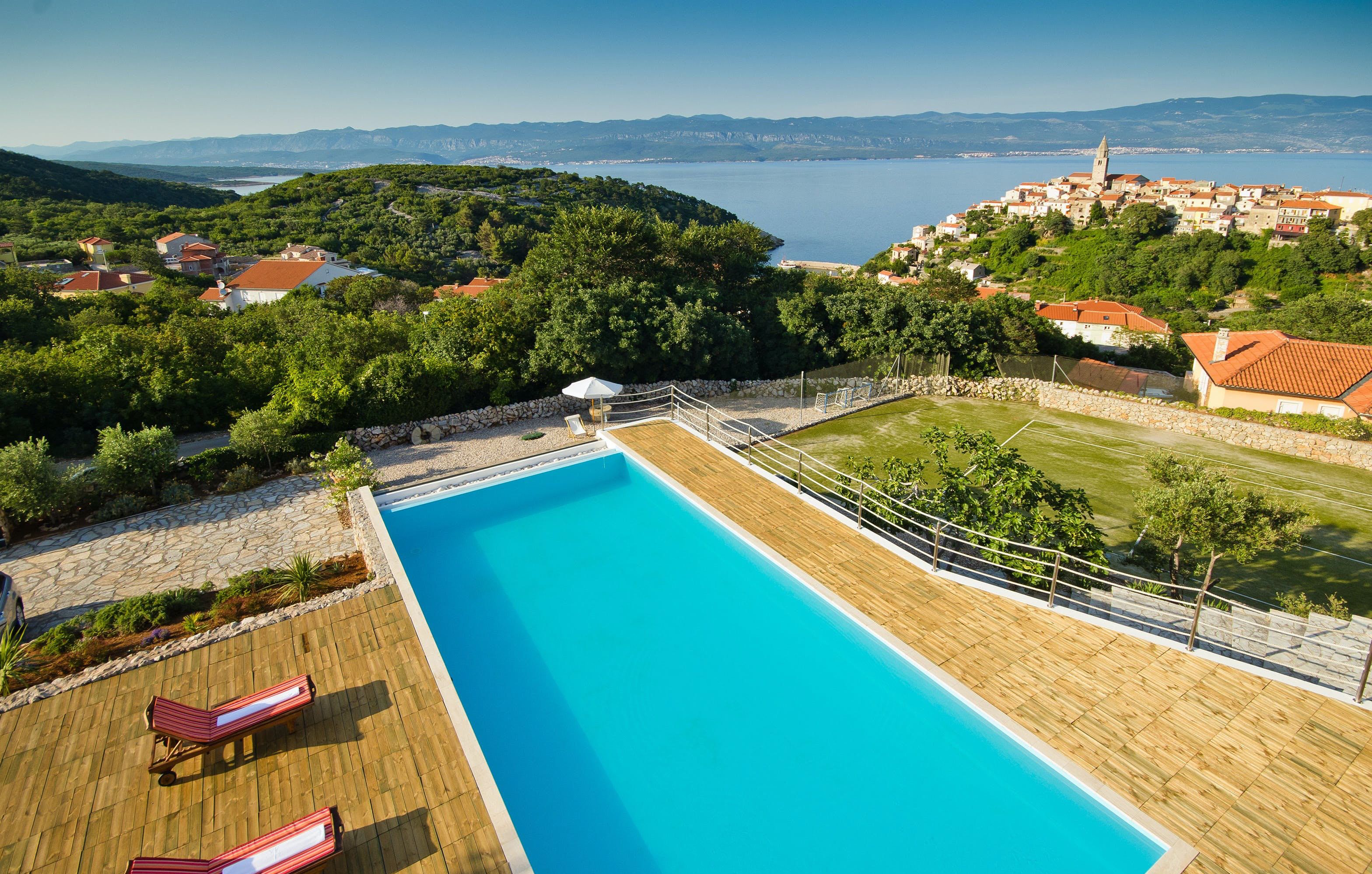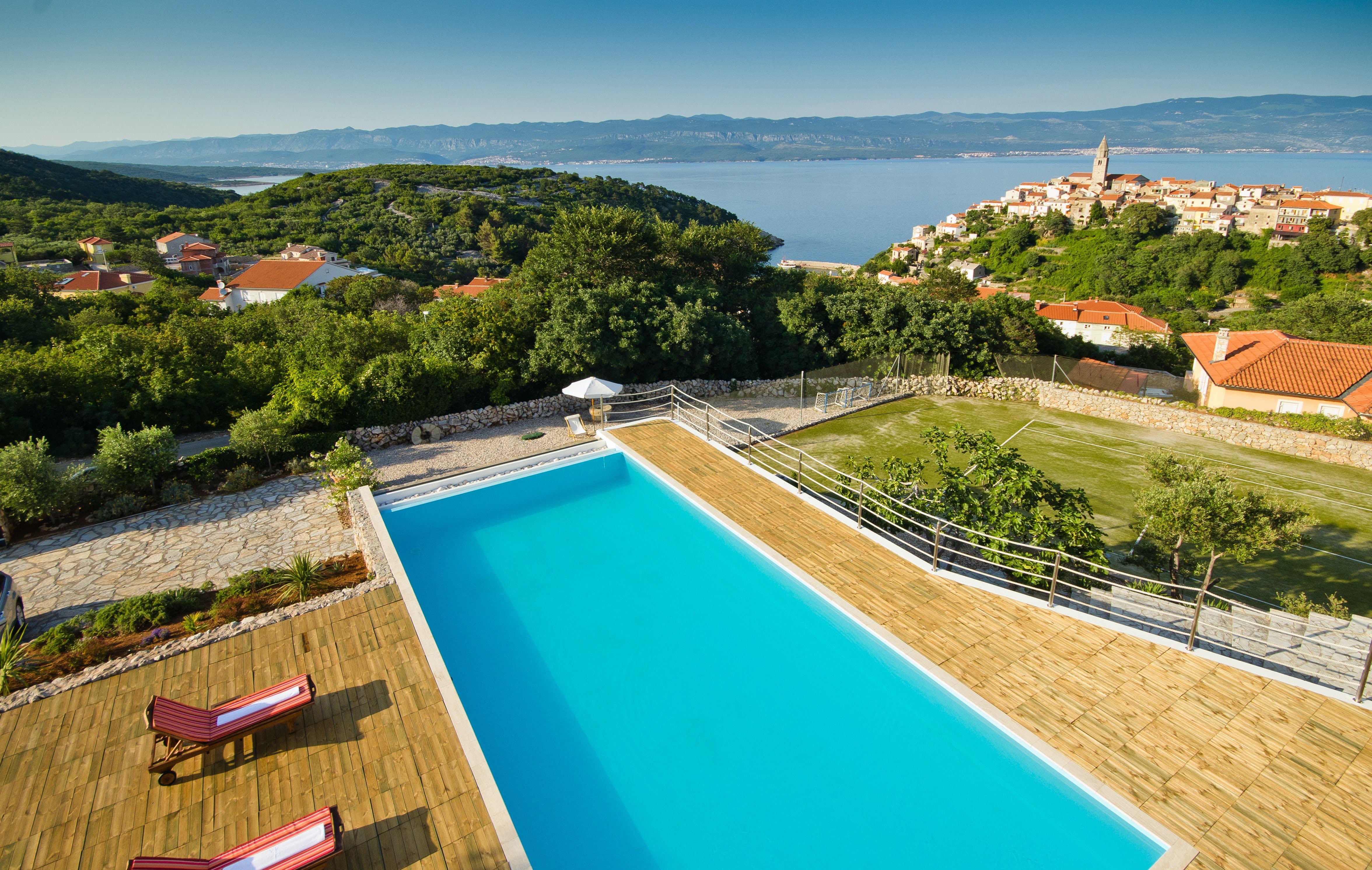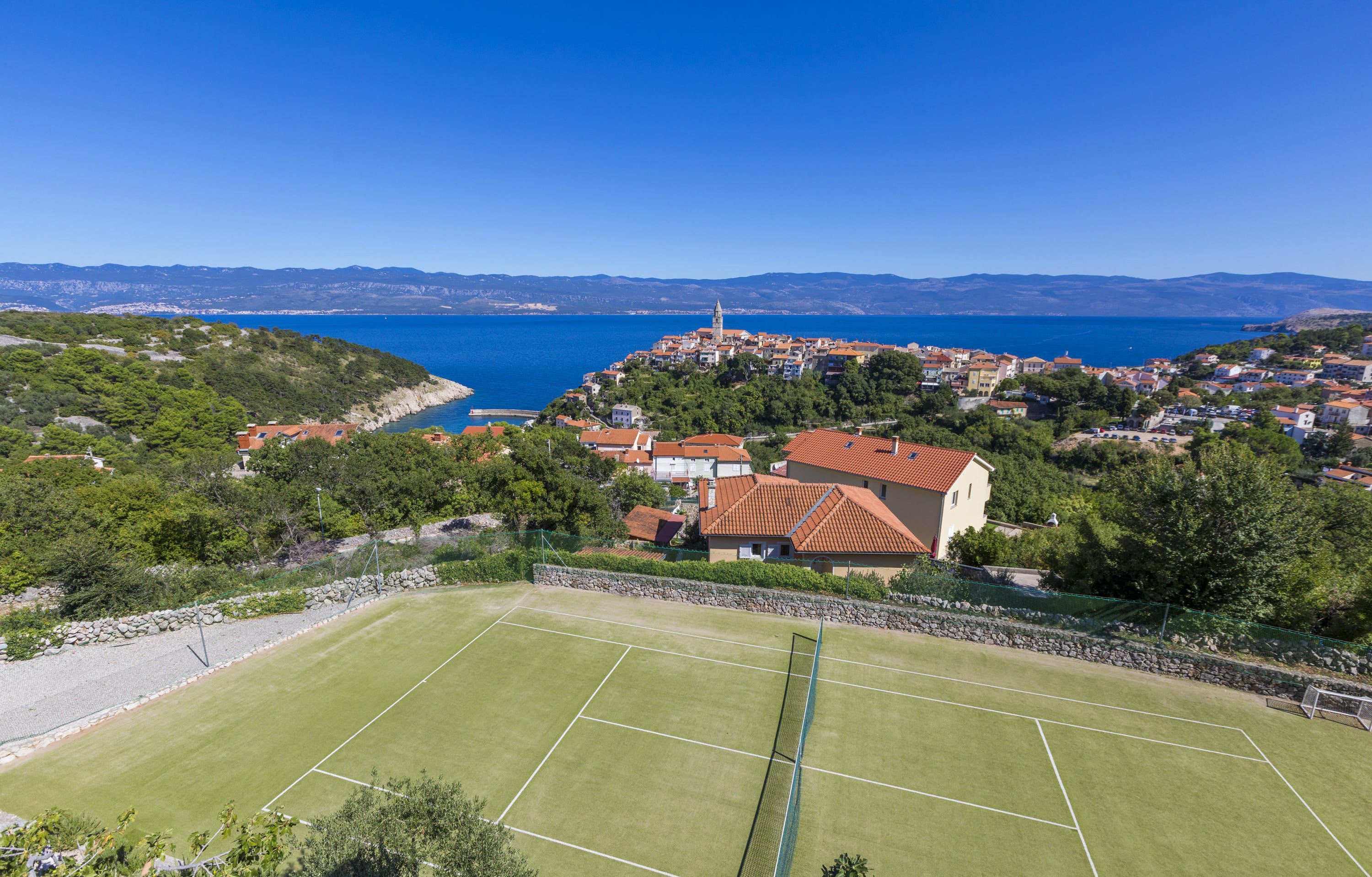 This luxury villa is situated in a picturesque town on the east coast of the island of Krk. It boasts a stunning panoramic view of the surrounding hills, vineyards, and the Adriatic Sea. The spacious two-story villa offers five bedrooms, all with private LCD TVs and air conditioning. A highlight is the main bedroom on the second floor, which leads to a sun deck with a Jacuzzi and sauna. The villa's wooden terrace features a large heated pool surrounded by palm trees and loungers, as well as a covered outdoor seating area with a barbecue. Guests can also enjoy their own tennis court with equipment provided. The beach is just 300 meters away, while the town offers beautiful views of Kvarner Bay and a mix of ancient history and modern amenities.