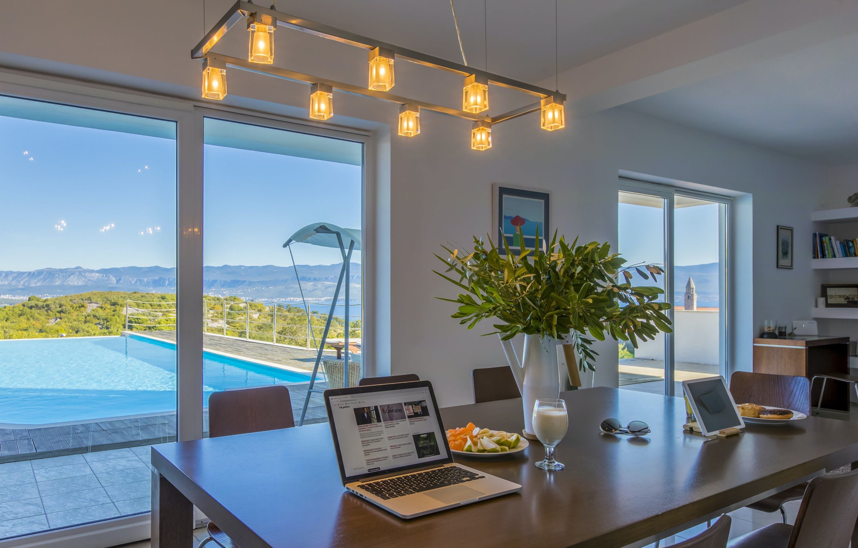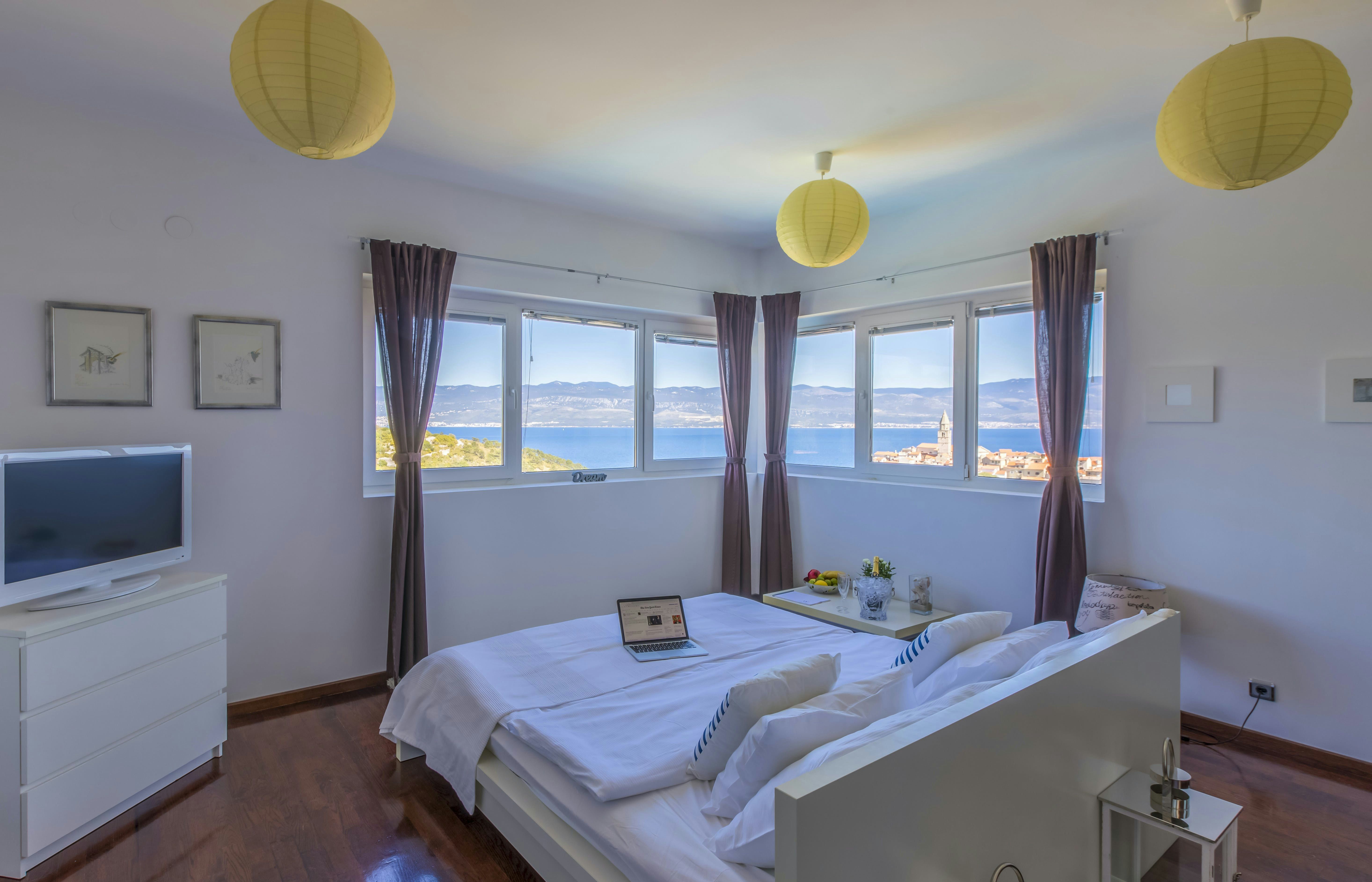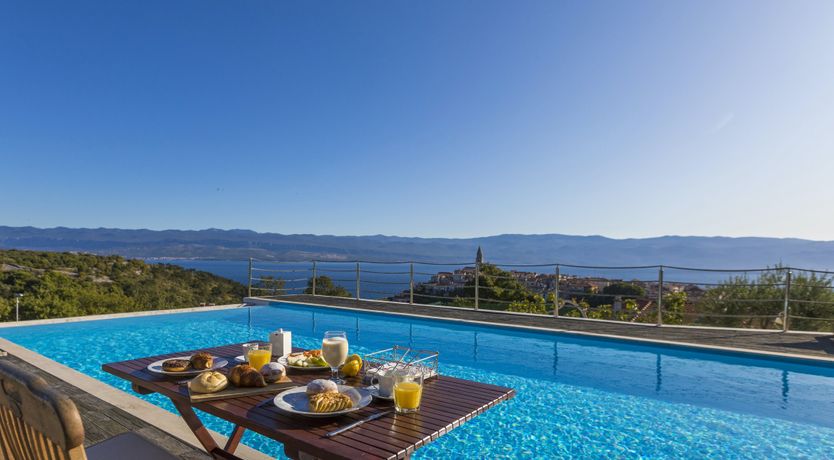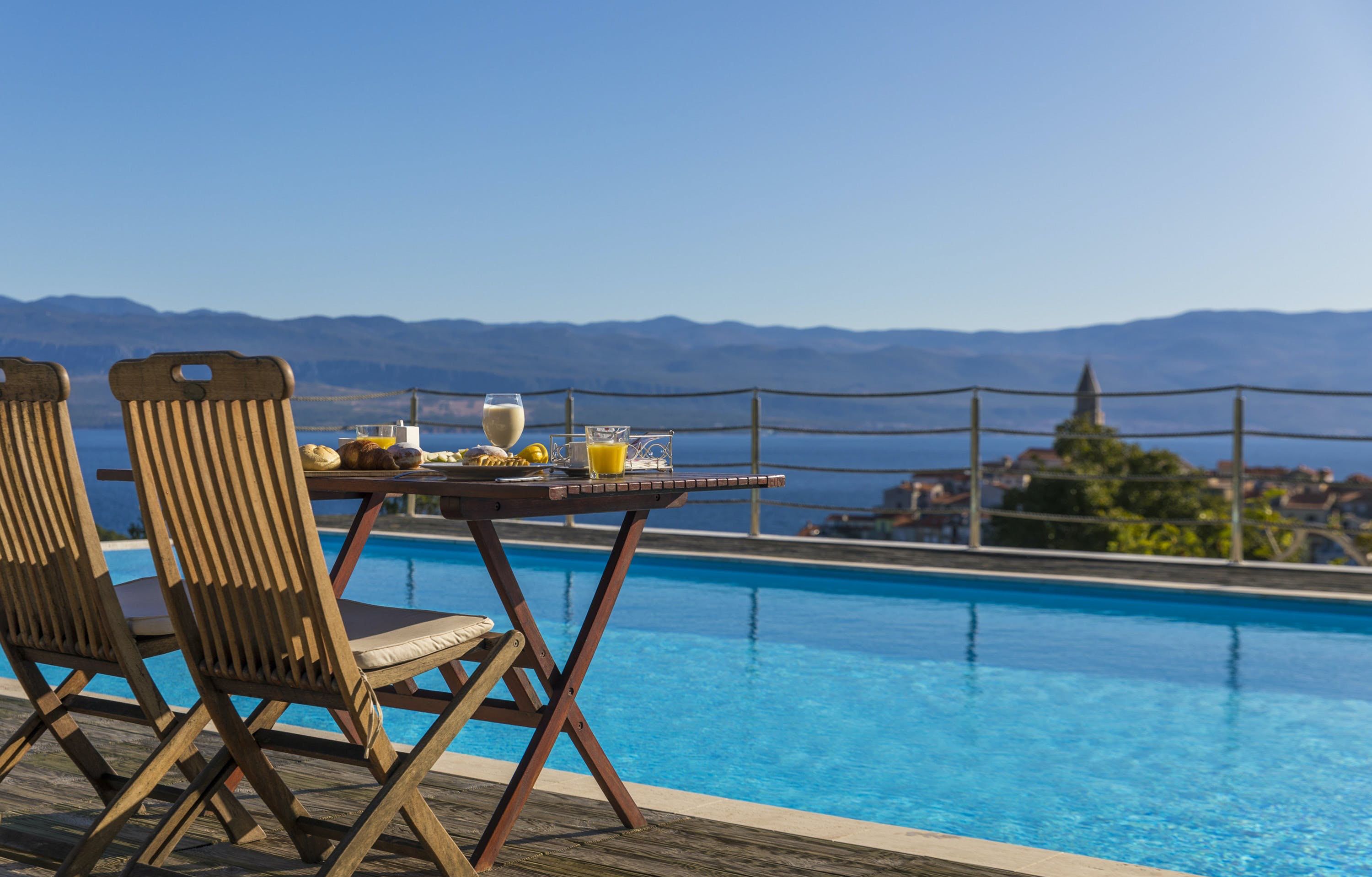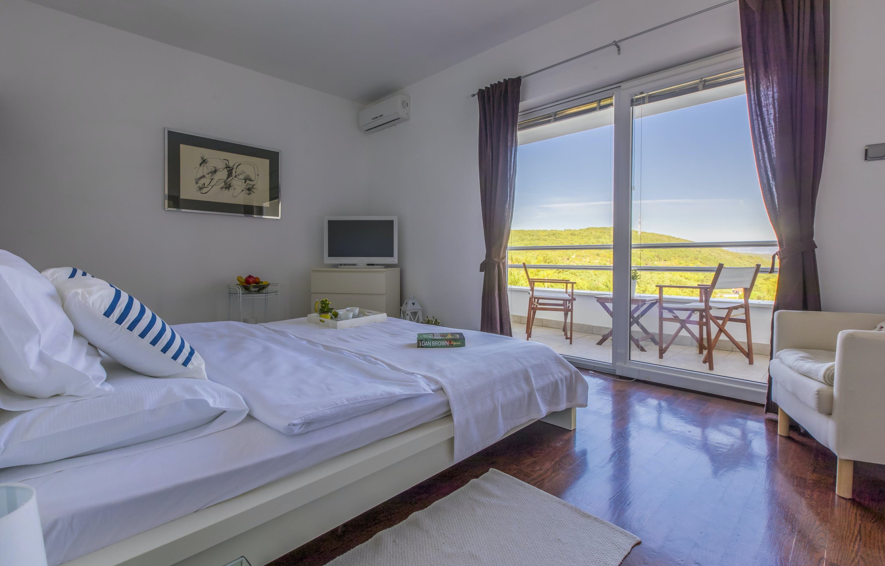 This luxury villa is situated in a picturesque town on the east coast of the island of Krk. It boasts a stunning panoramic view of the surrounding hills, vineyards, and the Adriatic Sea. The spacious two-story villa offers five bedrooms, all with private LCD TVs and air conditioning. A highlight is the main bedroom on the second floor, which leads to a sun deck with a Jacuzzi and sauna. The villa's wooden terrace features a large heated pool surrounded by palm trees and loungers, as well as a covered outdoor seating area with a barbecue. Guests can also enjoy their own tennis court with equipment provided. The beach is just 300 meters away, while the town offers beautiful views of Kvarner Bay and a mix of ancient history and modern amenities.
