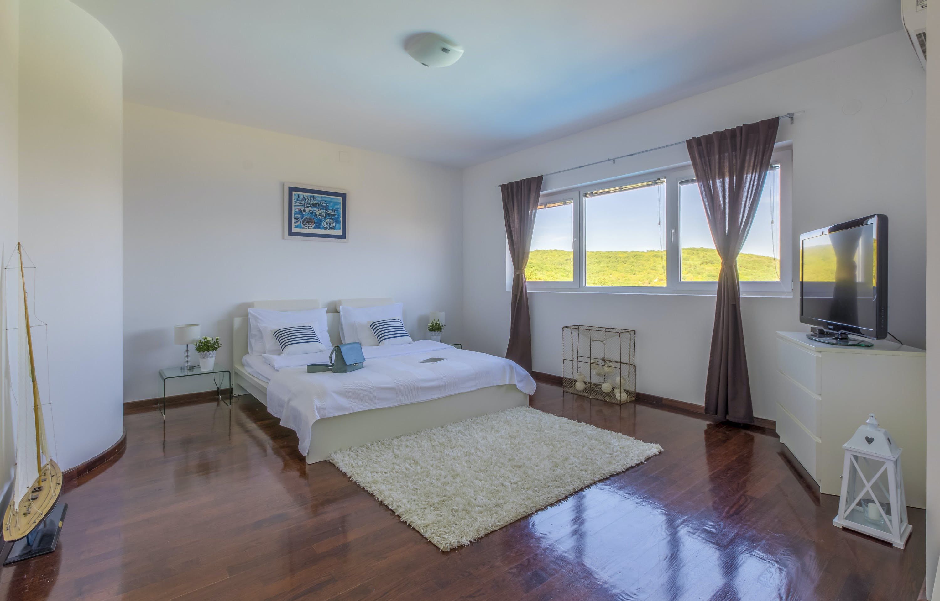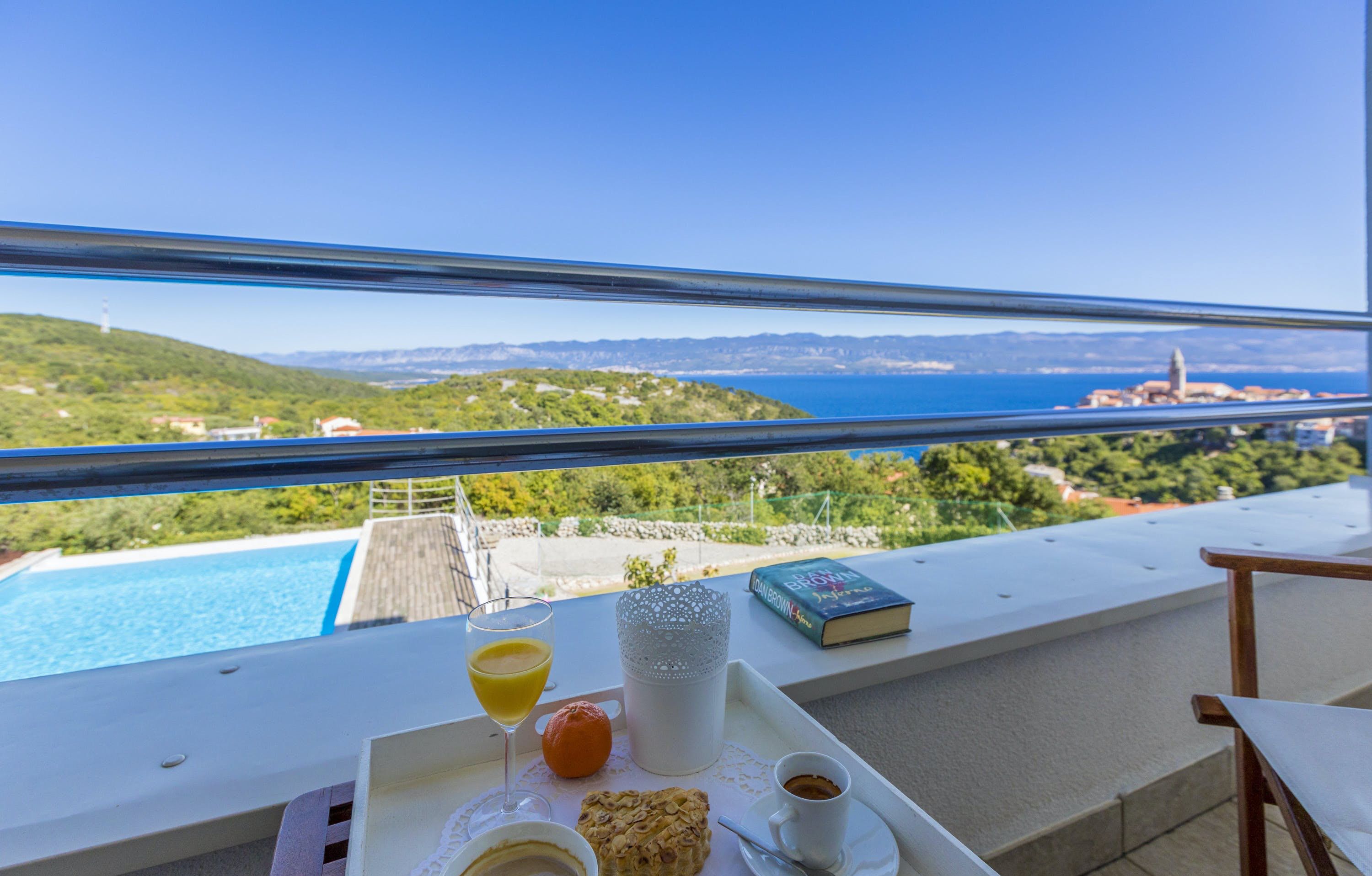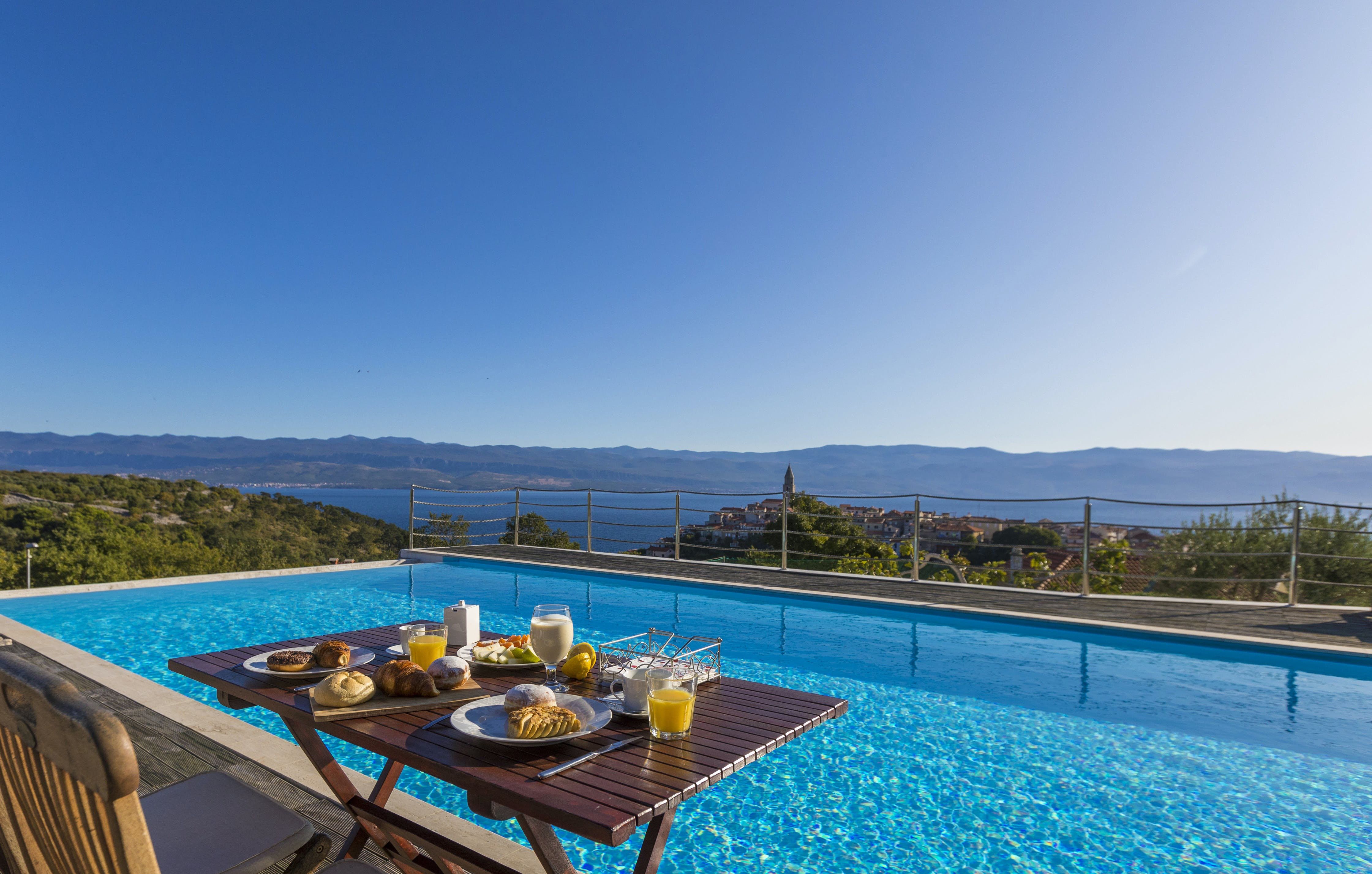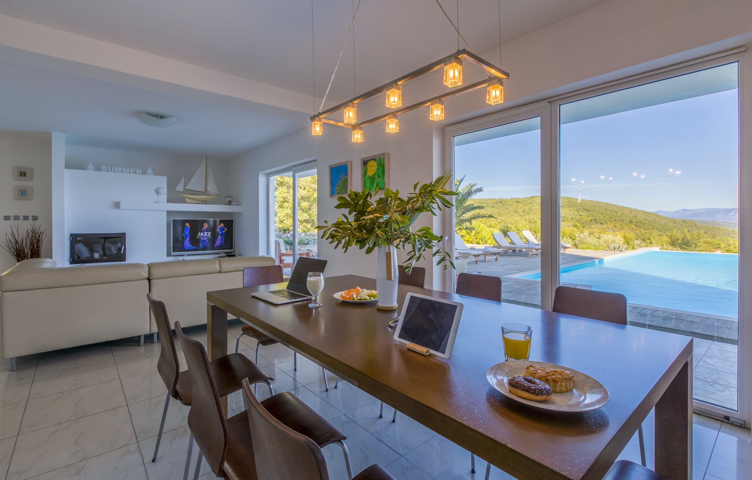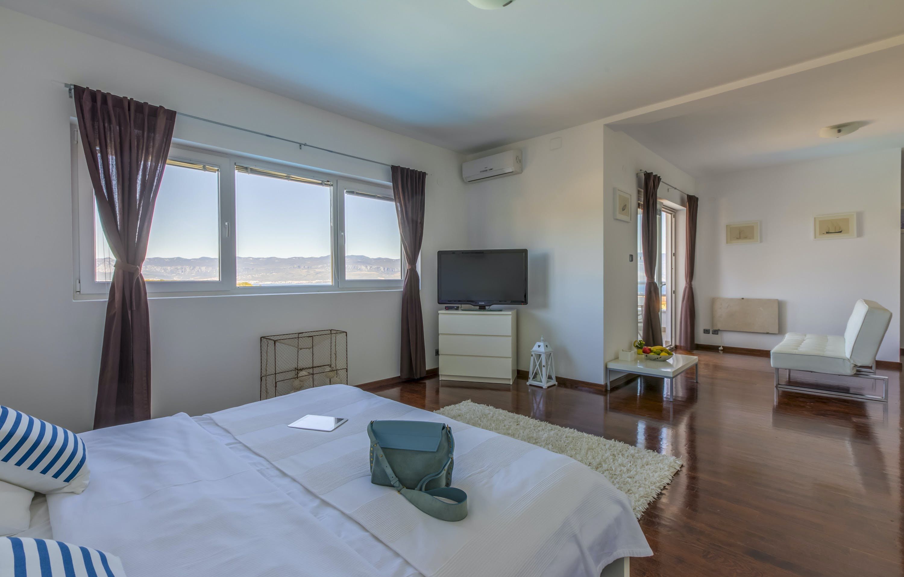 This luxury villa is situated in a picturesque town on the east coast of the island of Krk. It boasts a stunning panoramic view of the surrounding hills, vineyards, and the Adriatic Sea. The spacious two-story villa offers five bedrooms, all with private LCD TVs and air conditioning. A highlight is the main bedroom on the second floor, which leads to a sun deck with a Jacuzzi and sauna. The villa's wooden terrace features a large heated pool surrounded by palm trees and loungers, as well as a covered outdoor seating area with a barbecue. Guests can also enjoy their own tennis court with equipment provided. The beach is just 300 meters away, while the town offers beautiful views of Kvarner Bay and a mix of ancient history and modern amenities.