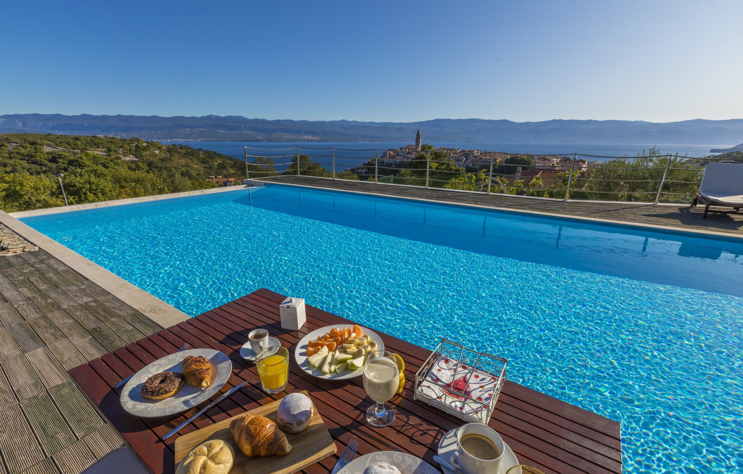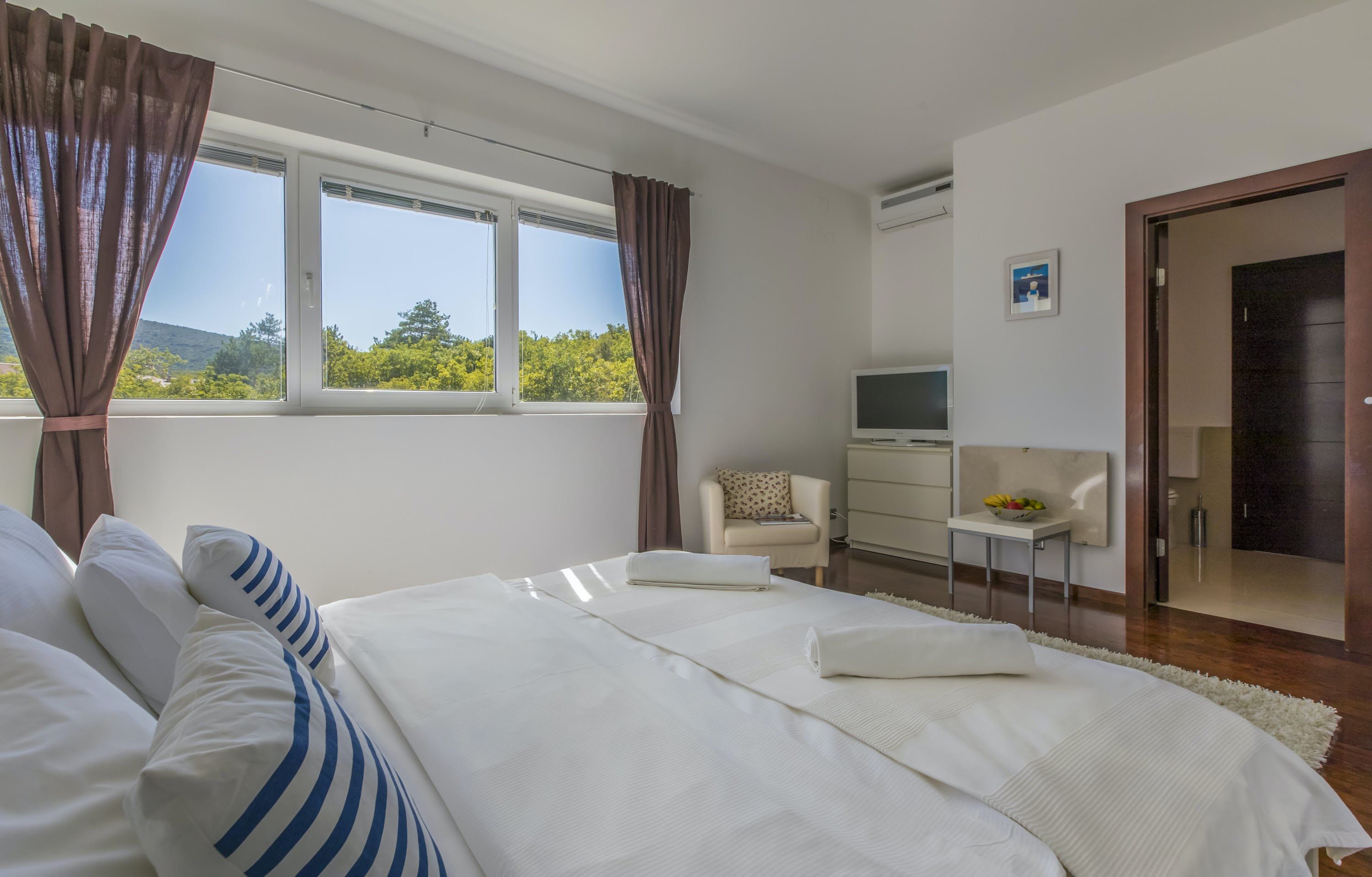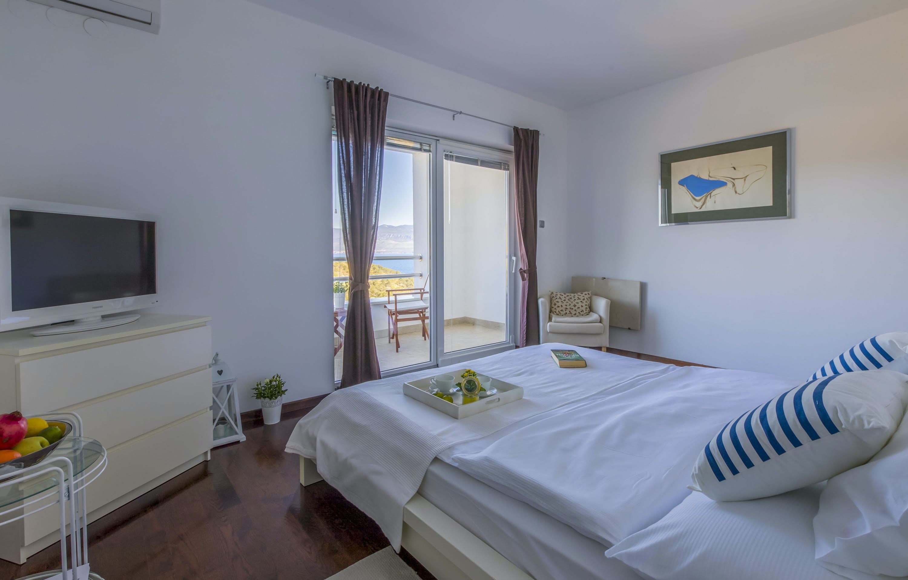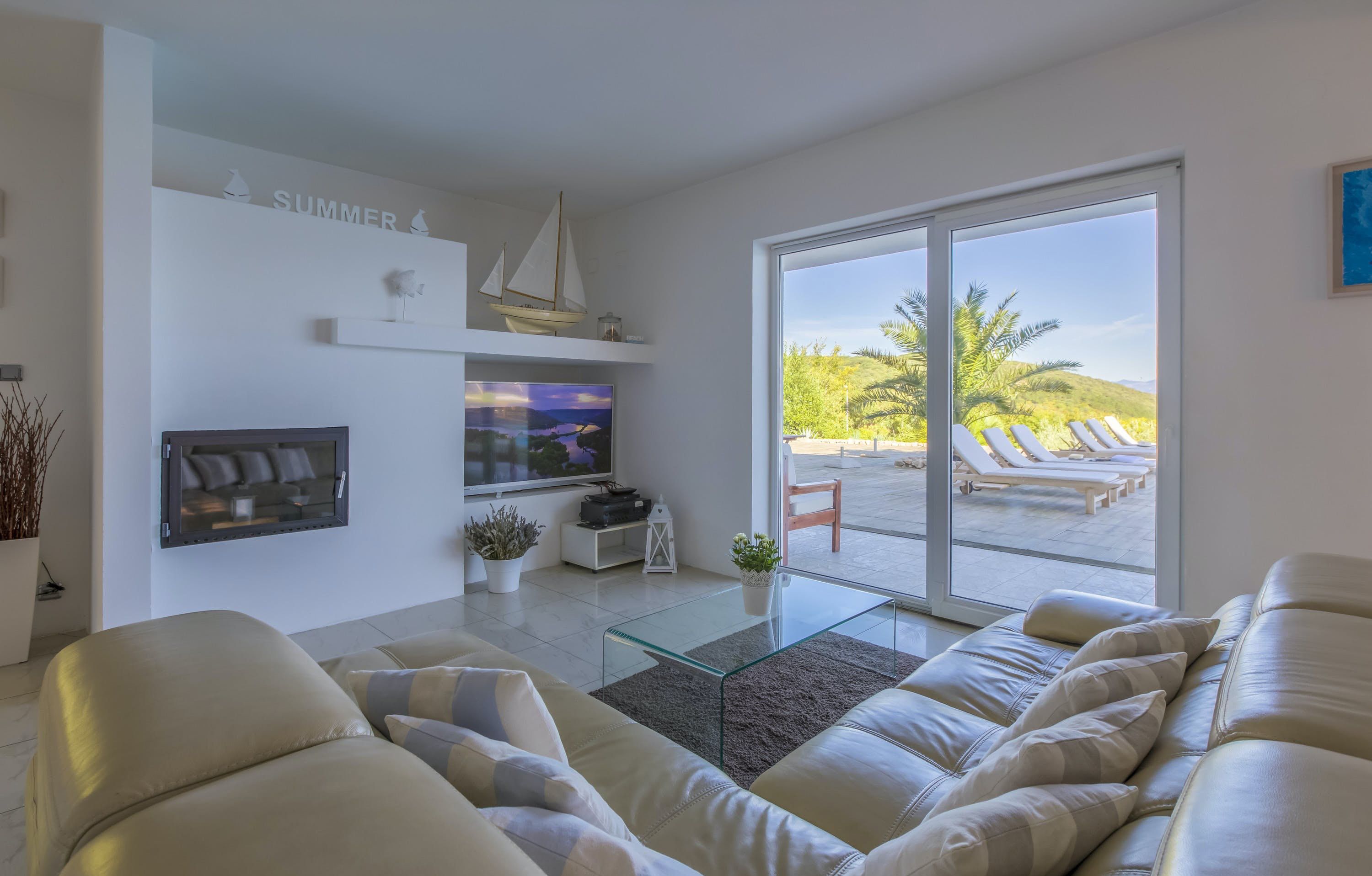This luxury villa is situated in a picturesque town on the east coast of the island of Krk. It boasts a stunning panoramic view of the surrounding hills, vineyards, and the Adriatic Sea. The spacious two-story villa offers five bedrooms, all with private LCD TVs and air conditioning. A highlight is the main bedroom on the second floor, which leads to a sun deck with a Jacuzzi and sauna. The villa's wooden terrace features a large heated pool surrounded by palm trees and loungers, as well as a covered outdoor seating area with a barbecue. Guests can also enjoy their own tennis court with equipment provided. The beach is just 300 meters away, while the town offers beautiful views of Kvarner Bay and a mix of ancient history and modern amenities.