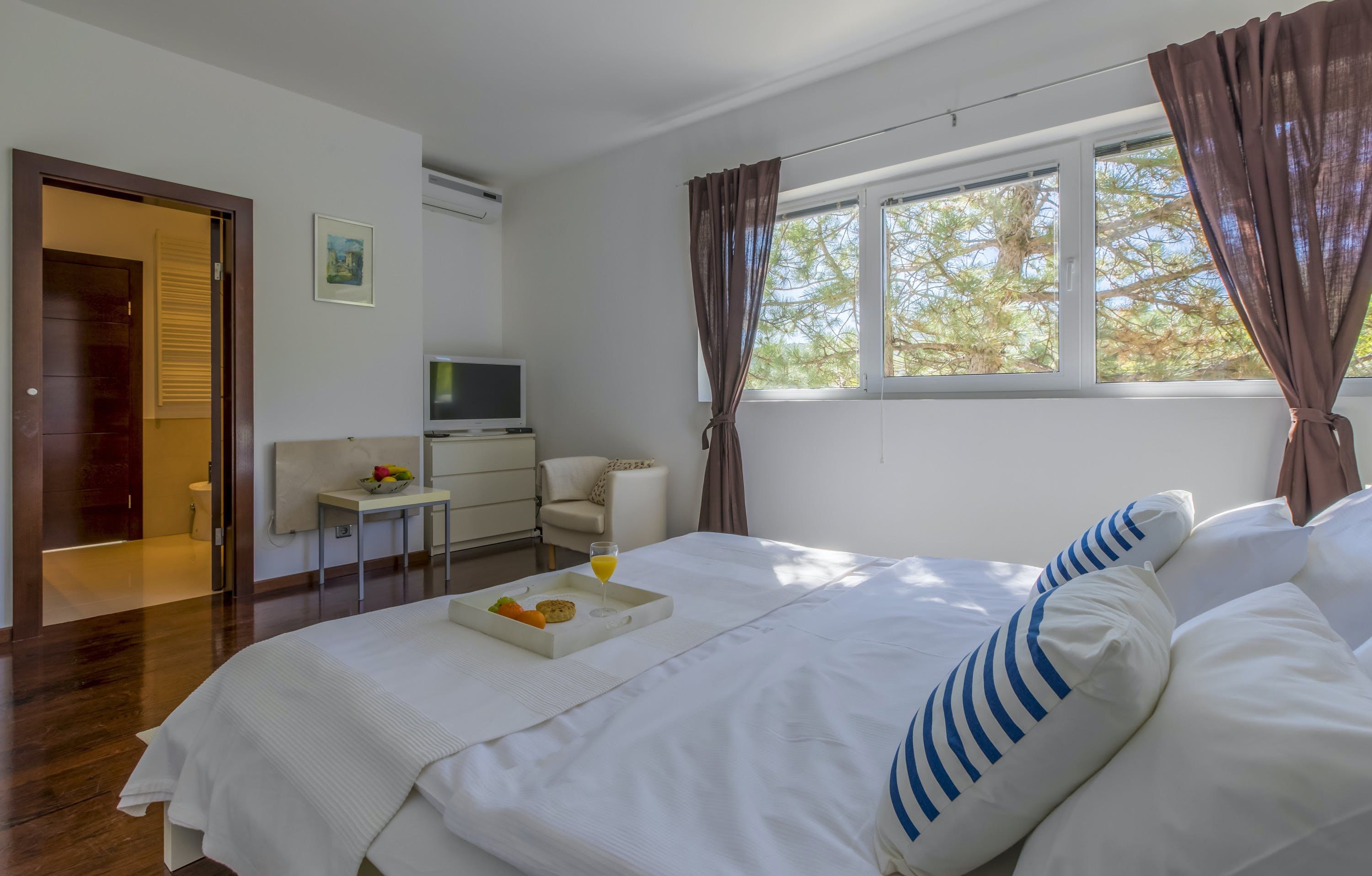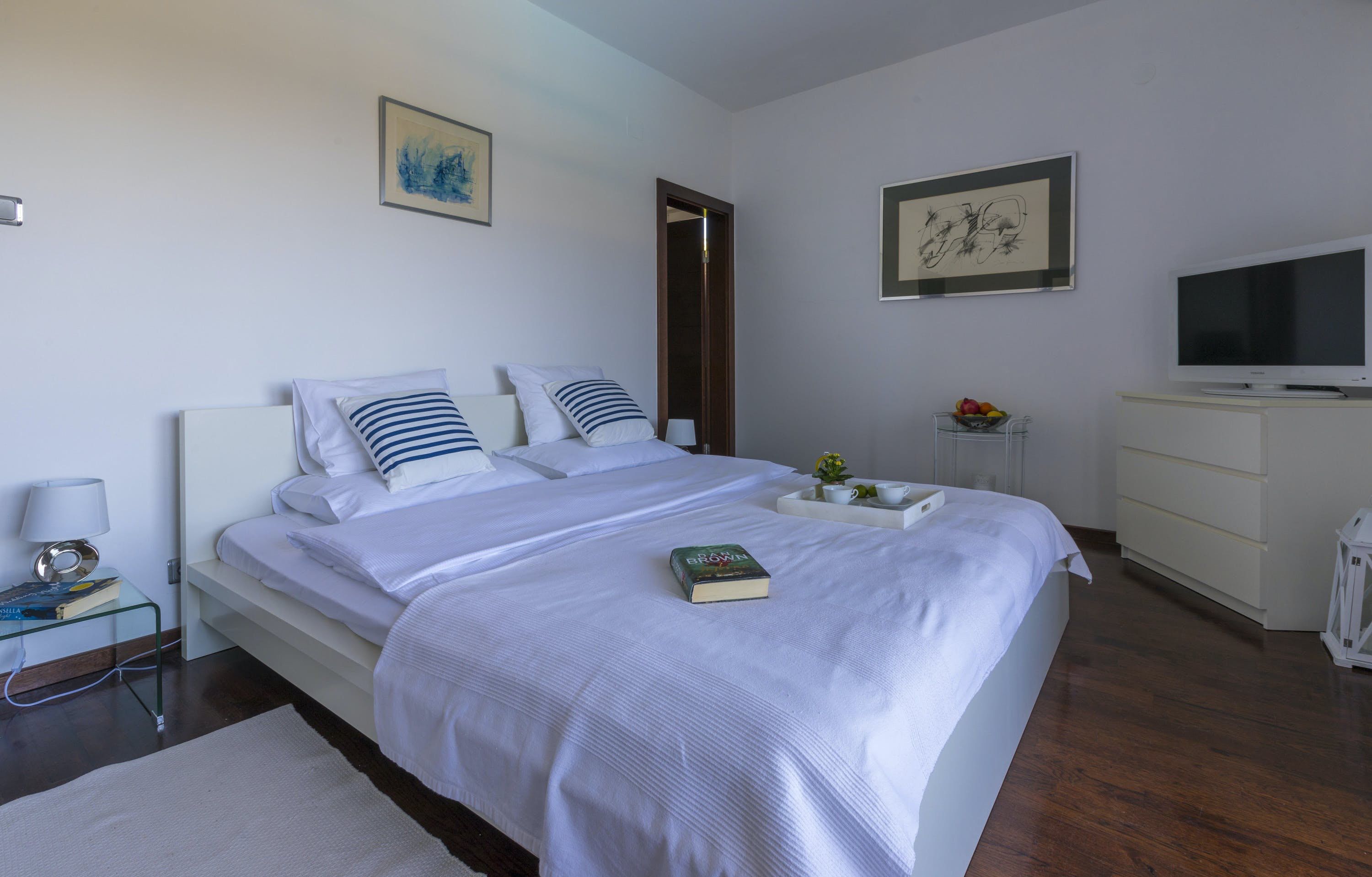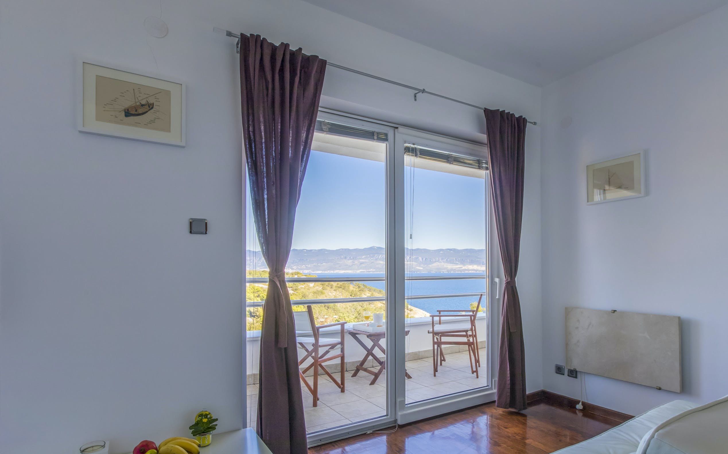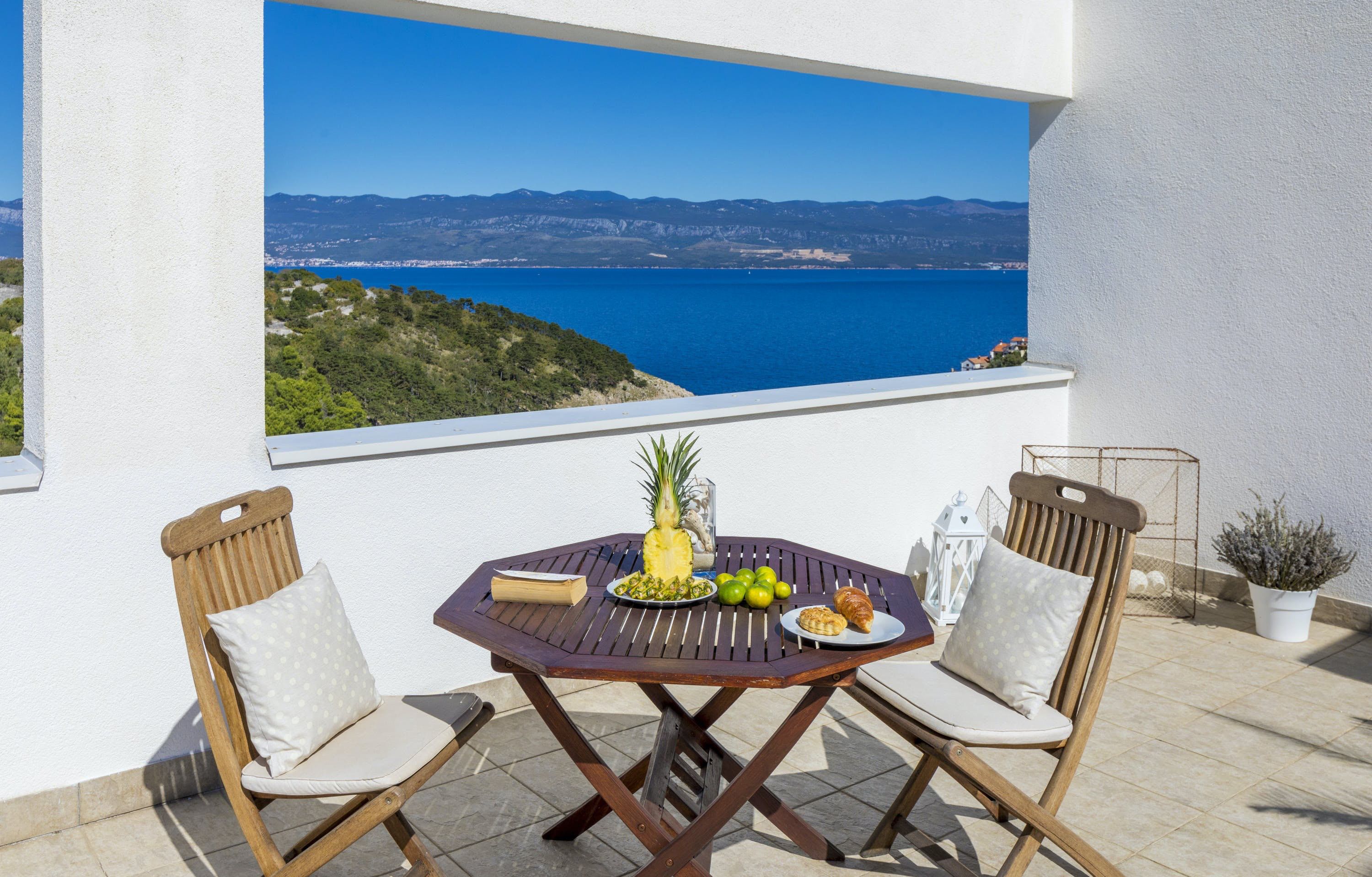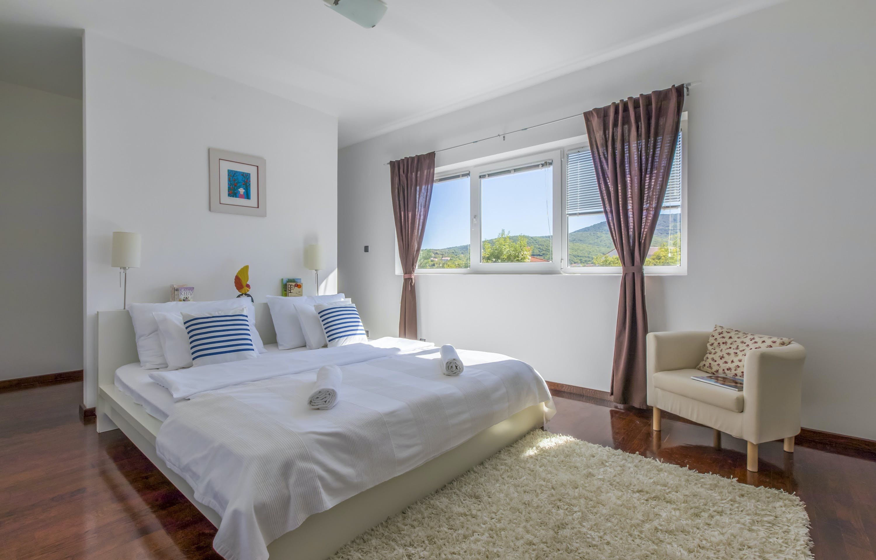 This luxury villa is situated in a picturesque town on the east coast of the island of Krk. It boasts a stunning panoramic view of the surrounding hills, vineyards, and the Adriatic Sea. The spacious two-story villa offers five bedrooms, all with private LCD TVs and air conditioning. A highlight is the main bedroom on the second floor, which leads to a sun deck with a Jacuzzi and sauna. The villa's wooden terrace features a large heated pool surrounded by palm trees and loungers, as well as a covered outdoor seating area with a barbecue. Guests can also enjoy their own tennis court with equipment provided. The beach is just 300 meters away, while the town offers beautiful views of Kvarner Bay and a mix of ancient history and modern amenities.