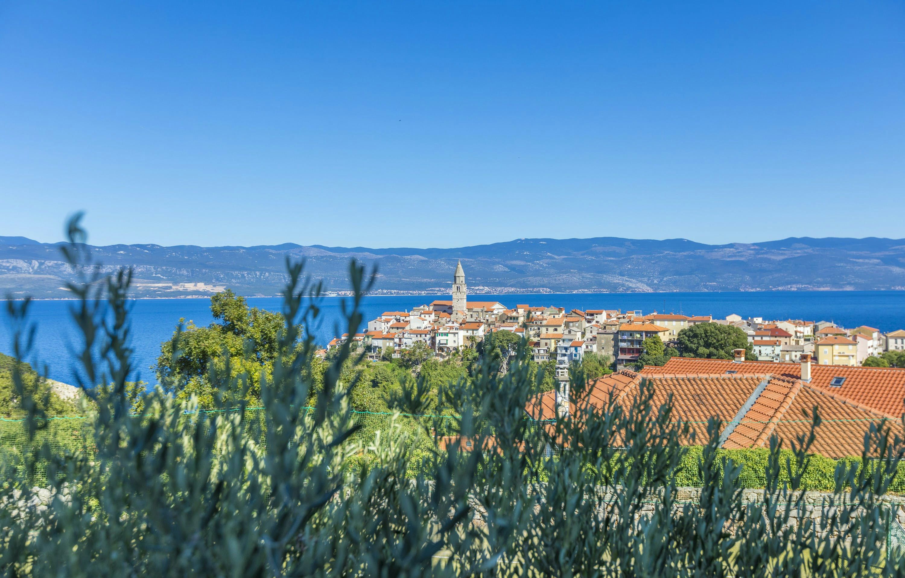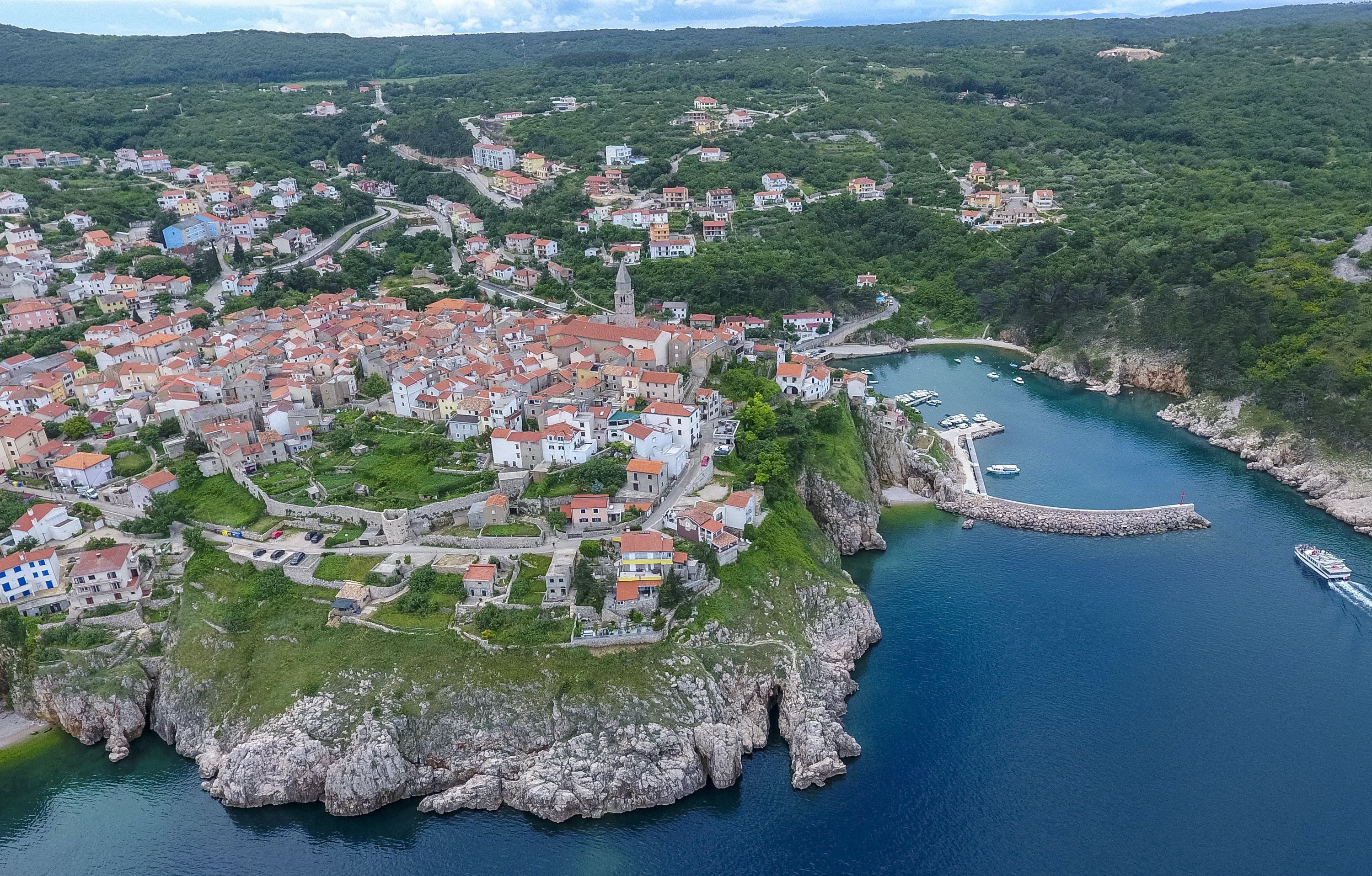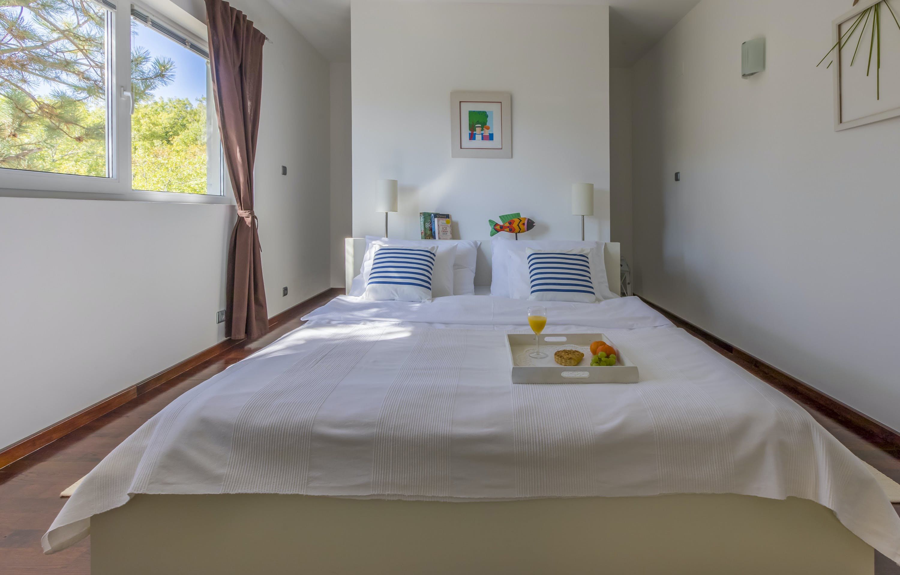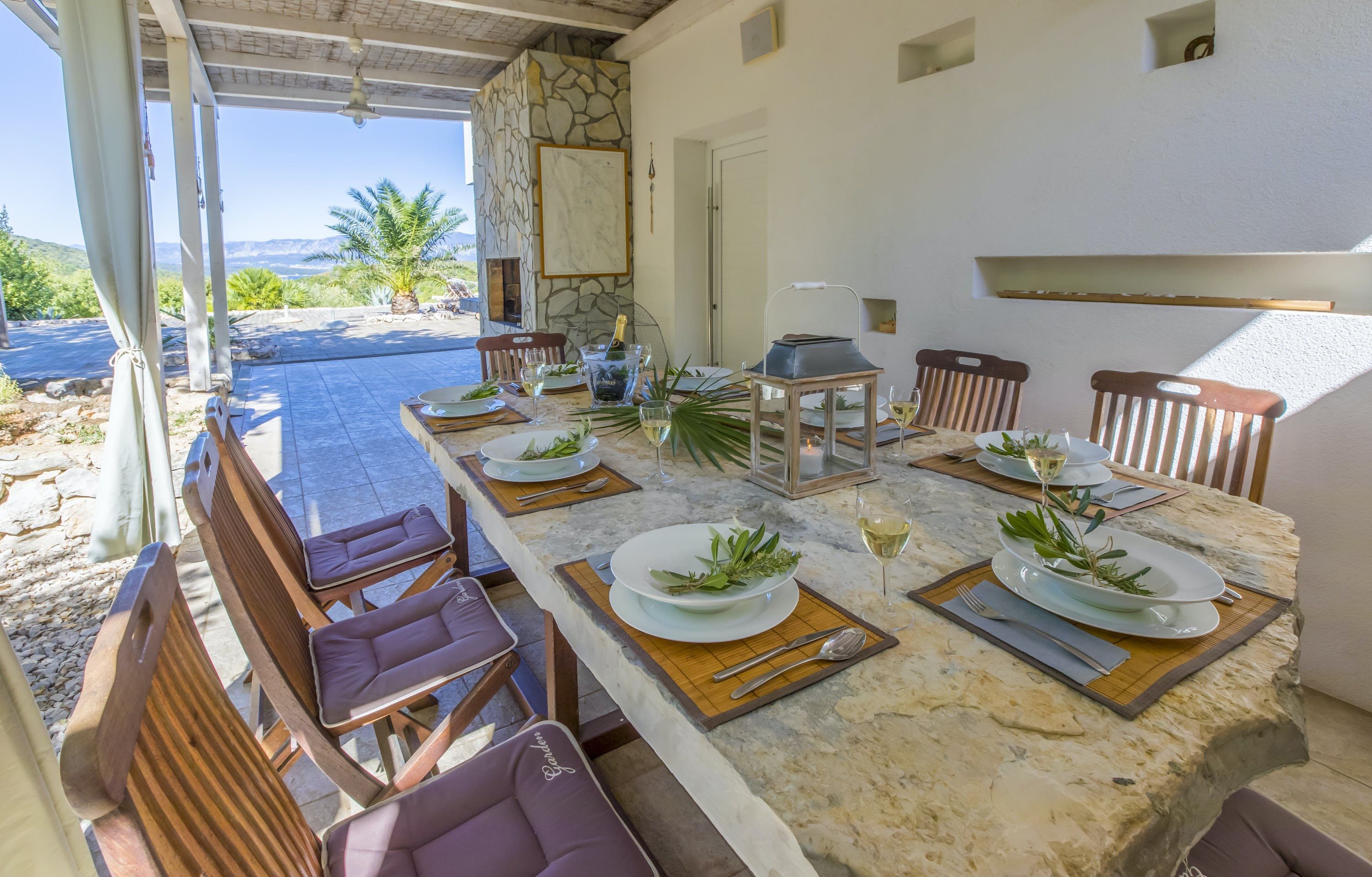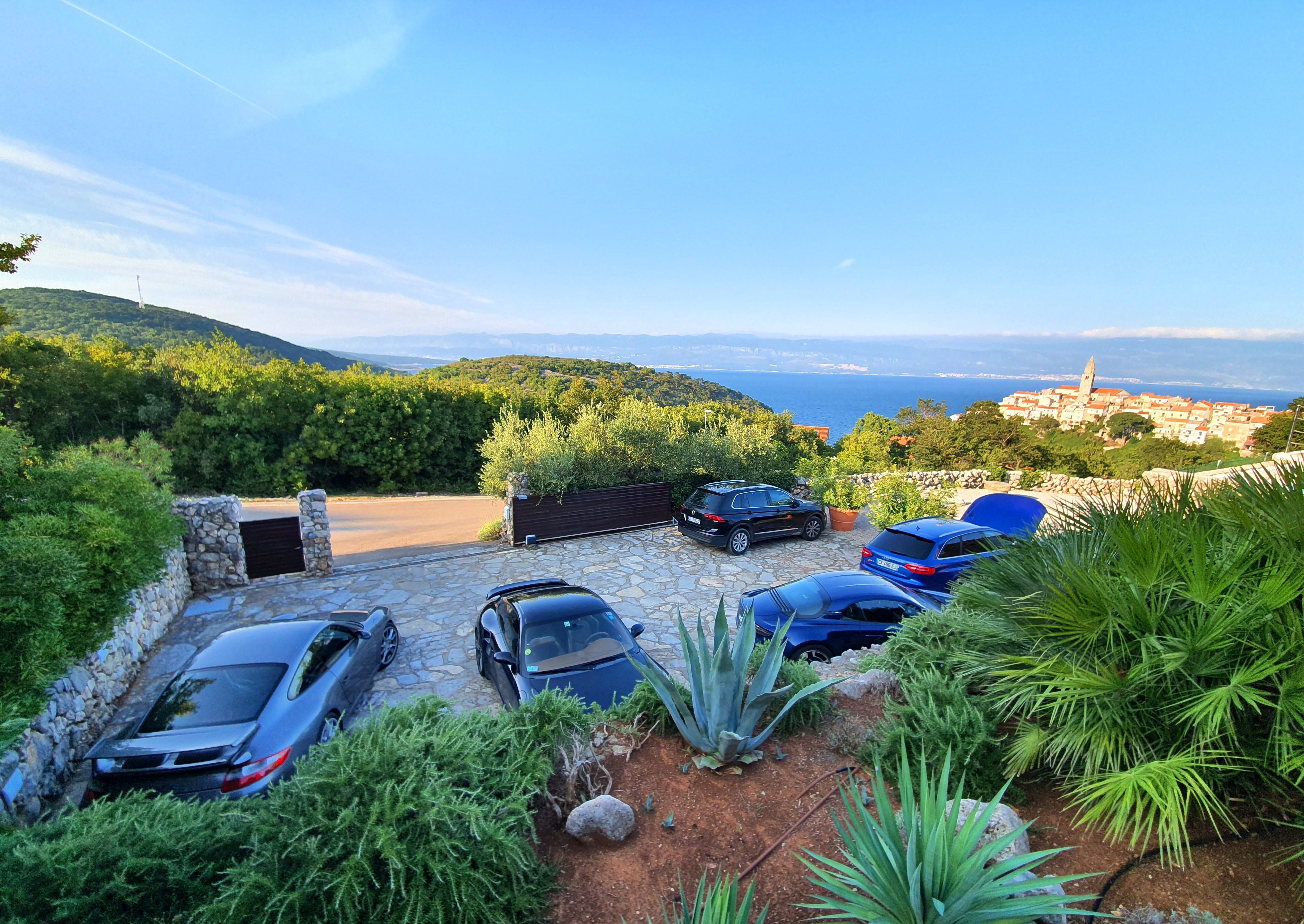This luxury villa is situated in a picturesque town on the east coast of the island of Krk. It boasts a stunning panoramic view of the surrounding hills, vineyards, and the Adriatic Sea. The spacious two-story villa offers five bedrooms, all with private LCD TVs and air conditioning. A highlight is the main bedroom on the second floor, which leads to a sun deck with a Jacuzzi and sauna. The villa's wooden terrace features a large heated pool surrounded by palm trees and loungers, as well as a covered outdoor seating area with a barbecue. Guests can also enjoy their own tennis court with equipment provided. The beach is just 300 meters away, while the town offers beautiful views of Kvarner Bay and a mix of ancient history and modern amenities.