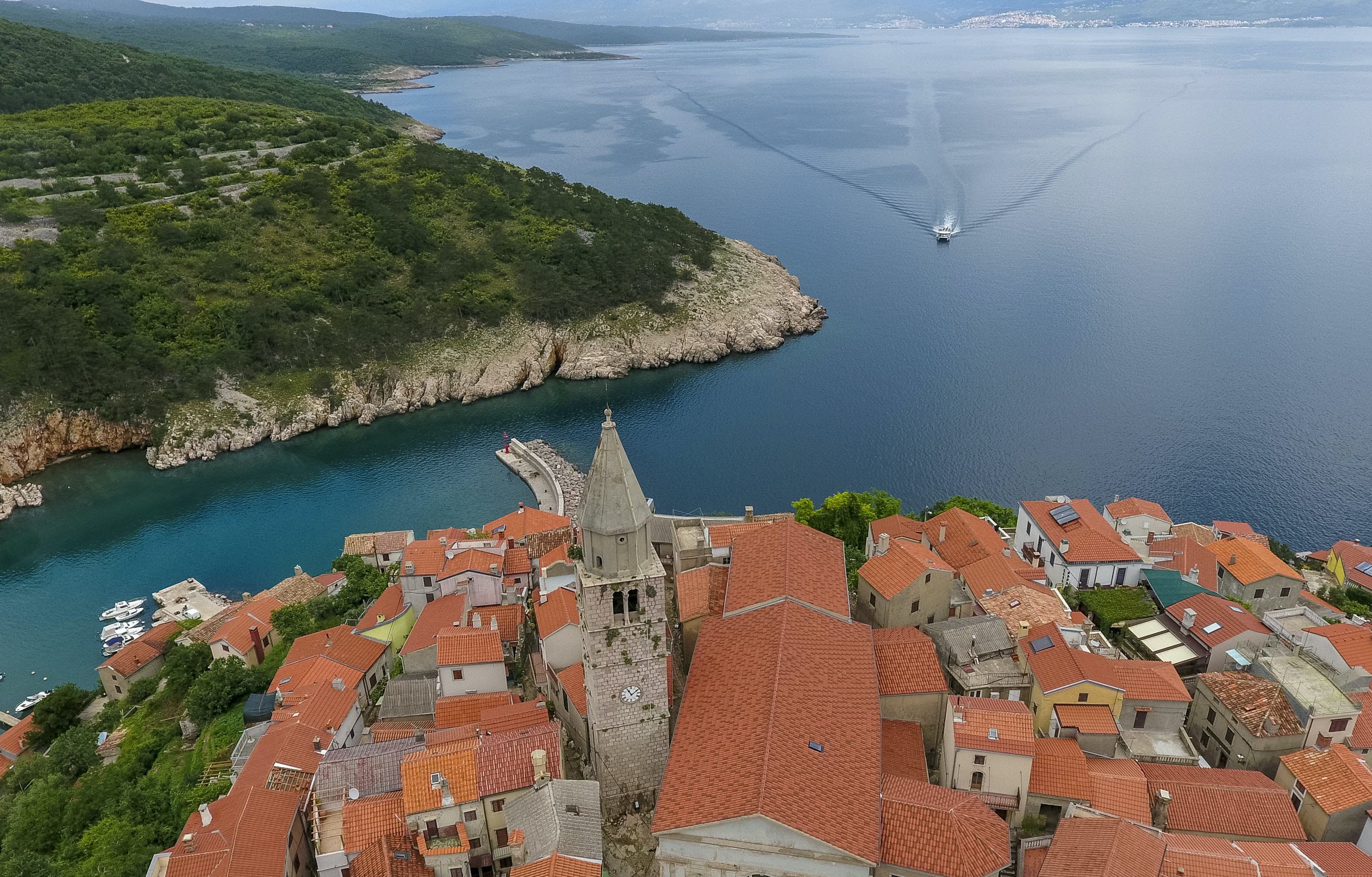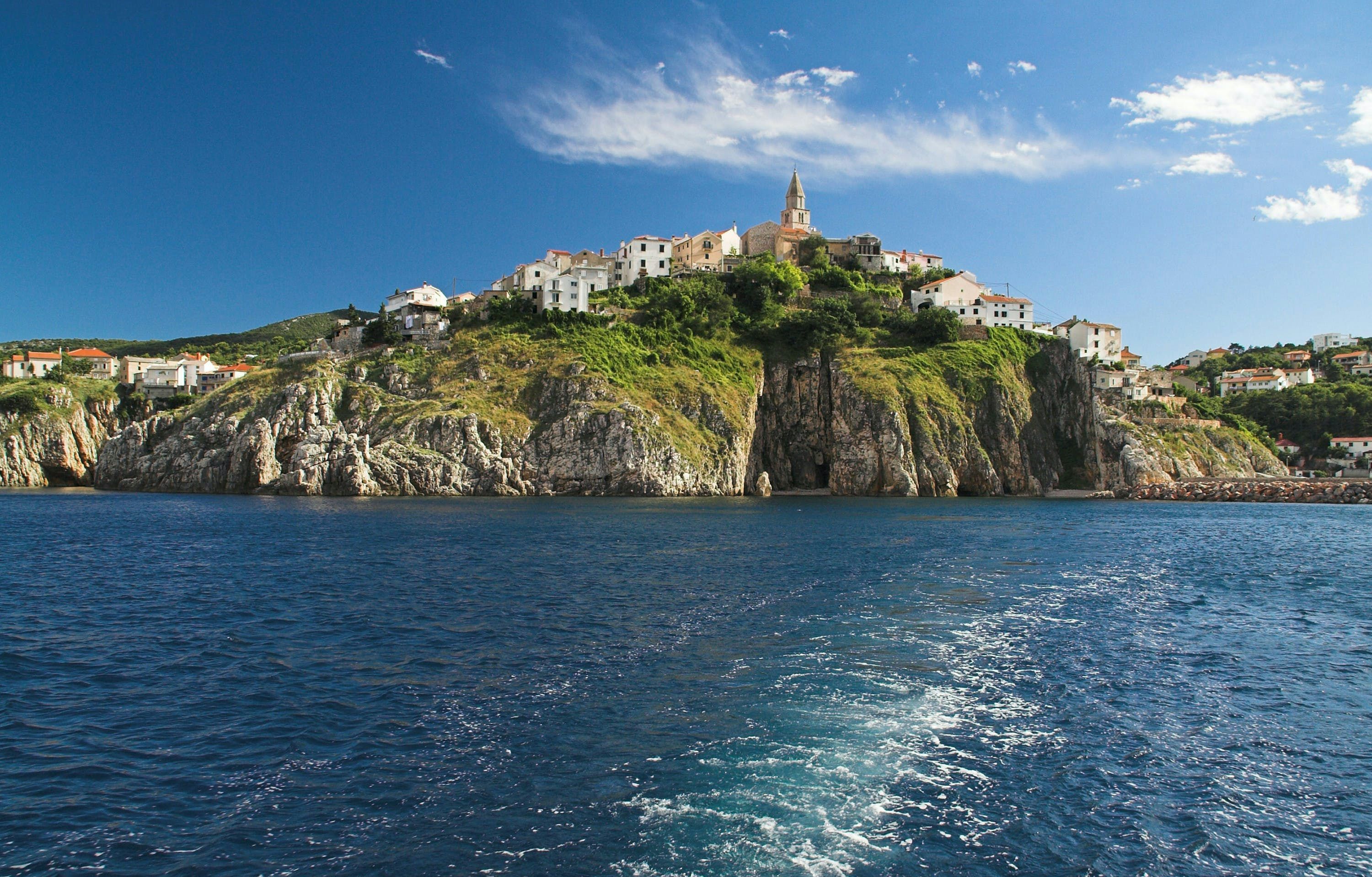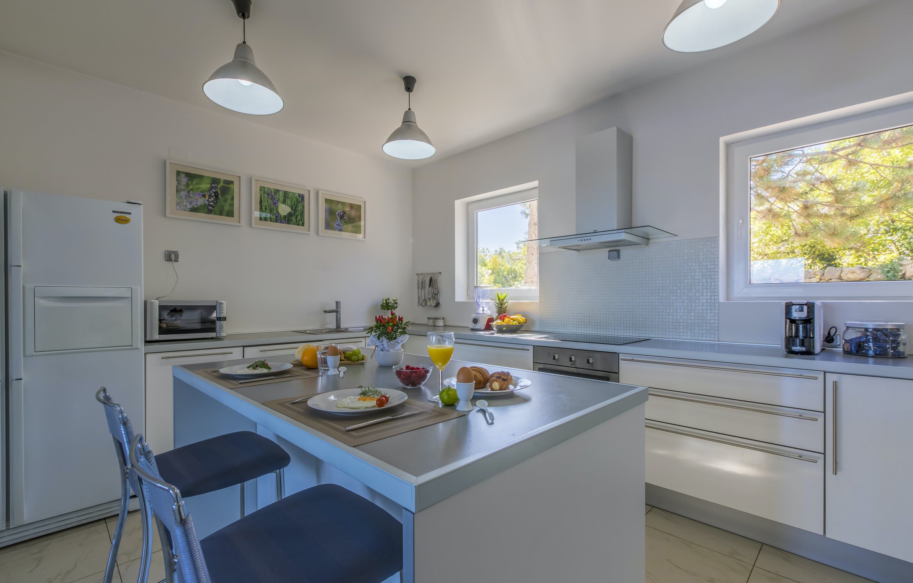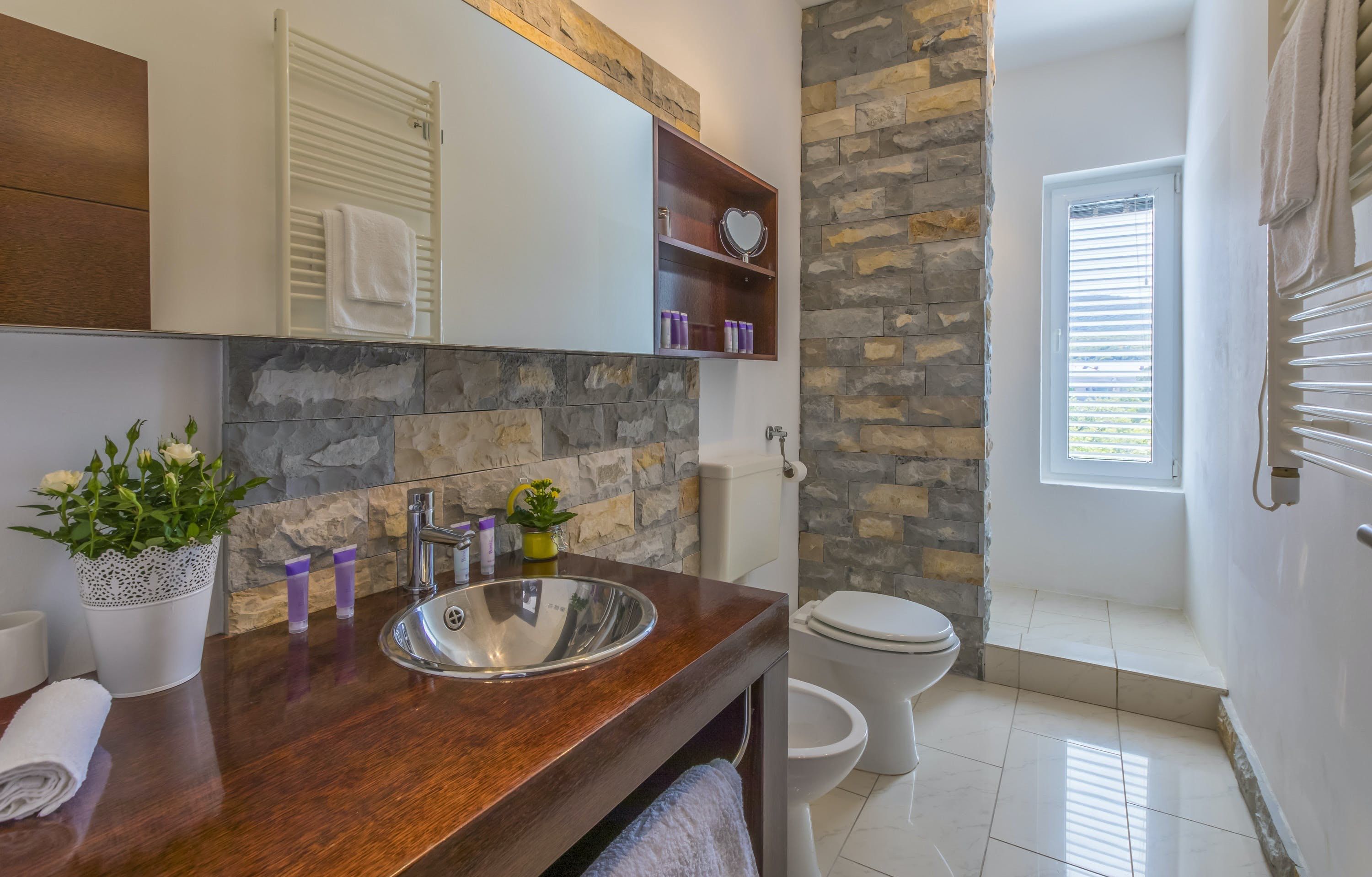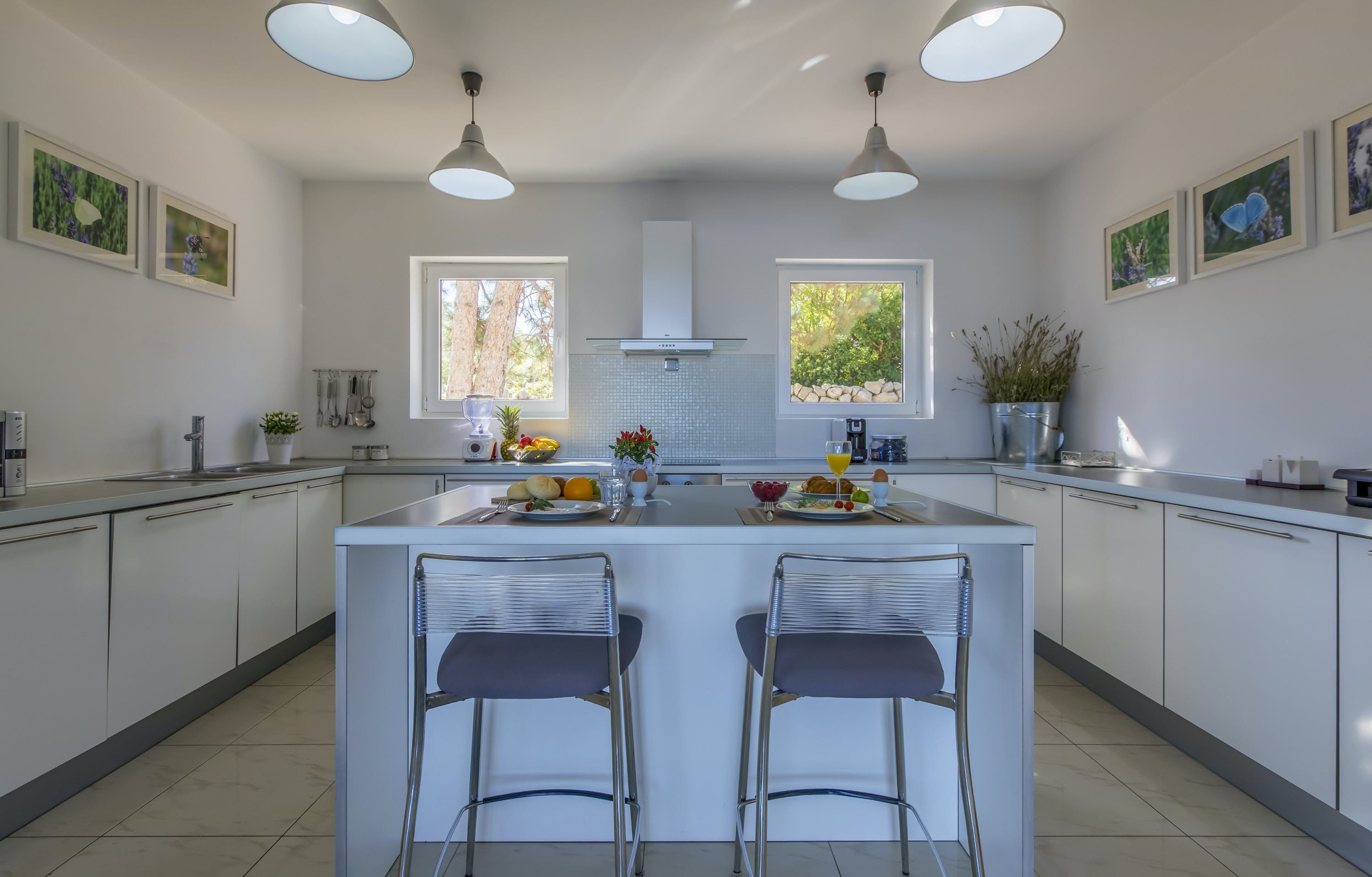 This luxury villa is situated in a picturesque town on the east coast of the island of Krk. It boasts a stunning panoramic view of the surrounding hills, vineyards, and the Adriatic Sea. The spacious two-story villa offers five bedrooms, all with private LCD TVs and air conditioning. A highlight is the main bedroom on the second floor, which leads to a sun deck with a Jacuzzi and sauna. The villa's wooden terrace features a large heated pool surrounded by palm trees and loungers, as well as a covered outdoor seating area with a barbecue. Guests can also enjoy their own tennis court with equipment provided. The beach is just 300 meters away, while the town offers beautiful views of Kvarner Bay and a mix of ancient history and modern amenities.