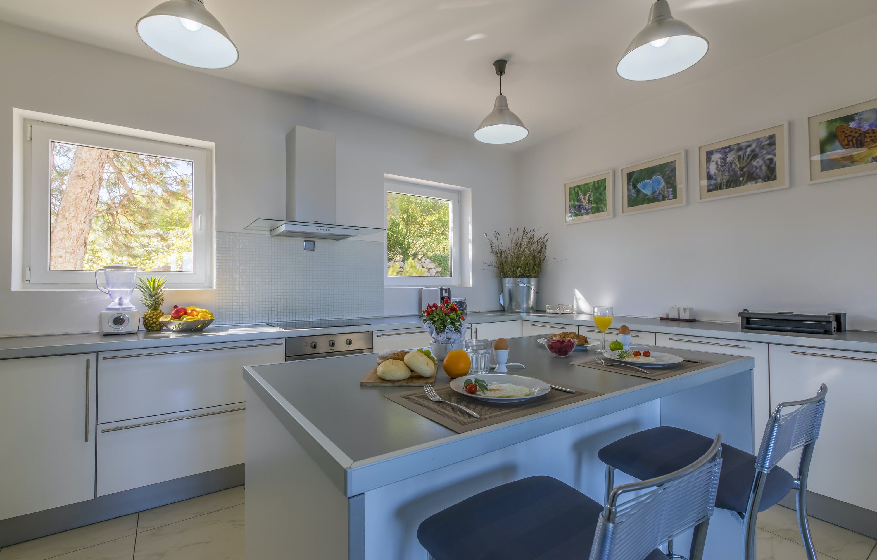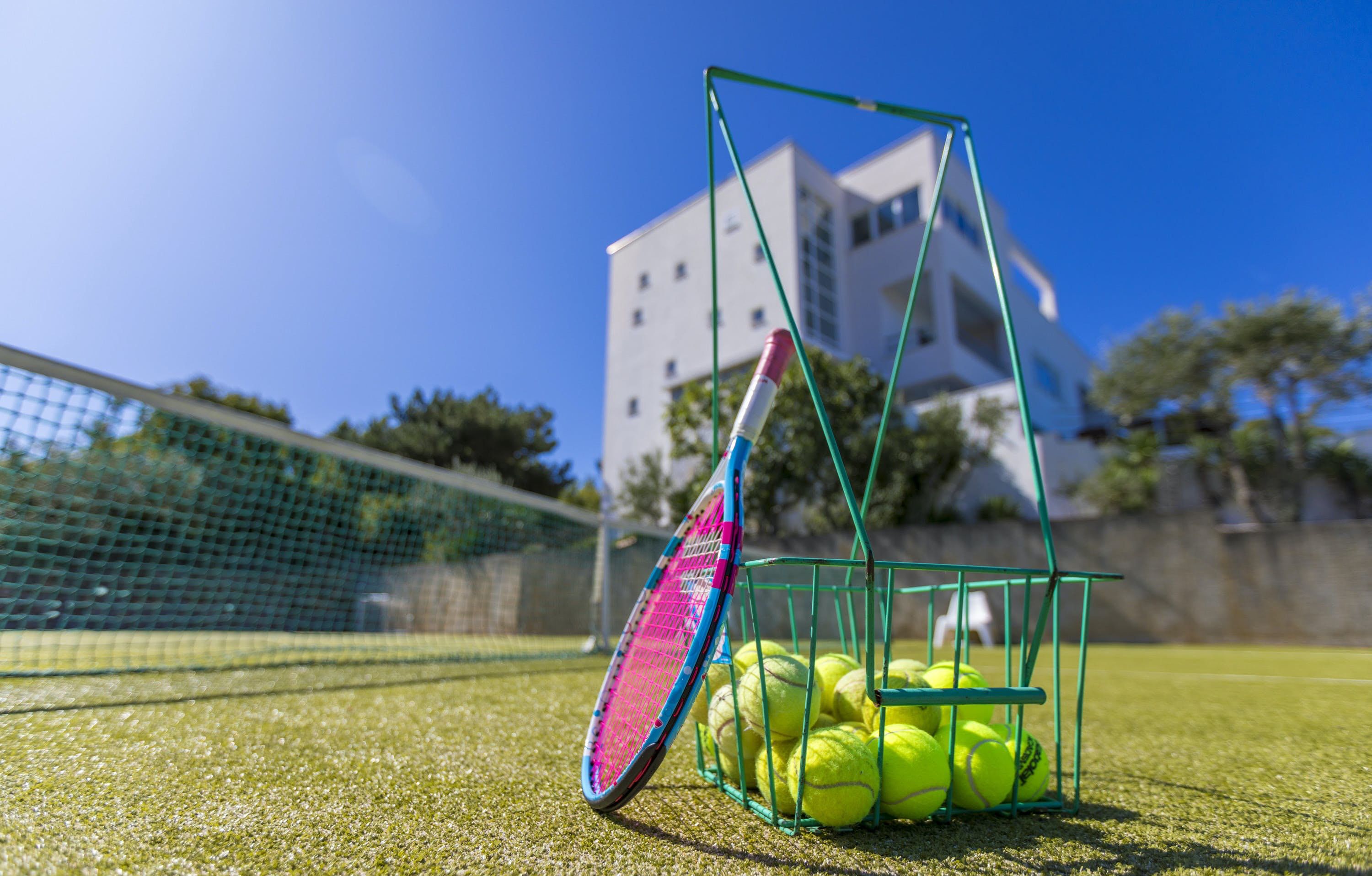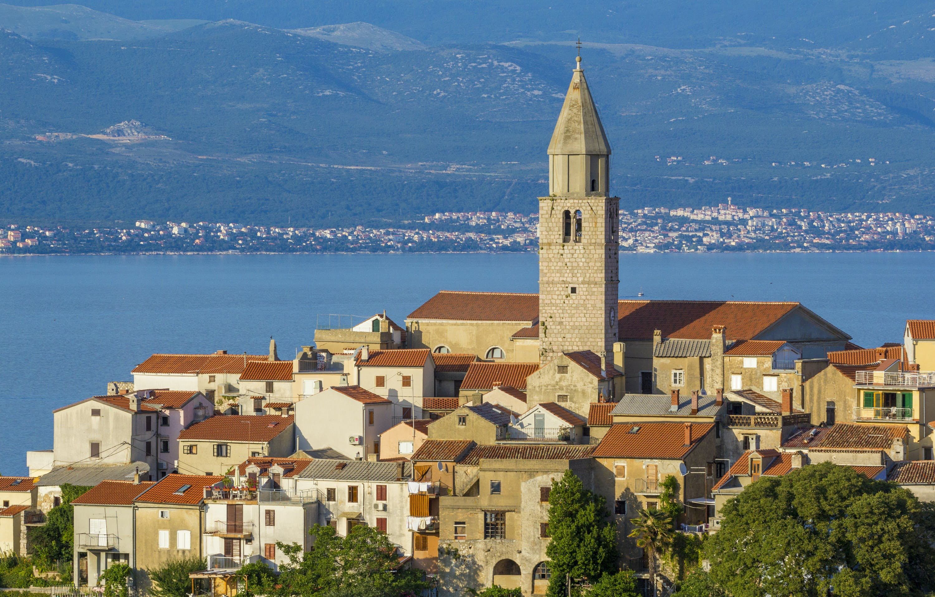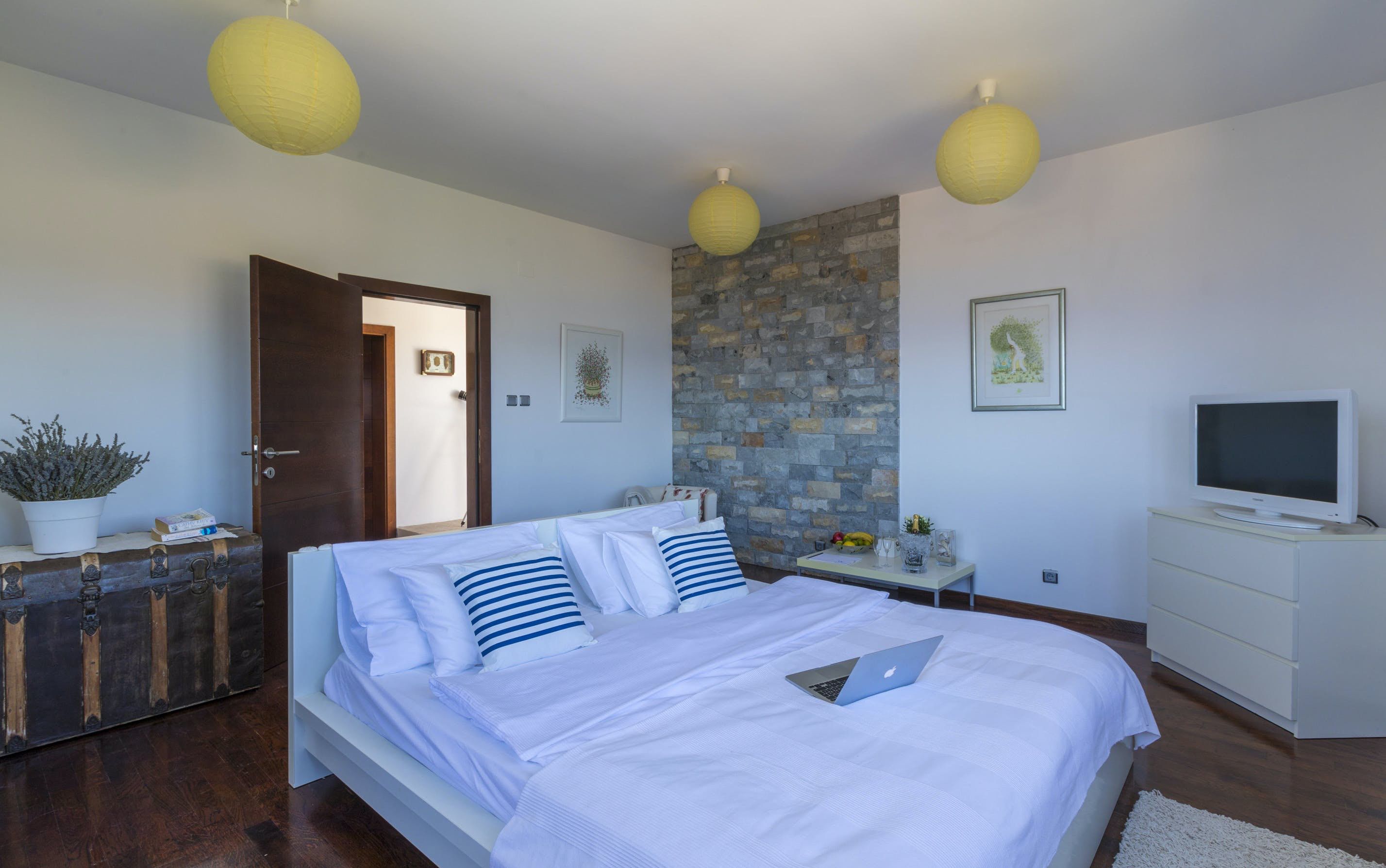 This luxury villa is situated in a picturesque town on the east coast of the island of Krk. It boasts a stunning panoramic view of the surrounding hills, vineyards, and the Adriatic Sea. The spacious two-story villa offers five bedrooms, all with private LCD TVs and air conditioning. A highlight is the main bedroom on the second floor, which leads to a sun deck with a Jacuzzi and sauna. The villa's wooden terrace features a large heated pool surrounded by palm trees and loungers, as well as a covered outdoor seating area with a barbecue. Guests can also enjoy their own tennis court with equipment provided. The beach is just 300 meters away, while the town offers beautiful views of Kvarner Bay and a mix of ancient history and modern amenities.