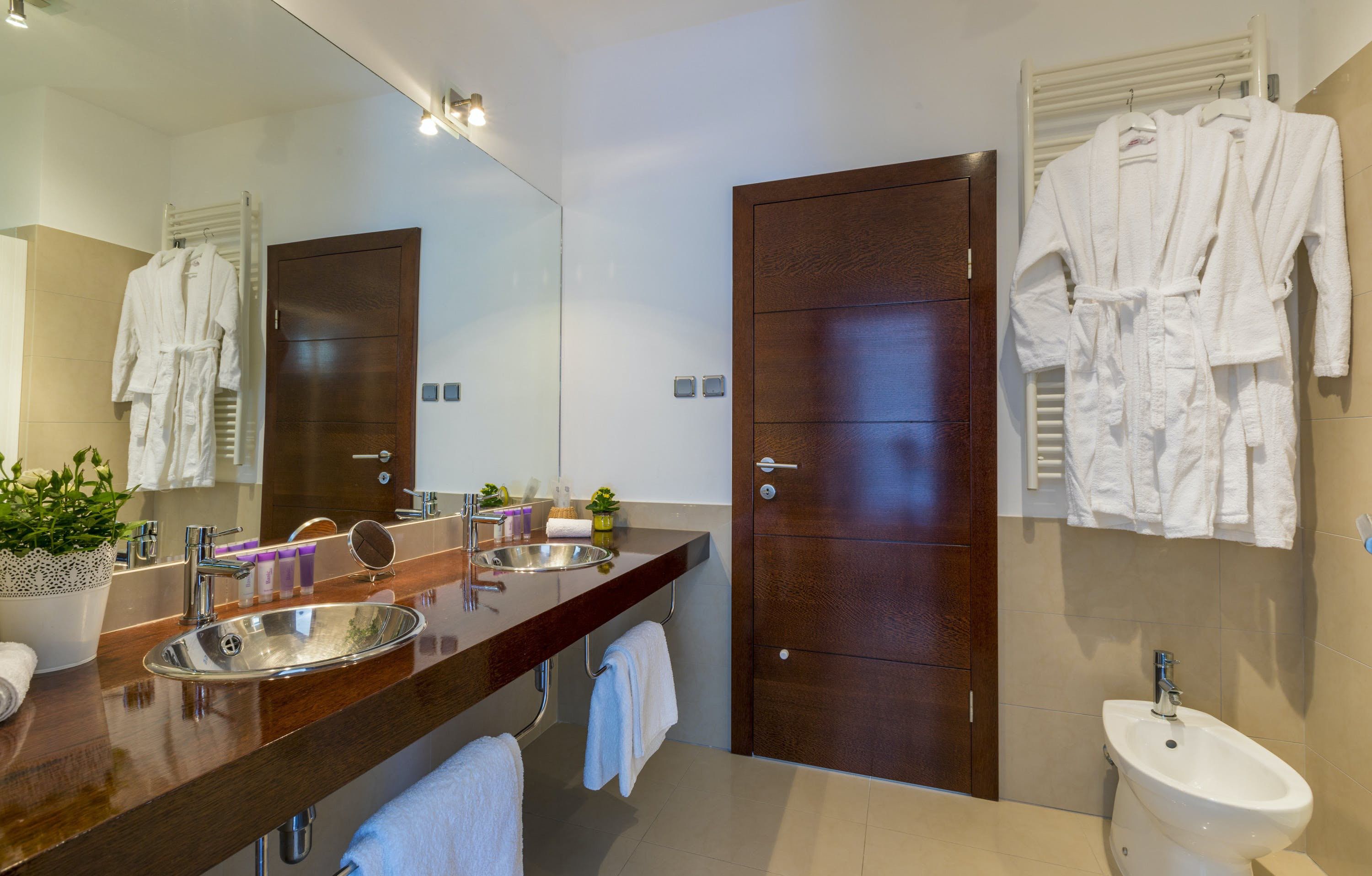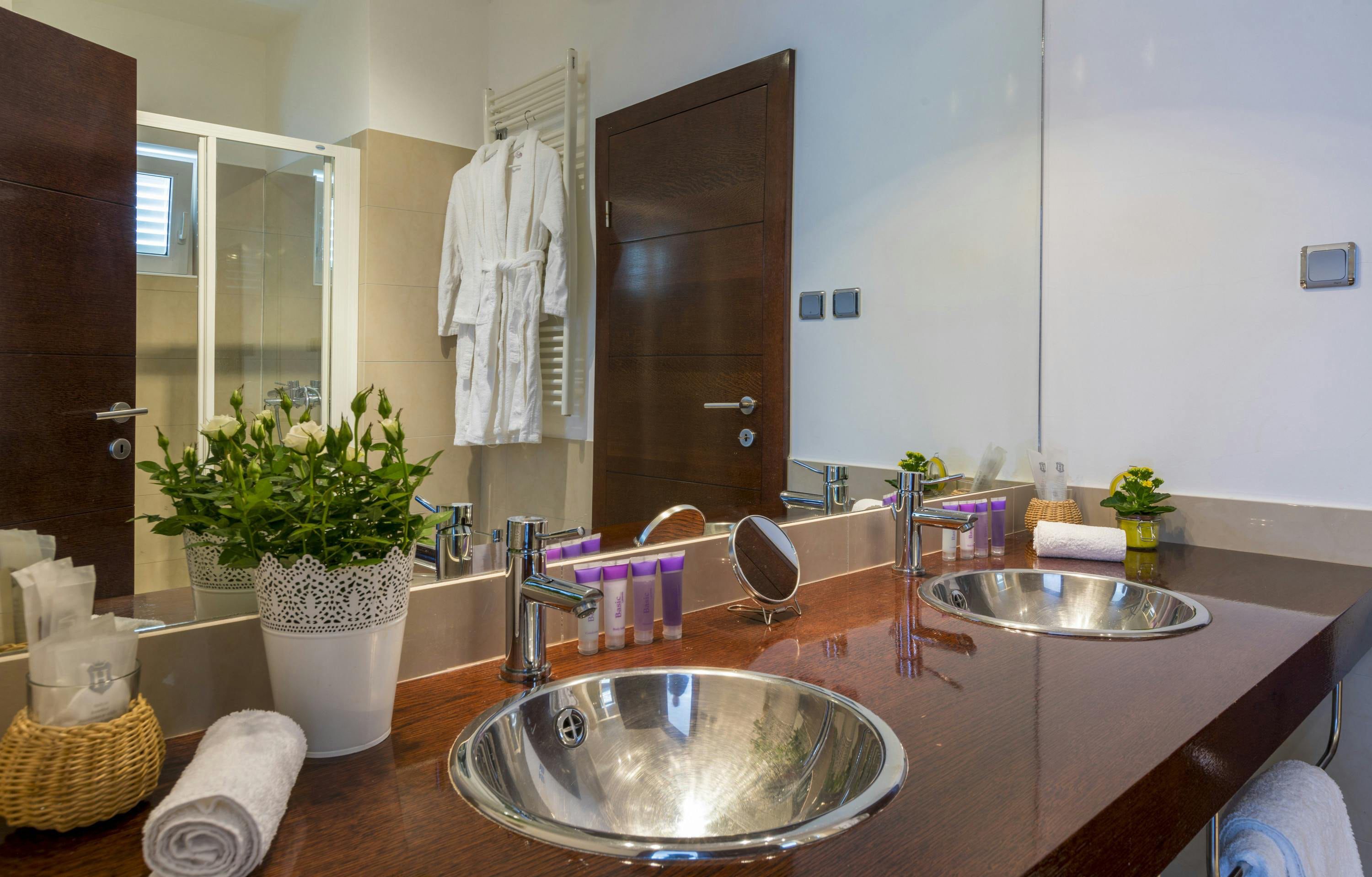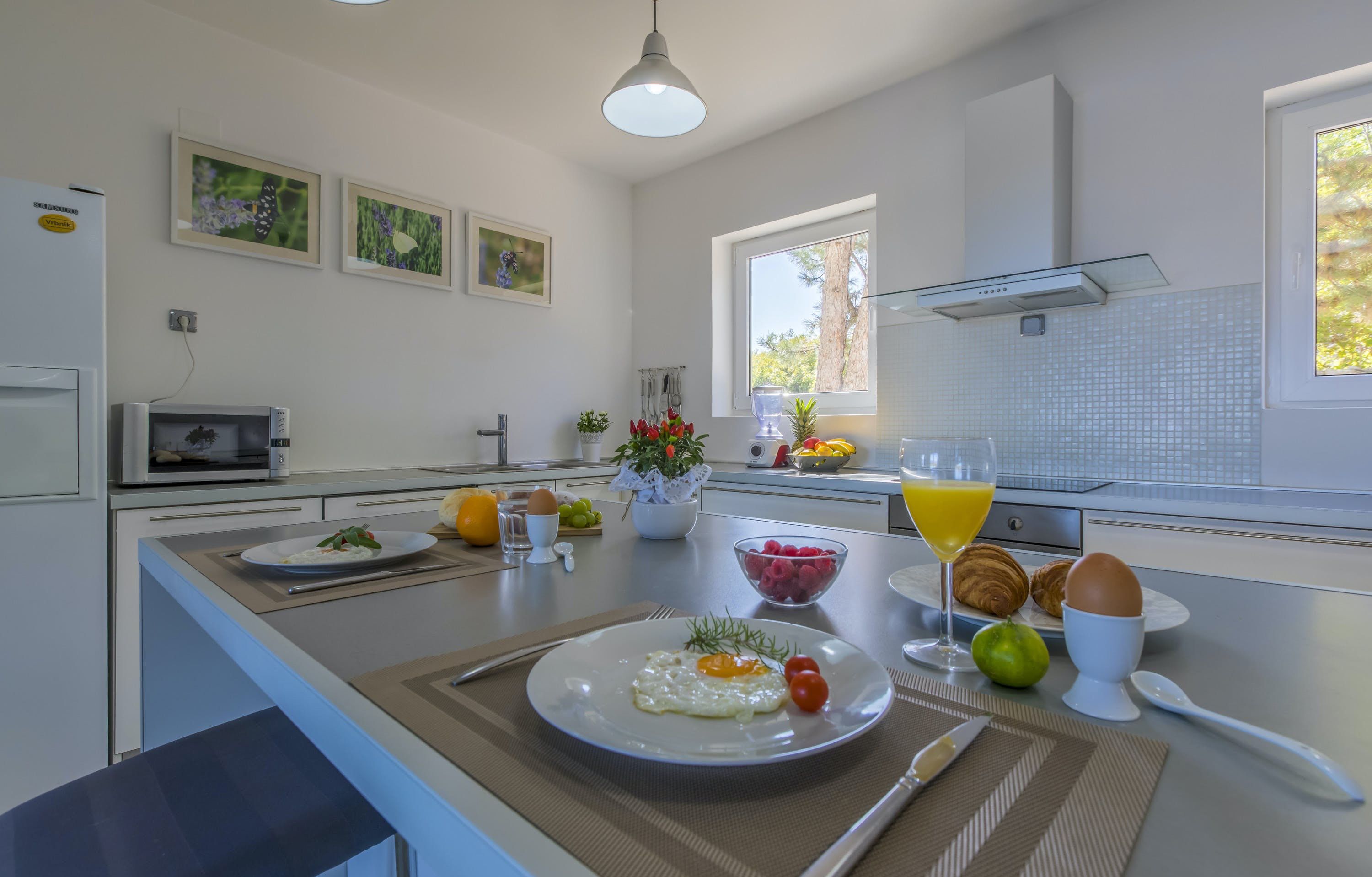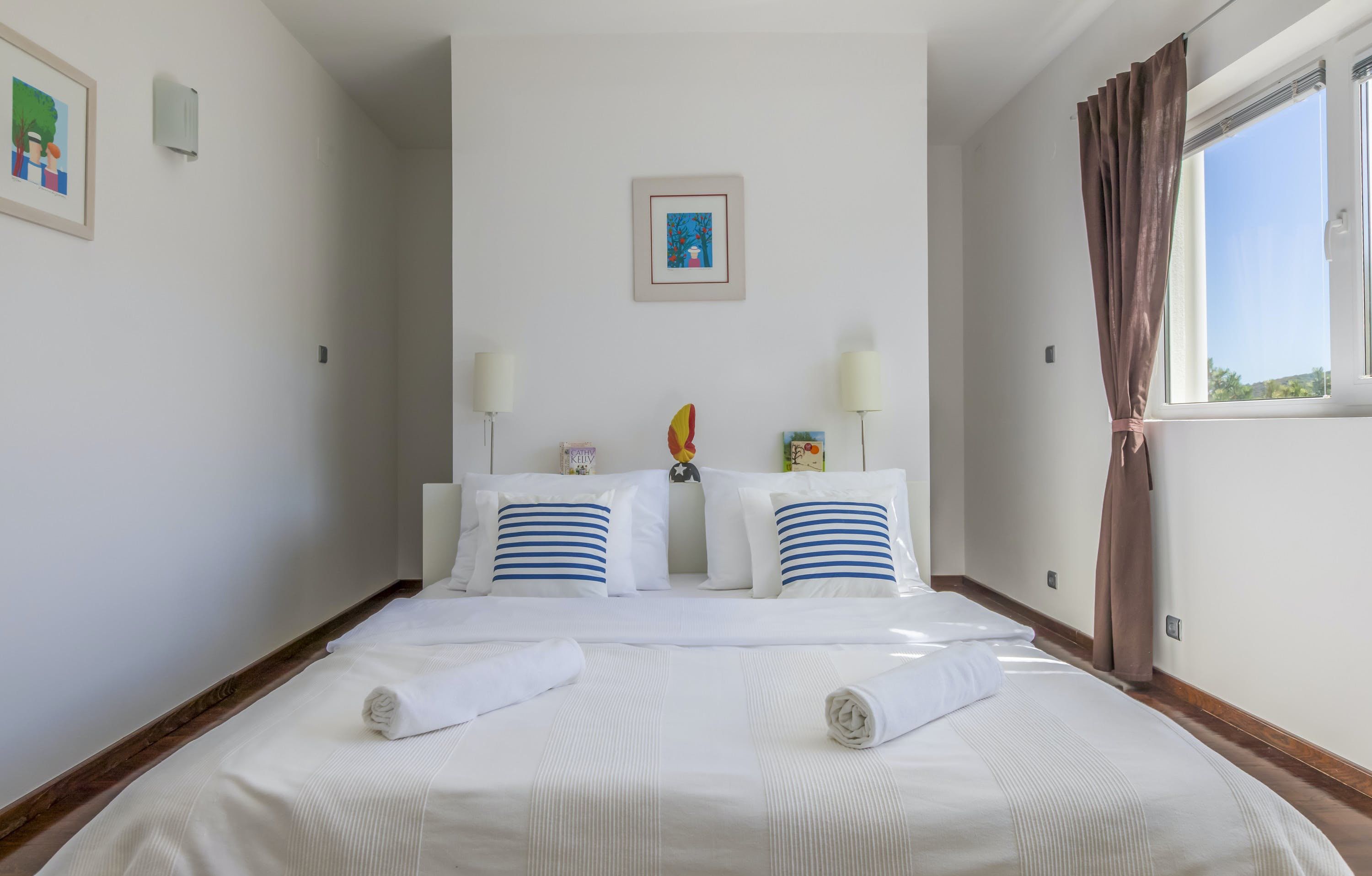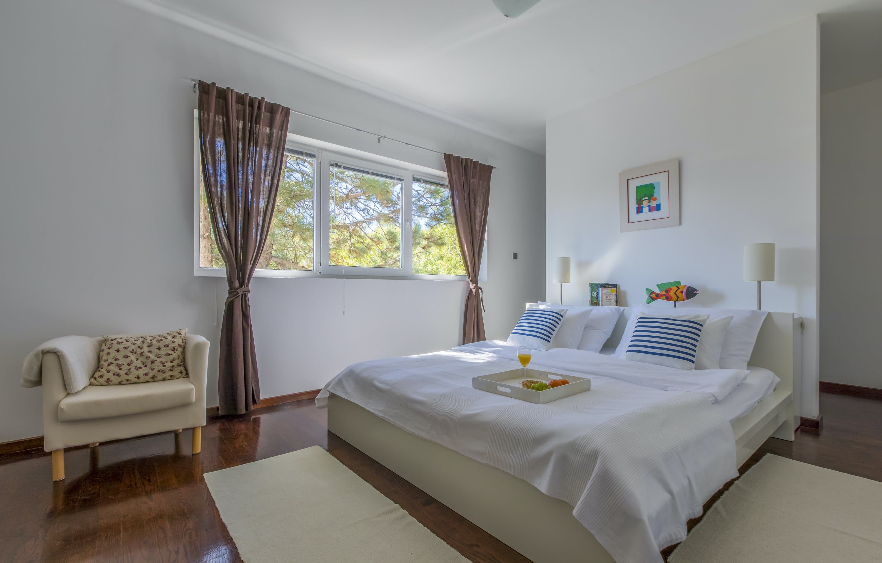 This luxury villa is situated in a picturesque town on the east coast of the island of Krk. It boasts a stunning panoramic view of the surrounding hills, vineyards, and the Adriatic Sea. The spacious two-story villa offers five bedrooms, all with private LCD TVs and air conditioning. A highlight is the main bedroom on the second floor, which leads to a sun deck with a Jacuzzi and sauna. The villa's wooden terrace features a large heated pool surrounded by palm trees and loungers, as well as a covered outdoor seating area with a barbecue. Guests can also enjoy their own tennis court with equipment provided. The beach is just 300 meters away, while the town offers beautiful views of Kvarner Bay and a mix of ancient history and modern amenities.