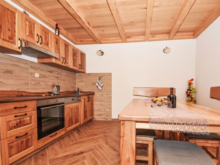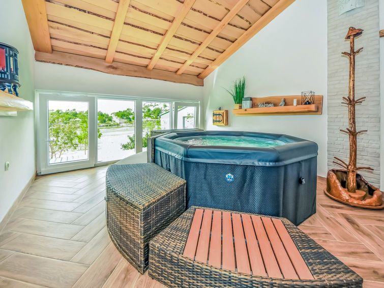 3-room house 120 m2 on 2 levels. 1 room with 1 french bed (180 cm, length 200 cm). Open kitchen (oven, 4 ceramic glass hob hotplates, freezer, electric coffee machine) with air conditioning. Exit to the terrace. Bath/bidet/WC. Wood heating. Upper floor: (spiral staircase) with sloping ceilings, 1 room with 1 french bed (160 cm, length 200 cm).