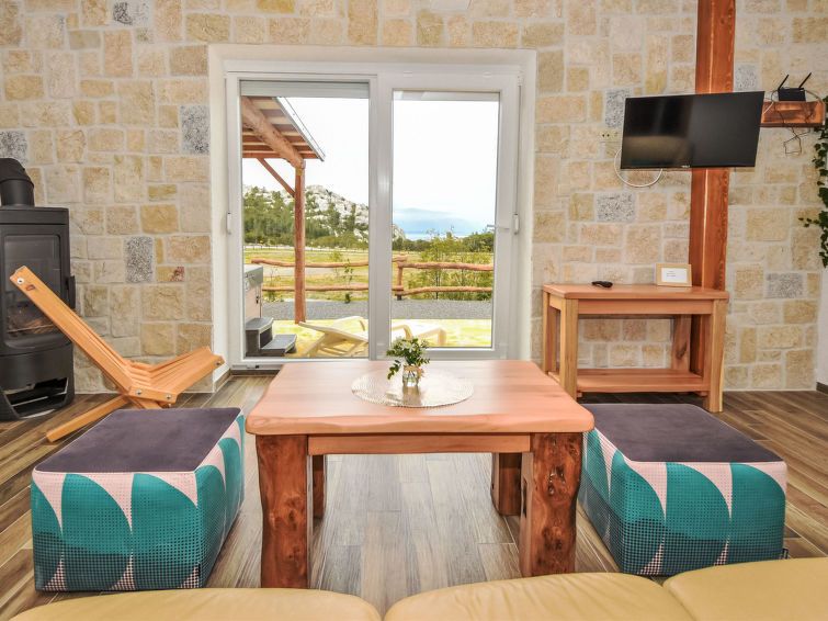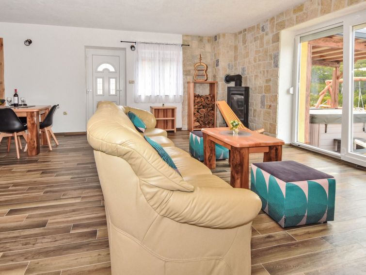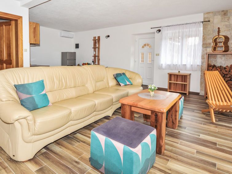 3-room semi-detached house 100 m2. 1 room with 1 french bed (180 cm, length 200 cm). 1 room with 2 beds (90 cm, length 200 cm). Open kitchen (oven, 4 ceramic glass hob hotplates, freezer, electric coffee machine) with air conditioning. Exit to the terrace. Bath/bidet/WC. Wood heating.