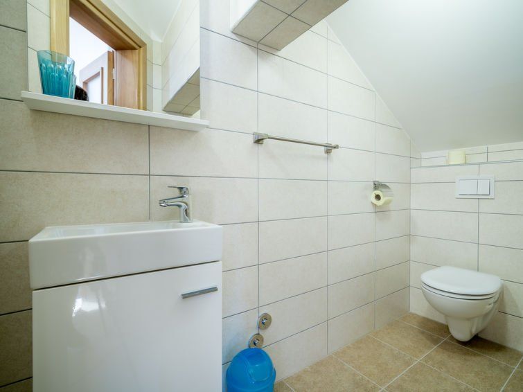 2-room apartment 44 m2 on 1st floor. Living/dining room with 1 double sofabed (150 cm, length 200 cm), satellite TV (flat screen). 1 room with sloping ceilings, ceiling height 113 - 270 cm with 1 french bed (160 cm, length 200 cm). Open kitchen (oven, 2 ceramic glass hob hotplates, freezer).