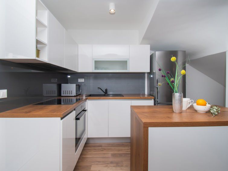 4-room semi-detached house 150 m2 on 2 levels. Living/dining room 55 m2 with satellite TV (flat screen), air conditioning. Exit to the terrace. 1 room with 1 french bed (160 cm, length 200 cm), air conditioning. Open kitchen (oven, dishwasher, 4 ceramic glass hob hotplates, microwave, freezer, electric coffee machine).