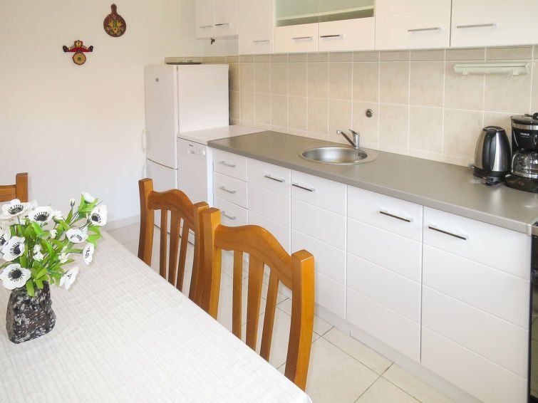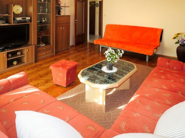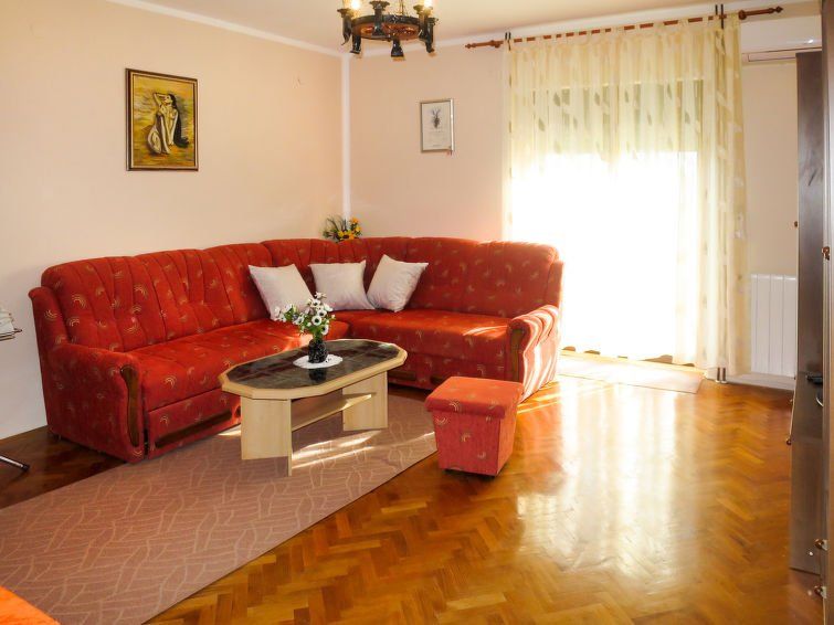 "Stjepan", 4-room apartment 90 m2 on 1st floor. Living room with 1 sofabed, satellite TV and air conditioning. Exit to the balcony. 1 room with 1 double bed (2 x 90 cm, length 200 cm), air conditioning. Exit to the balcony. 2 rooms, each room with 2 beds (90 cm, length 200 cm). Kitchen (2 hot plates, oven, dishwasher, 2 gas rings, toaster, kettle, freezer, electric coffee machine) with dining table.