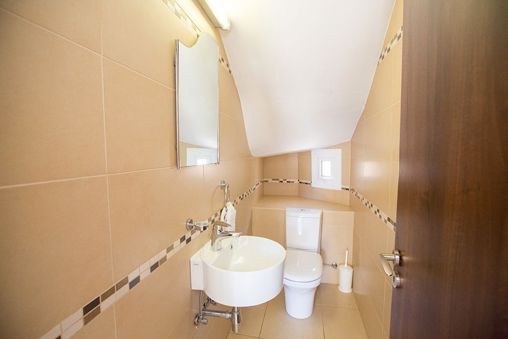 As you enter the villa, you will find the modern and spacious open-plan living room, kitchen and dining area. The kitchen is fully equipped with all appliances needed for your comfortable self-catering stay, the dining area seats 6 persons, and the living room has a comfortable seating area with widescreen and satellite TV (Full UK channels) and patio doors leading to the garden and pool area There is also a WC on this floor
