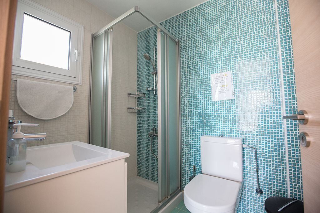 As you walk into the villa, you will find the modern and well-kept open-plan living room, dining area and kitchen. The living room features a comfortable seating area with widescreen and Satellite TV (Full UK satellite and Free Video on Demand). The dining area has a table and chairs to seat 6 persons and the kitchen is fully equipped with every appliance that you require for your self-catering holiday. There is also a WC on this floor.