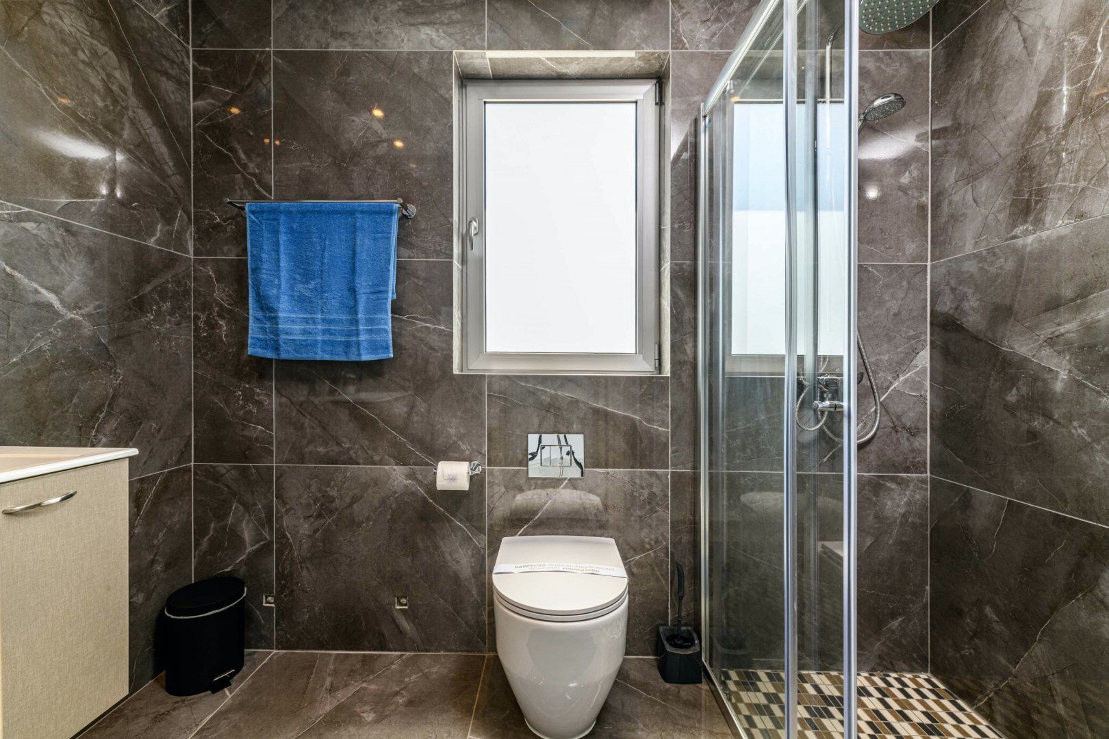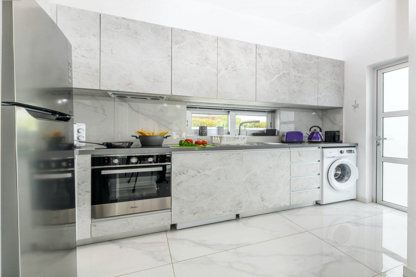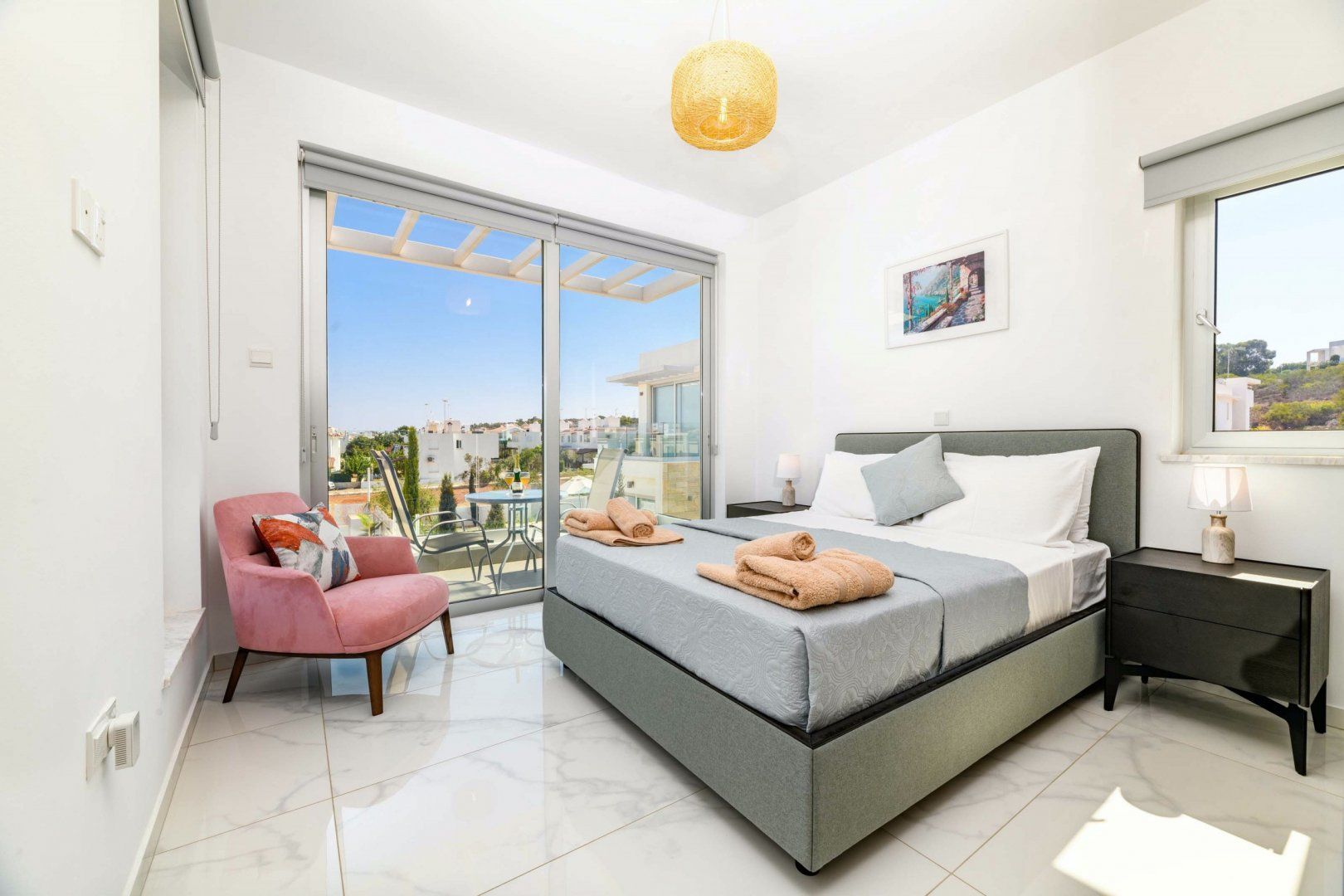 Designed in marble and stone, this modern home maintains its Mediterranean character. We love how every bedroom has immediate outdoor access, so you can enjoy the sunshine from the moment you roll out of bed. Just imagine rustling up a tasty Cypriot breakfast of mpoukkoma in this grey-toned kitchen. After an all-day adventure, perhaps you'll want to relax outside by the plunge pool. This private patio is the perfect place for sipping traditional ouzo and snacking on mezedakia. When the day draws to an end, head up to the roof terrace for an unforgettable supper with your family.