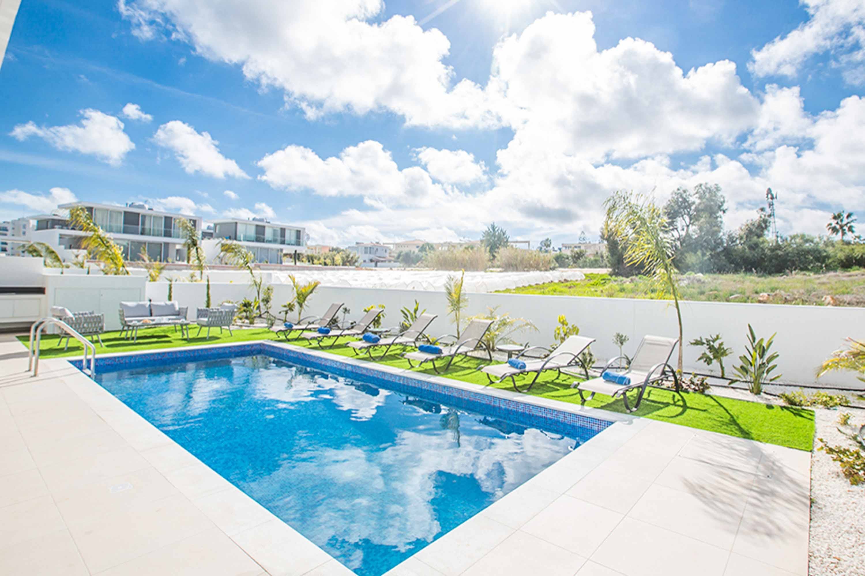 This three-bedroom Cypriot home has lots to recommend it – boasting a terrace, private pool, barbecue, and alfresco dining area. While the interior design is immaculate, it isn’t what you’d call unique – though the floor-to-ceiling sliding glass doors in the open-plan living space are a real plus point. Location-wise it’s hard to beat with Protaras’s beaches, boutiques, bars and restaurants only a 5-minute walk away. Vrissiana Beach, which offers a variety of family-friendly activities and a selection of water sports, is also within easy reach.