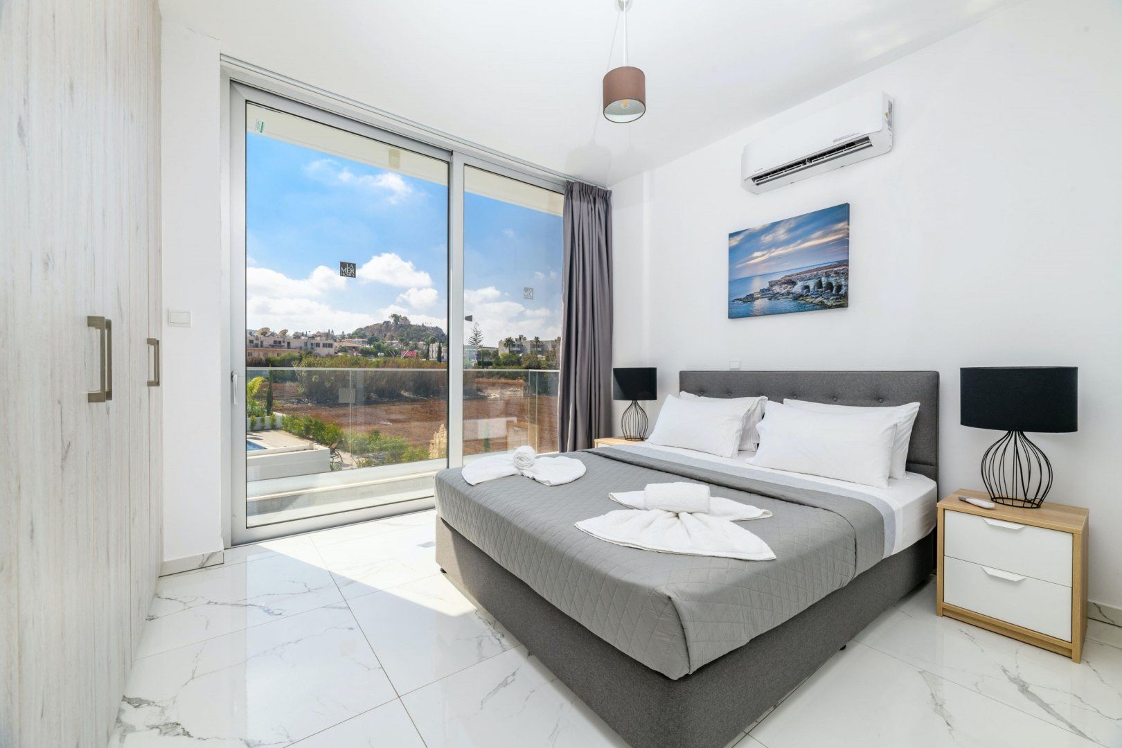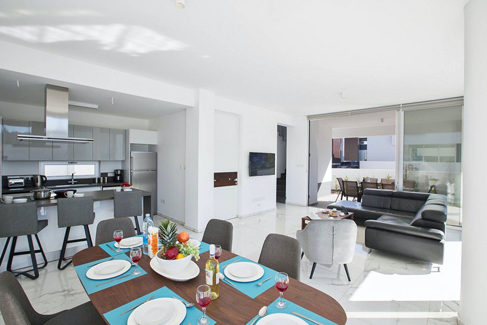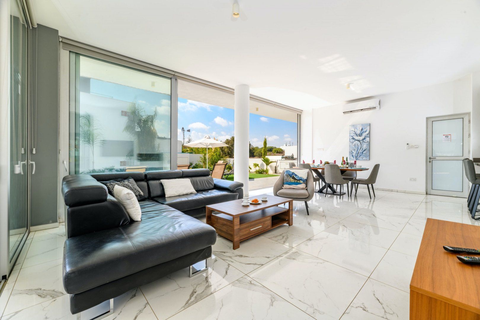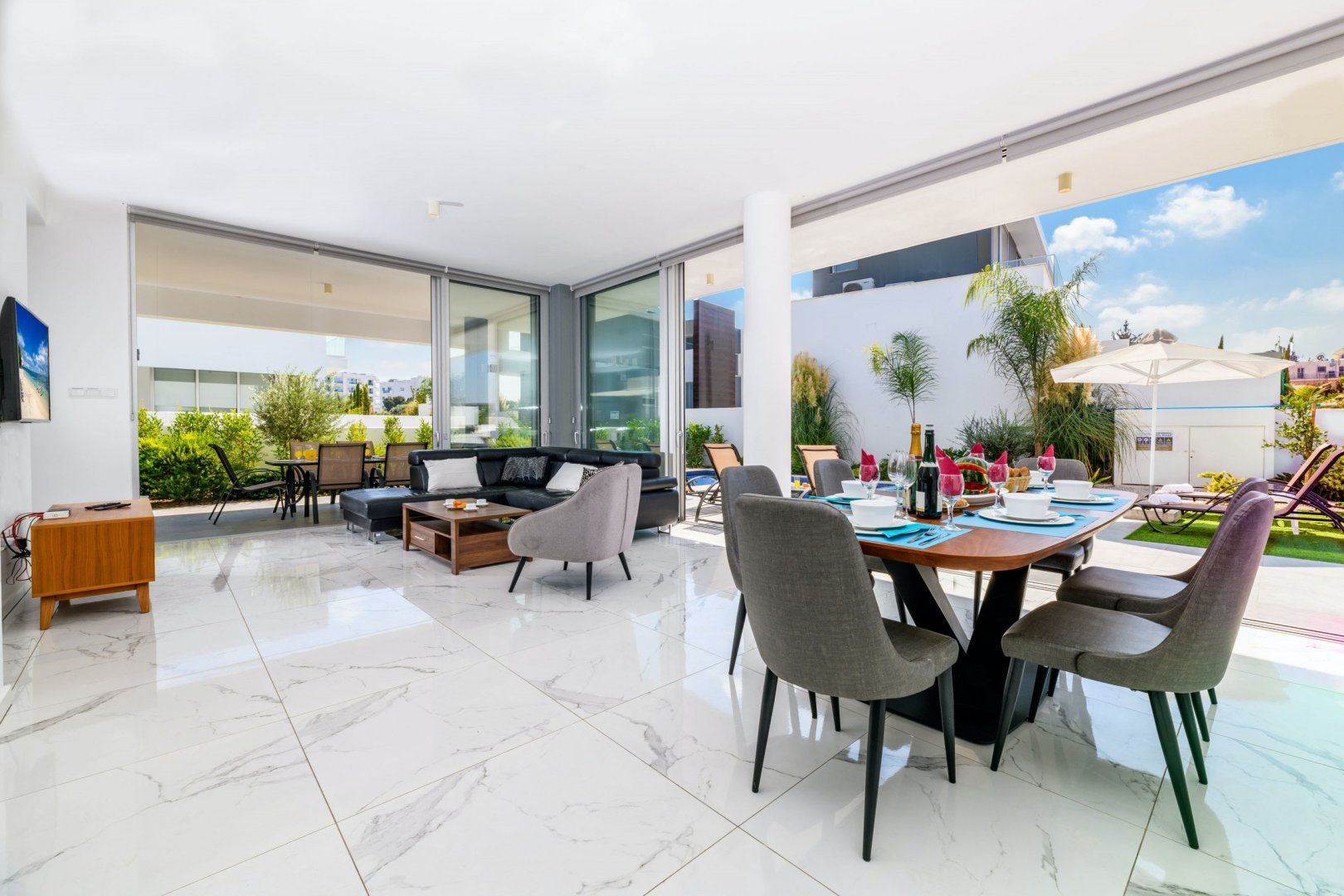 With plenty of sun-drenched outdoor space to call your own here, it's more than likely, you'll wish to spend much of your time outside soaking up the Cypriot sun. However, it's safe to say you'll find the contemporary living space indoors just as enticing. Floor-to-ceiling bi-fold doors invite in a free flow of natural daylight that bounces through the space with good vibes and a summer spirit. Meanwhile, the minimal designs in a white and grey colour scheme encourage guests to relax in a fuss-free environment far away from the stresses of daily life.